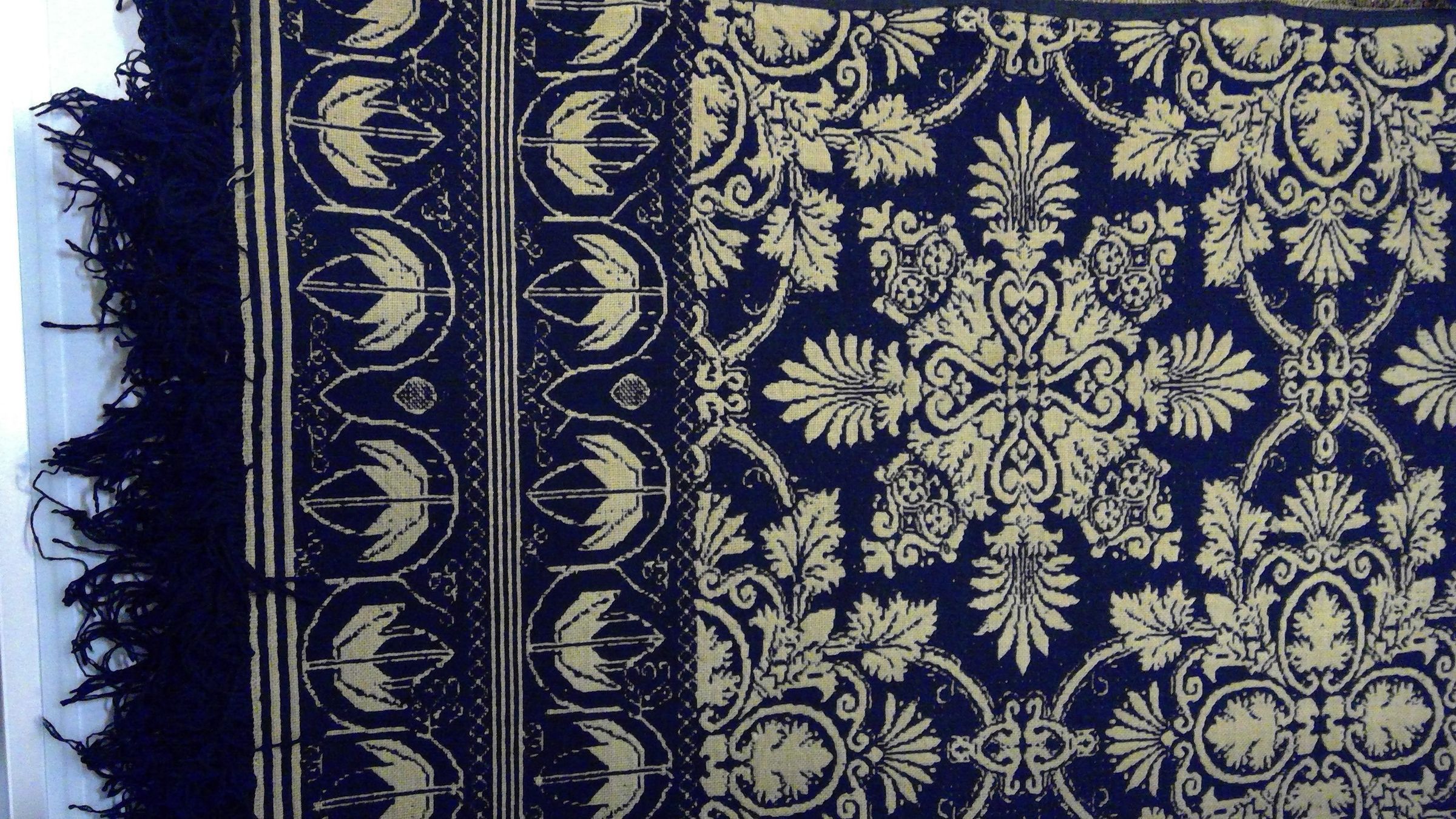 Navy blue on tan background, decorative foliage patterns, split in two pieces at the seam.Collection