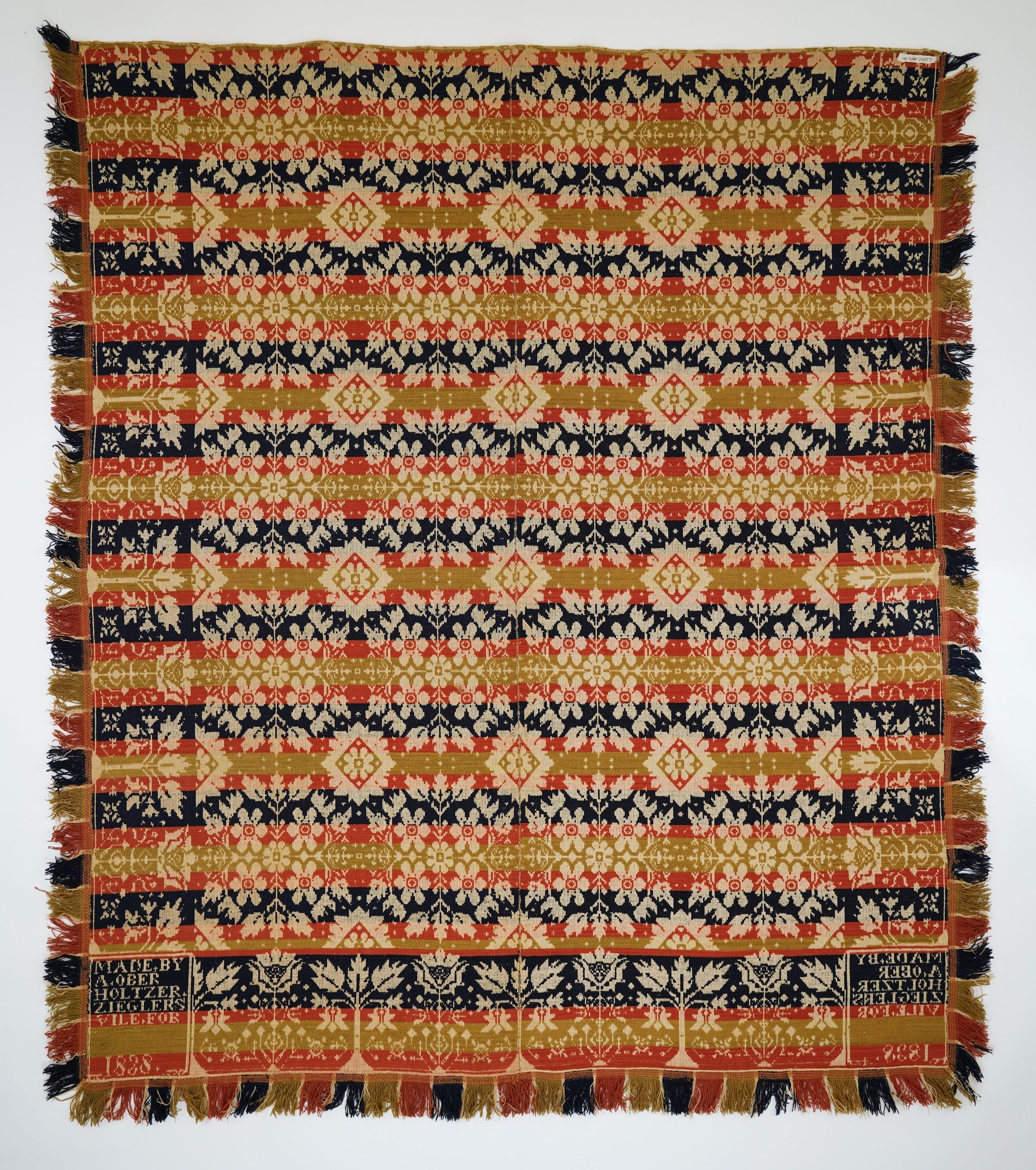 Red, Green, and navy figured Tied Beiderwand coverlet. Applied fringe on three sides. Floral centerfield. Two panels joined by a center seam. Floral Border.Collection