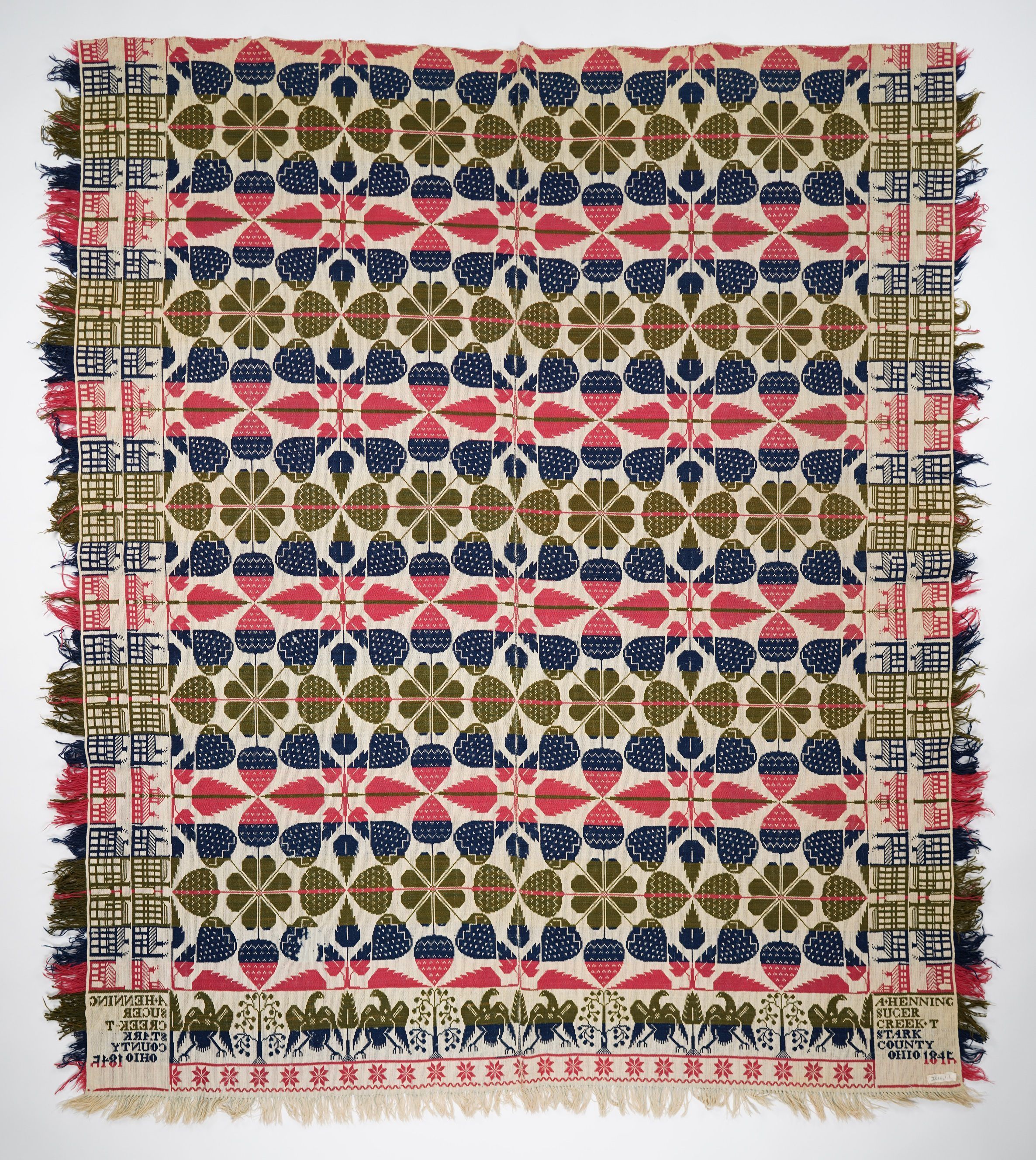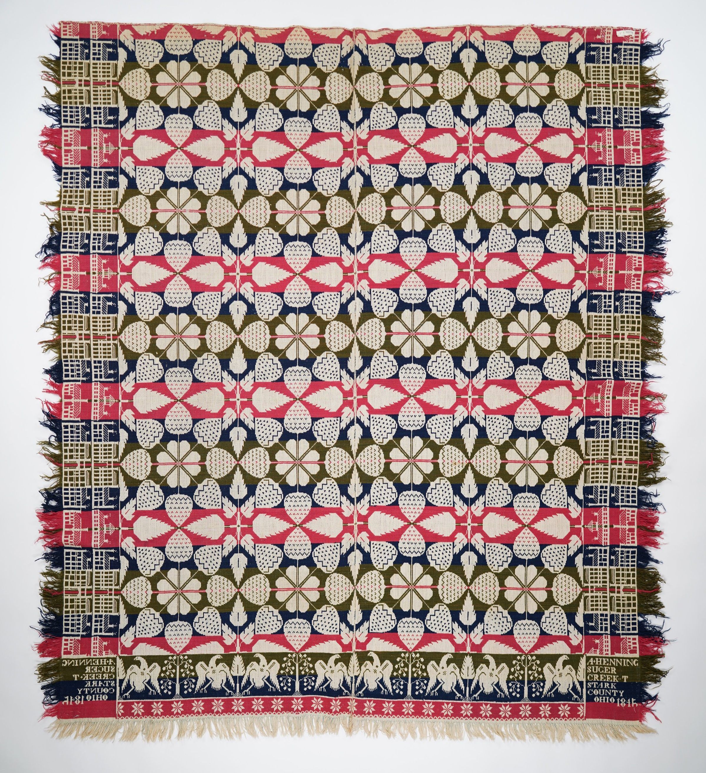 Figured and fancy tied beiderwand coverlet with borders on two sides and self fringe on two sides and applied fringe on bottom. Two panels joined by a center seam.Navy, green, and red wool with undyed cotton. Strawberry floral centerfield pattern; building border two sides; bird border on bottom. Woven by Adam Henning.Collection