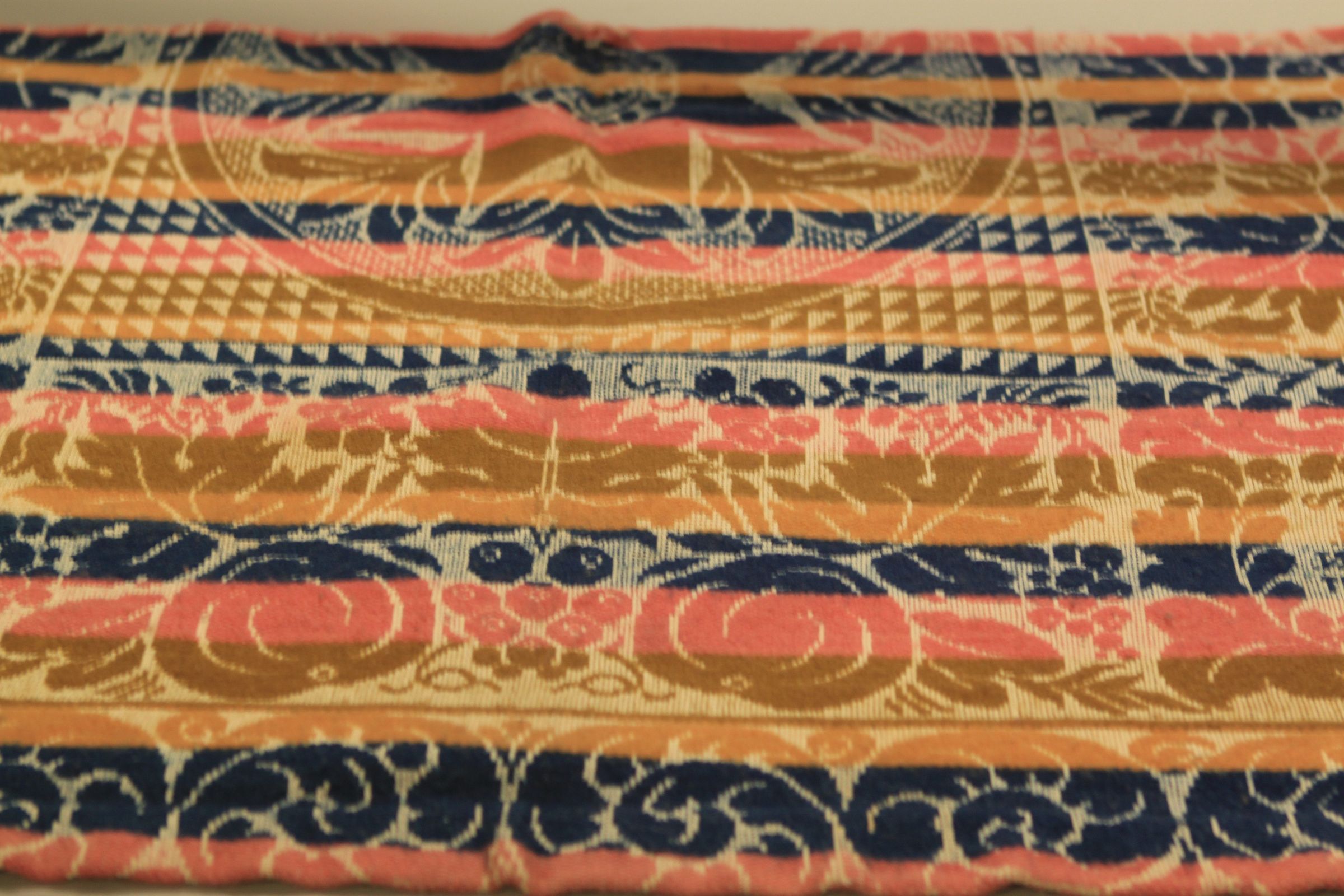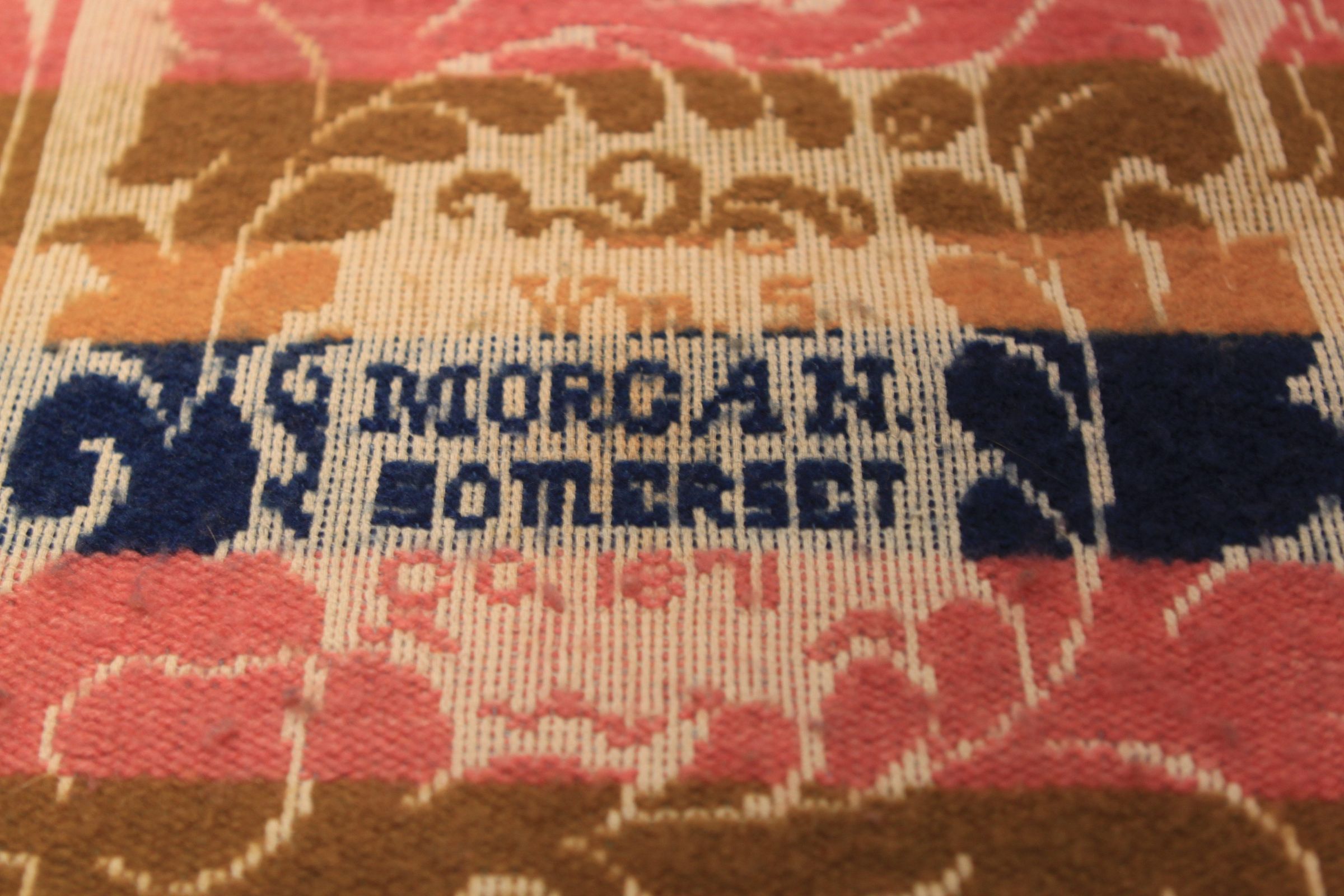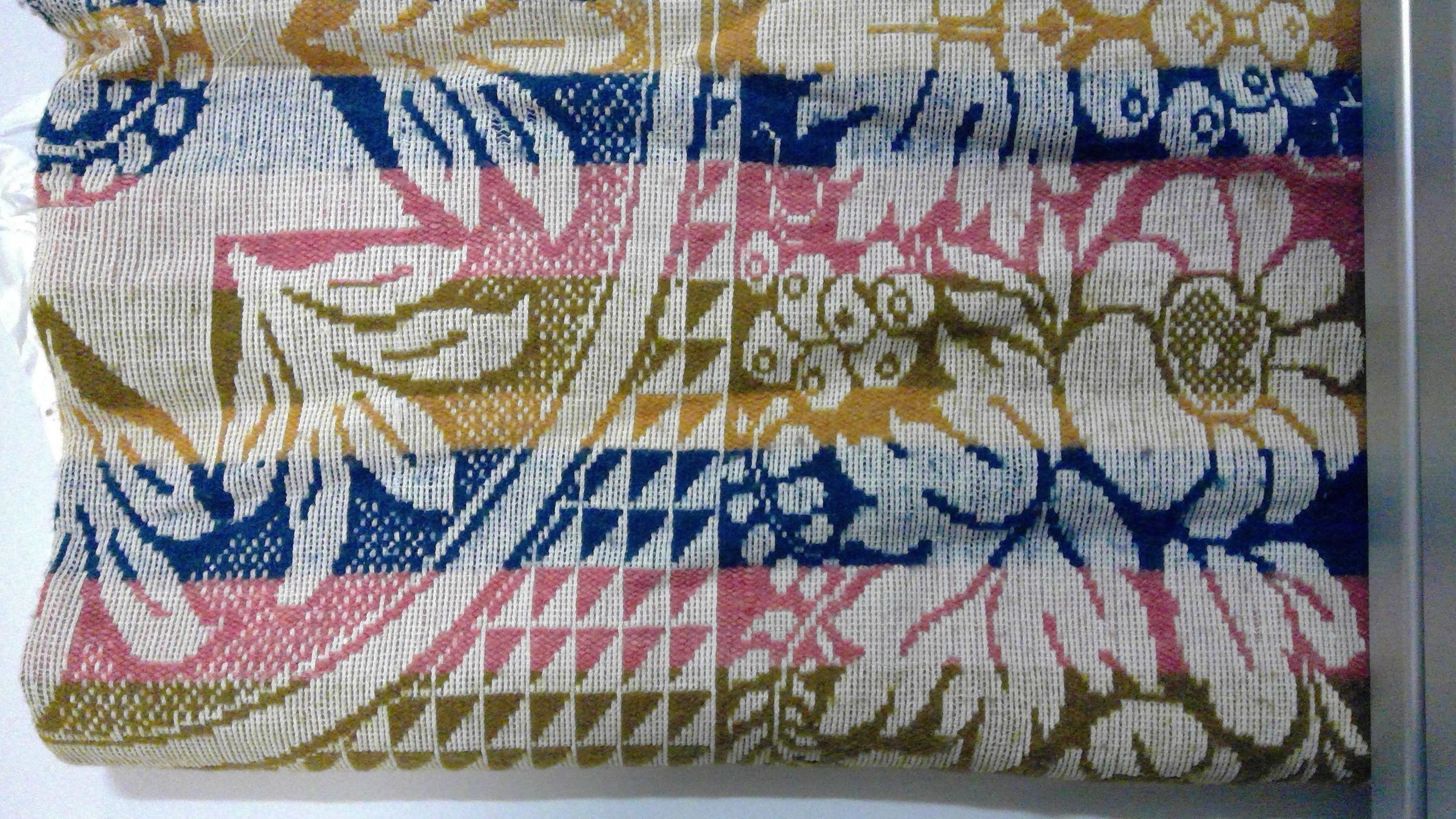 Blue, olive green, pink on natural background. Decorative foliage and oval center with star pattern. Temporarily sewn tear bottom right corner of centerfield.Collection