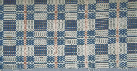 Coverlet, overshot, handwoven of natural cotton and blue and red wool. Has a center seam that is hand sewn and mismatched. Shows wear, some holes and torn spots, some stains. Note pinned to coverlet states "family heirloom- to go with Great Gdma's loom. Coverlet woven by Elizabeth Tennant Price circa 1870. Acq from Ruth Stephens Kelley 1977".