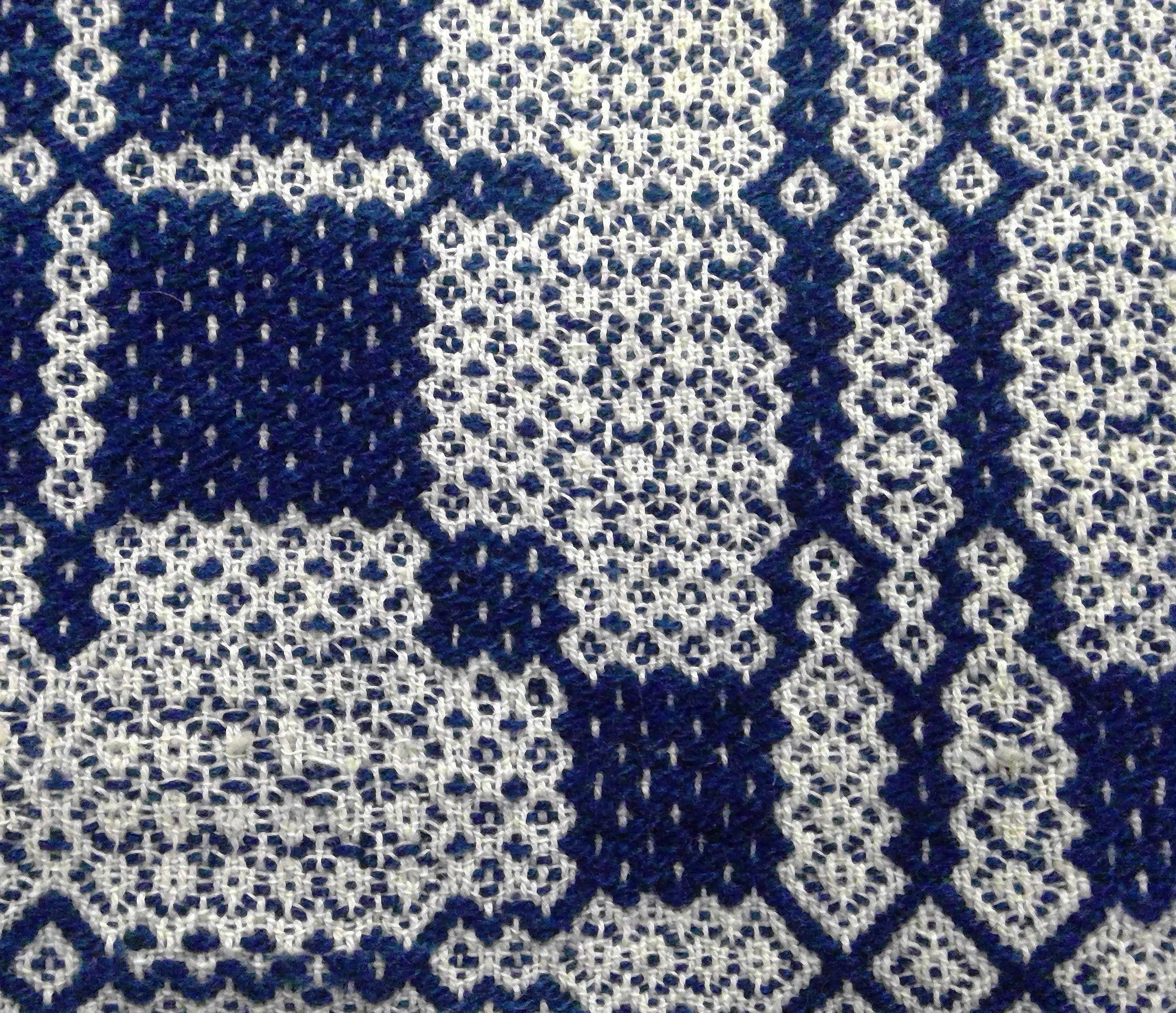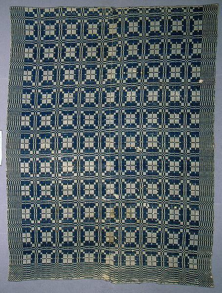 Handwoven coverlet. Supplementary weft. Point twill variation woven with the blue wool, weft cotton used as a tabby. 2 edges hemmed and 2 edges selvedged. Undyed cotton and undyed and blue wool. Two panels joined by a center seam.Collection