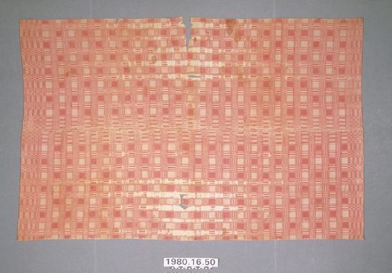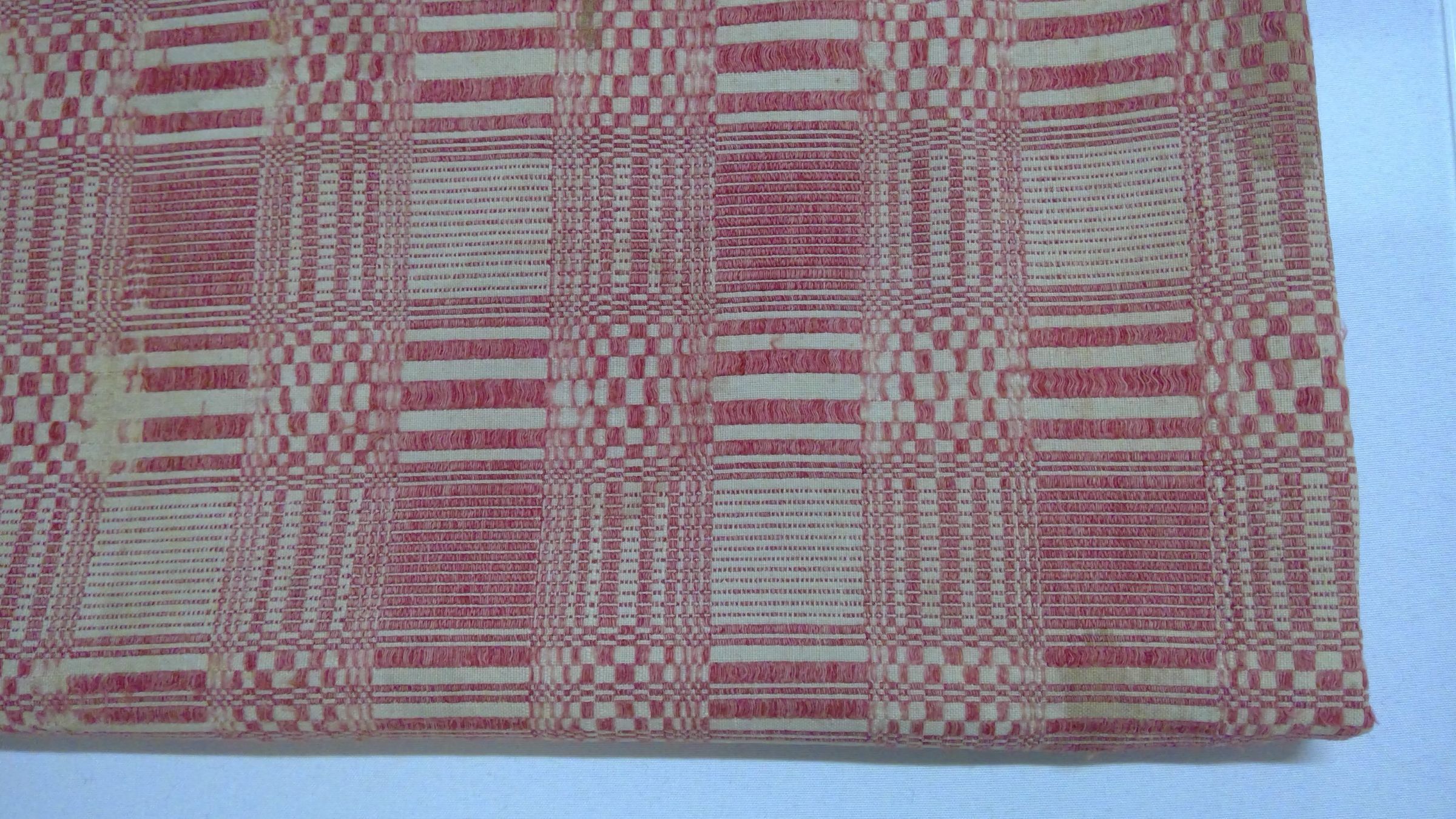 Checked pattern. Once had borders on all sides but the edges have been turned so that the two side borders are in the center (machine stitched). Blocks vary in size. Possibly was a tablecloth. A few purple linen picks were done at the end of one panel; a few picks of red were done as tabby shots by mistake. Repeat: 6.25" x 3"