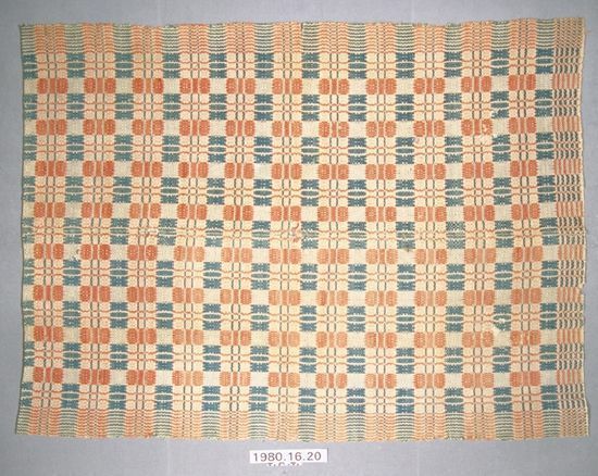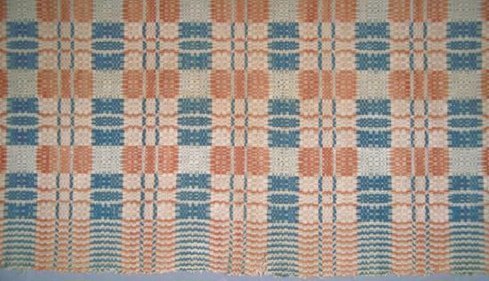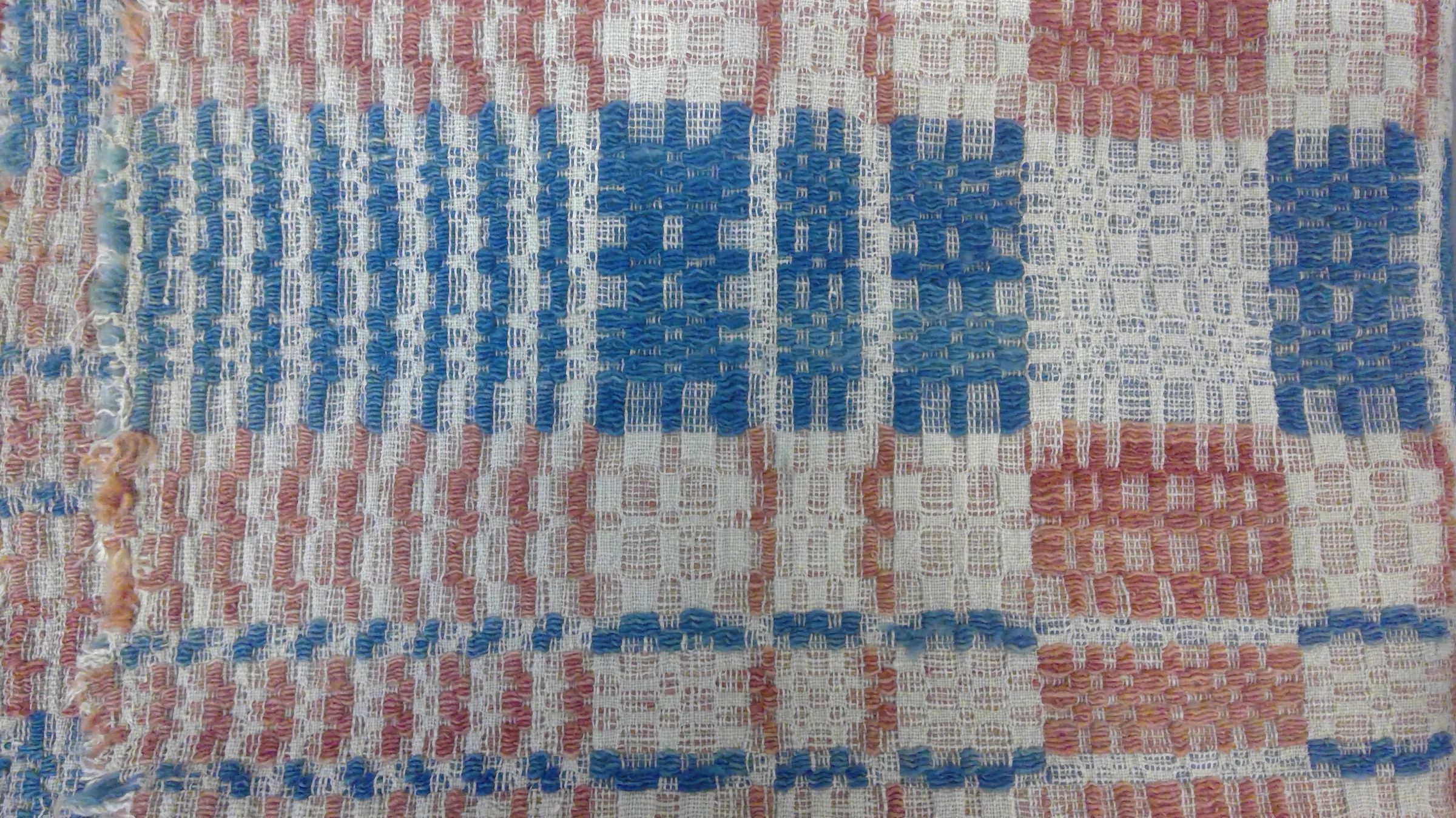 Design: red and blue stripes form blocks of alternating colors forming a checked pattern; border on three sides.