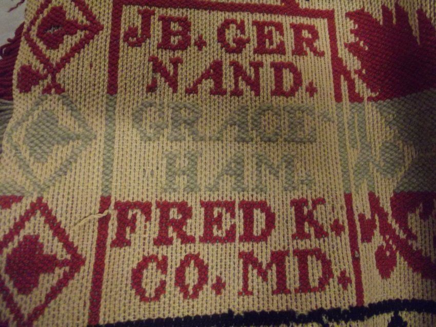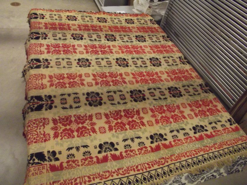 Biederwand with fringe on three sides and center seam. Red, green, and blue on natural background. Overall rose and star patterns. Grape vine border.Acquisition