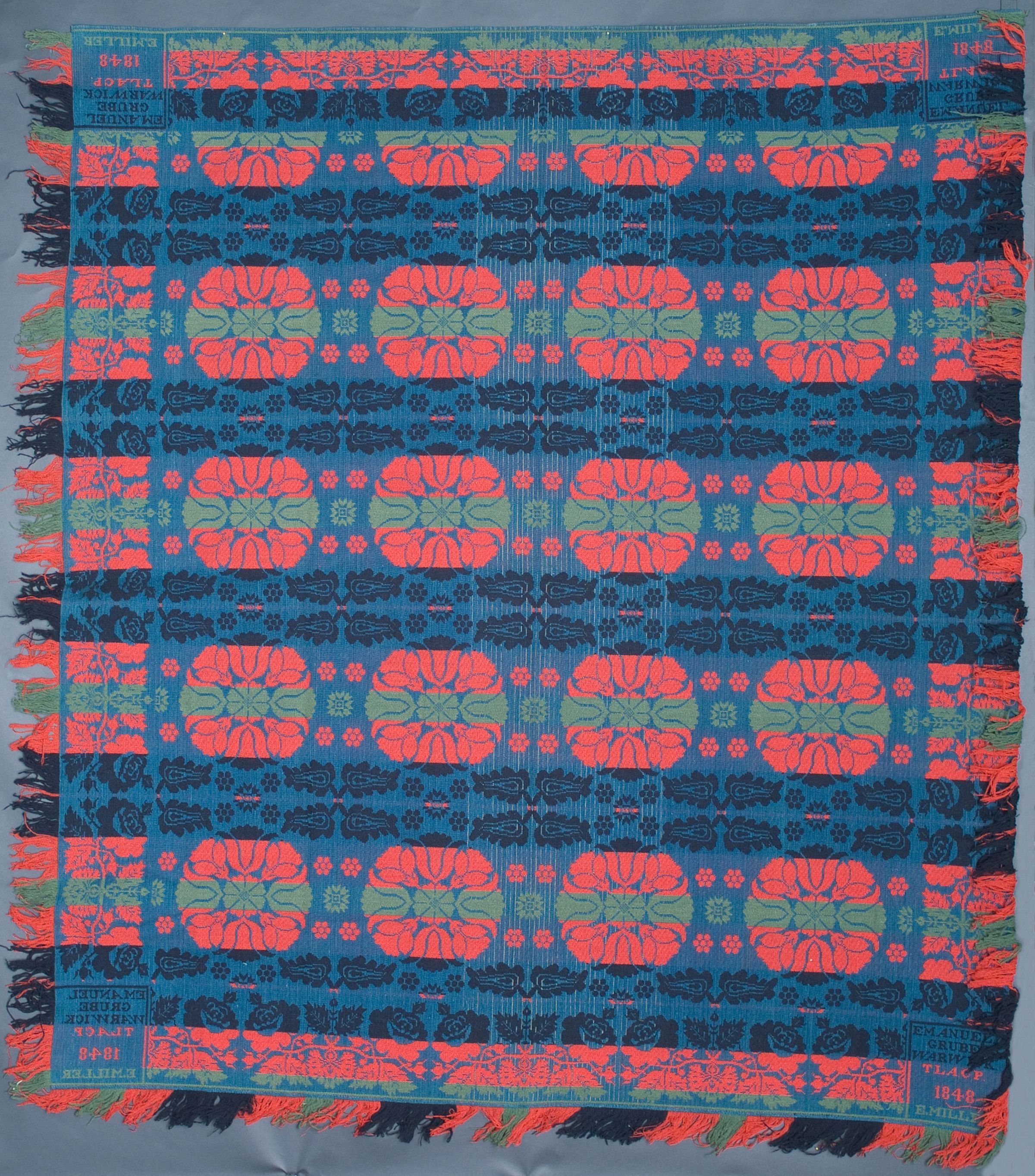 denim, navy, green, red; single weave; two loom widths joined; fringe on 3 sides; floral and medallion motif throughout; signature corner blocks on LL, LR, UL, URCollection