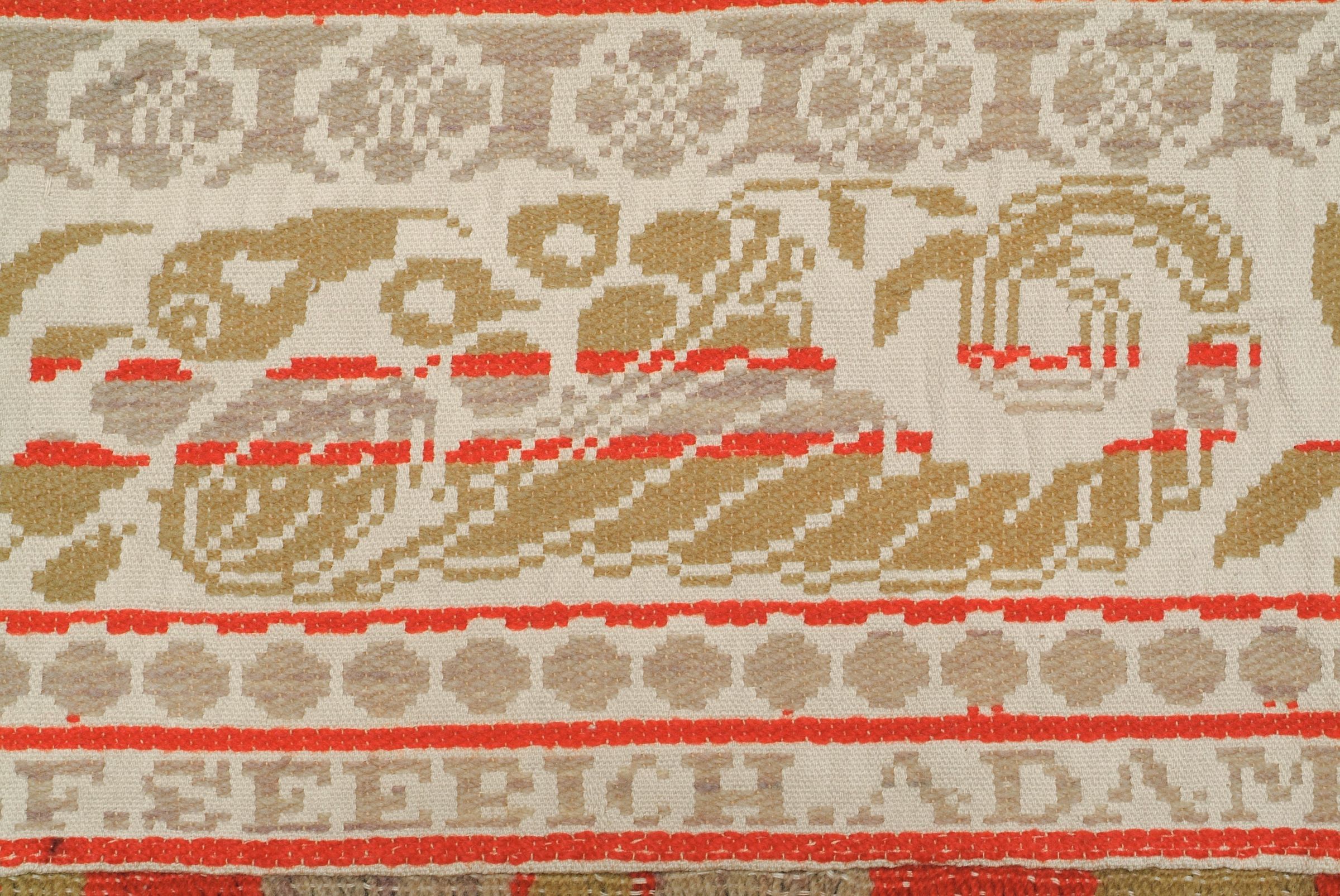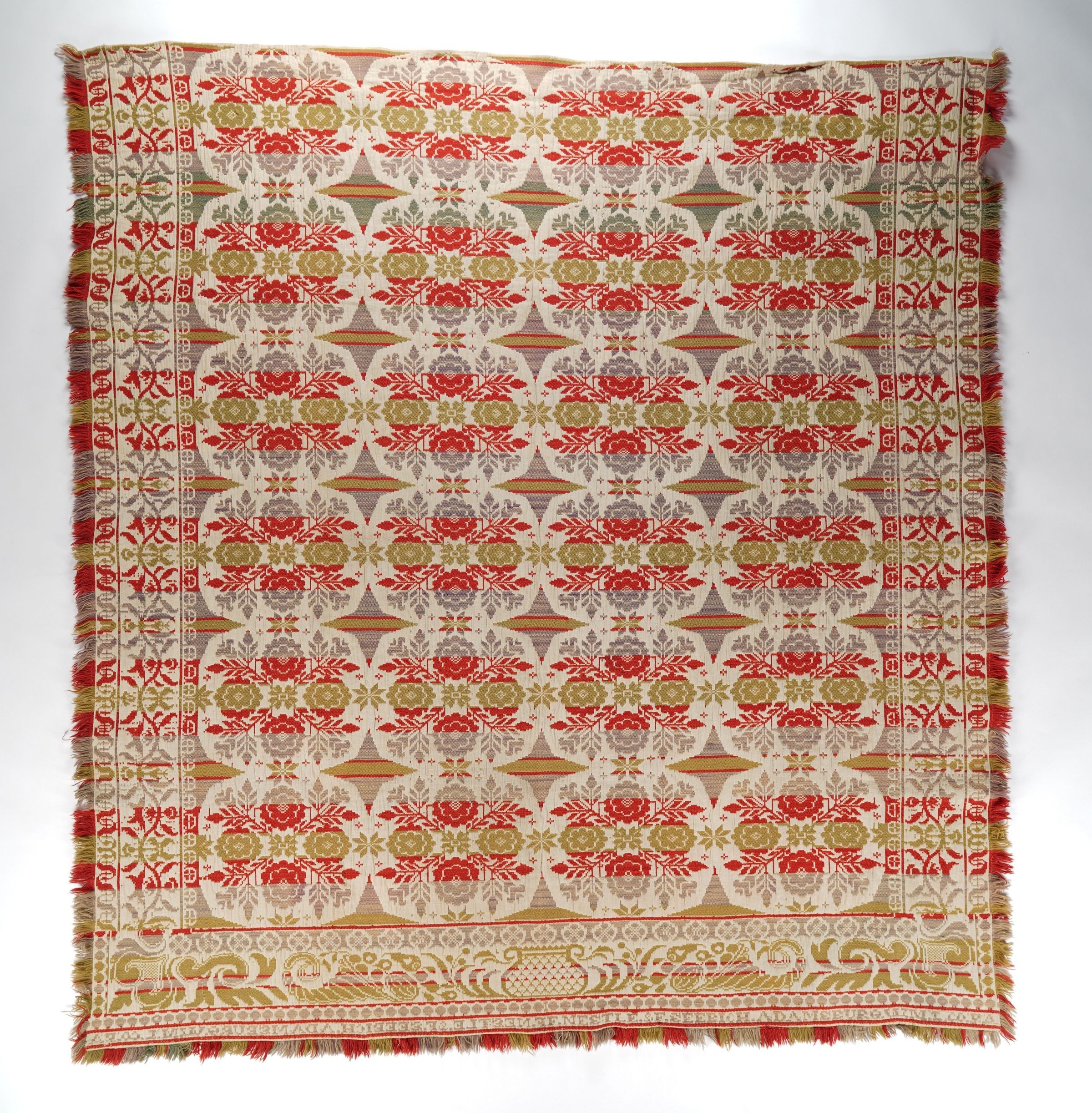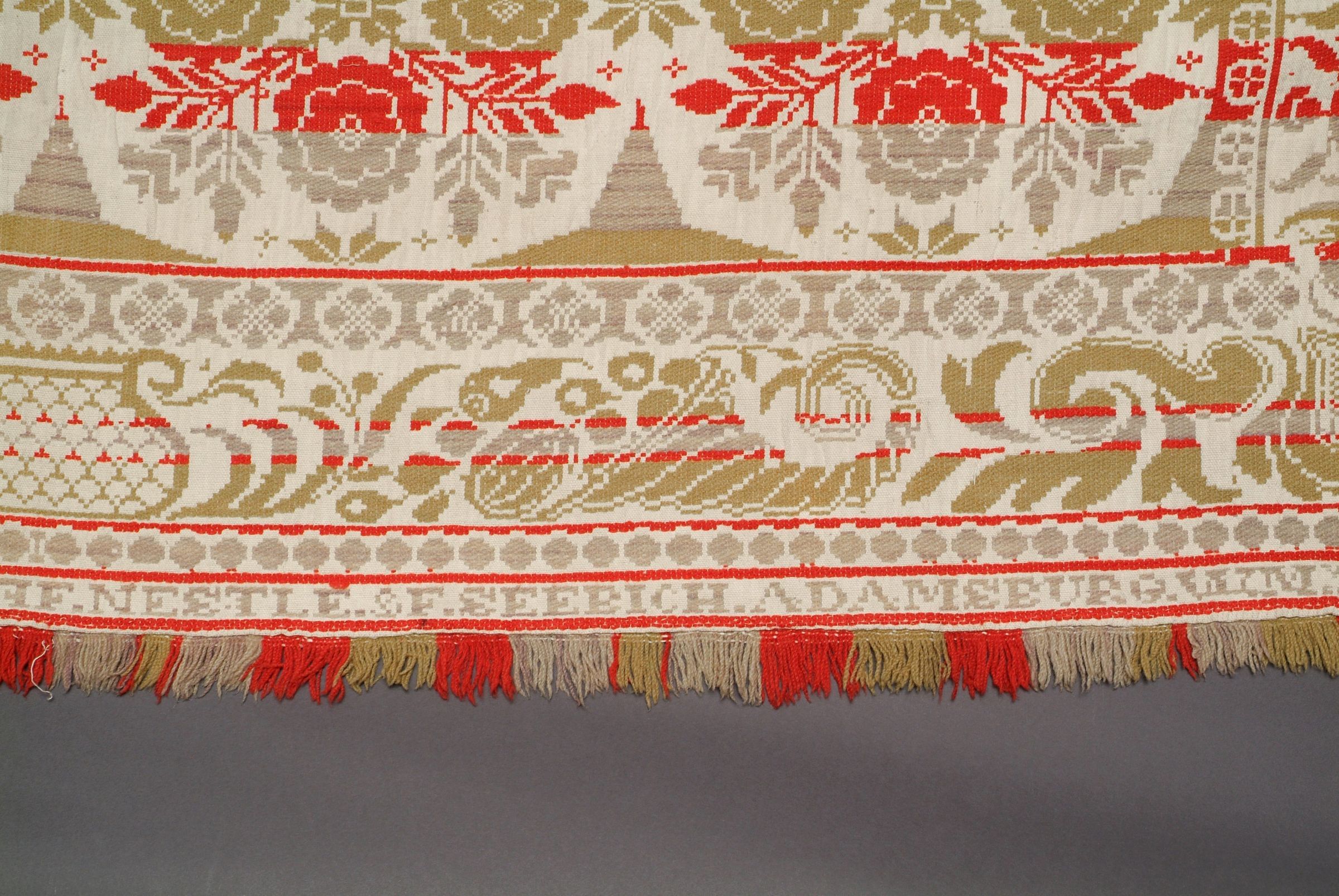 red, green, grayish purple, natural, teal; fringe on 3 sides, attached at bottom; seamless; centerfield of floral clusters in bubbles; color runs in strips; border is vine pattern on 2 sides; bottom border cornucopia and swirls; extension with inscriptionCollection