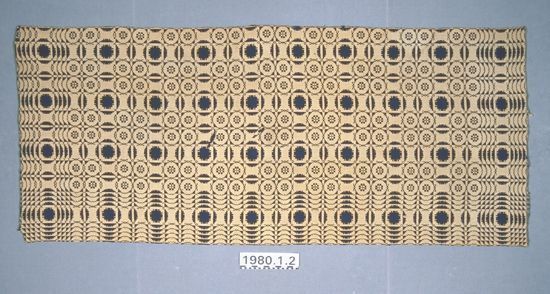 Coverlet panel; undyed cotton and blue wool, doubleweave. Selvedges on either side; top and bottom hemmed. Central motif is a framed single snowball alternating with a block of four roses; each rose is enclosed in its own circle. There is a wide border containing motifs similar to those in the field on three sides.Collection