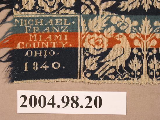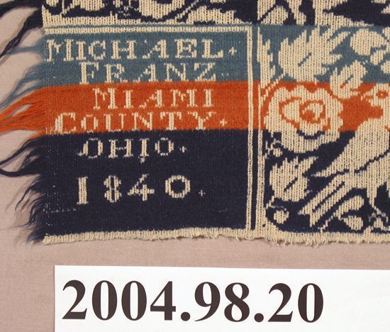 Figured coverlet undyed and blue cotton and blue, red, and aqua wool, tied double cloth (Beiderwand). Coverlet has two panels joined by a center seam. Hemmed at top, fringed on other three sides. Central motif is an all over pattern of small floral medallions, consisting of a wreath of four lilies surrounding an eight petaled flower within a sixteen-pointed star, alternating with small starburst medallions. Border of alternating birds, rose bushes, and trees runs along sides and bottom of coverlet.Collection