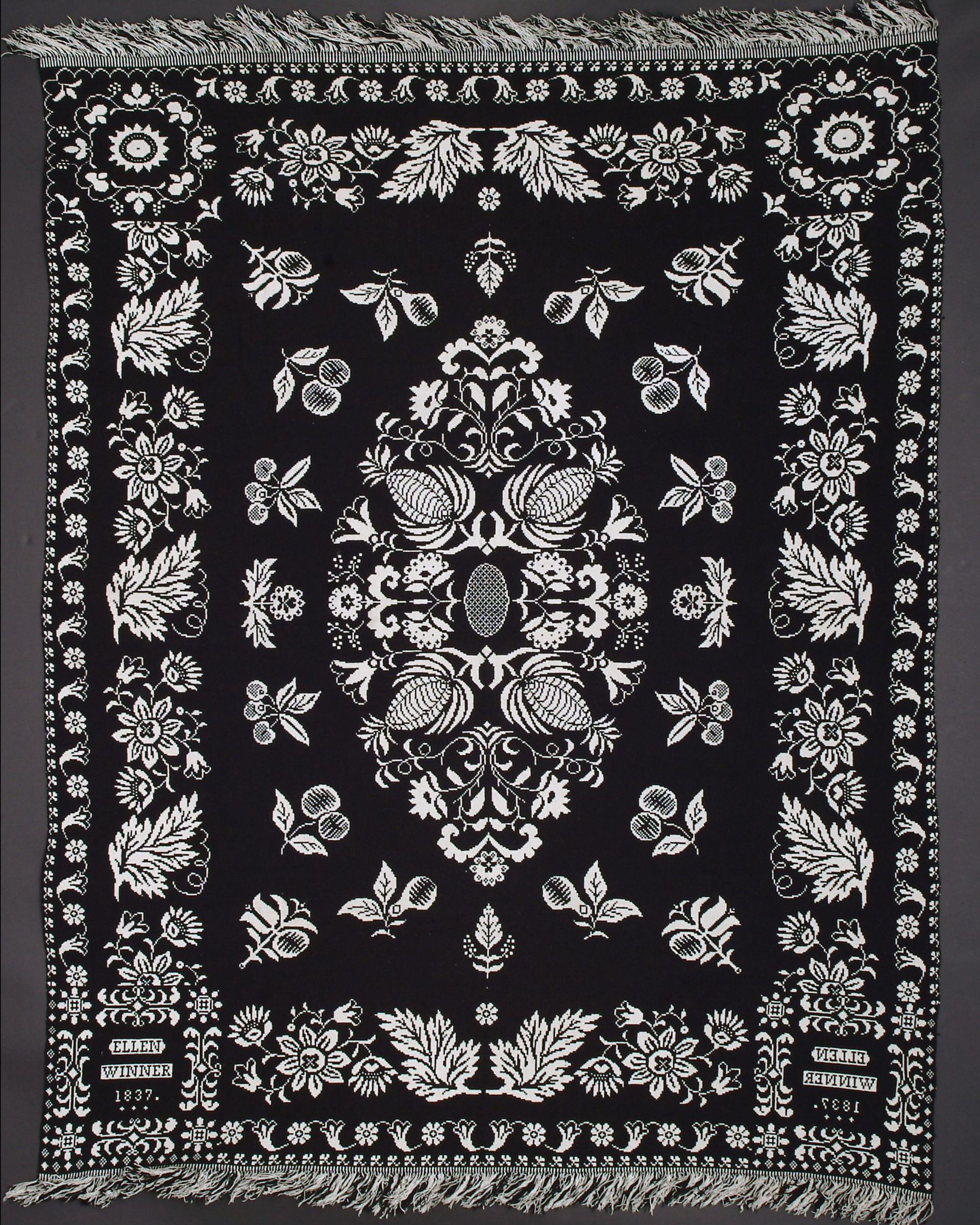 Double weave; navy, natural; seamless; fringe on top and bottom; border of alternating flowers; centerfield has pineapple and flower center medallion, surrounded by cherries, pears, and other fruit; 4 corner blocks, top 2 are starflowers, bottom 2 are inscriptions