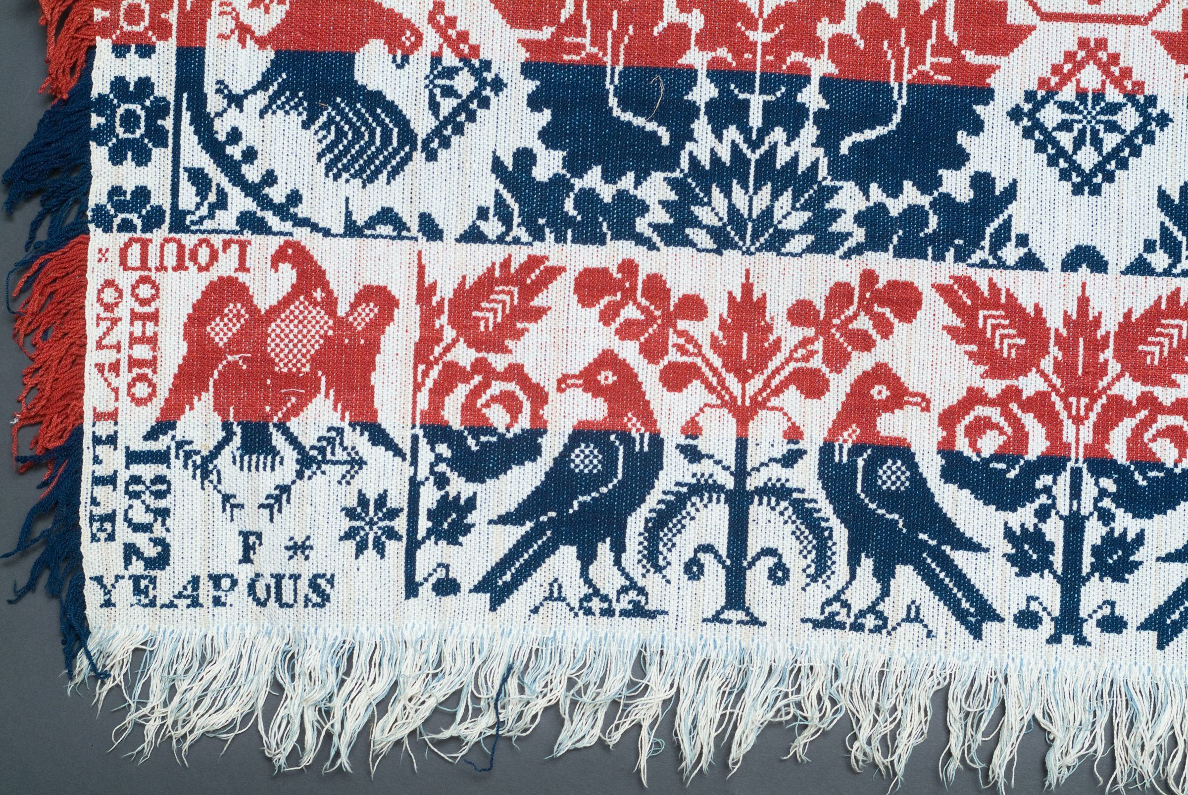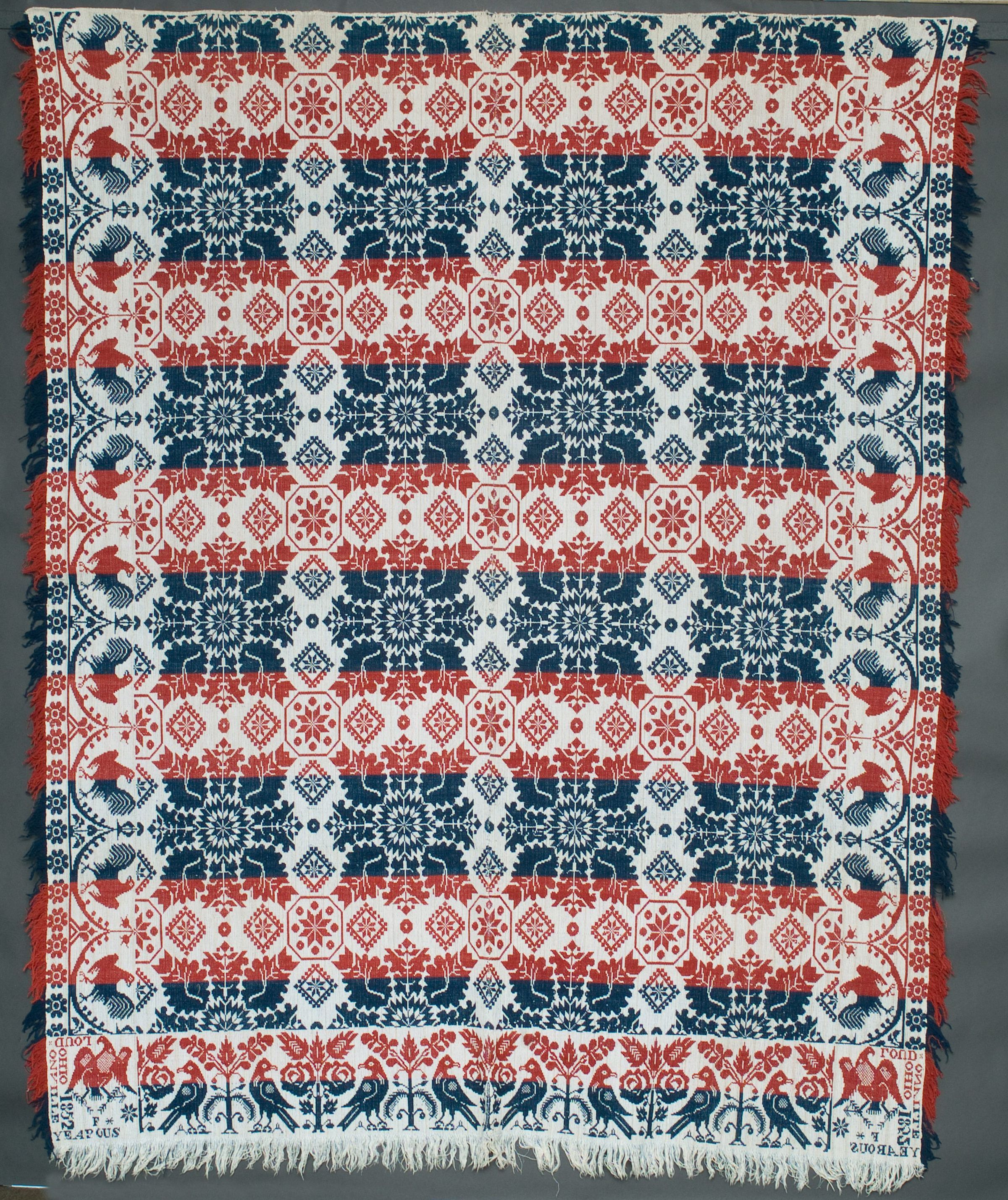 Tied Beiderwand; red, white, navy; central floral motif; repeating eagle and flower border; fringe on three sides; two loom widths joined; signature corner blocks with eagleCollection