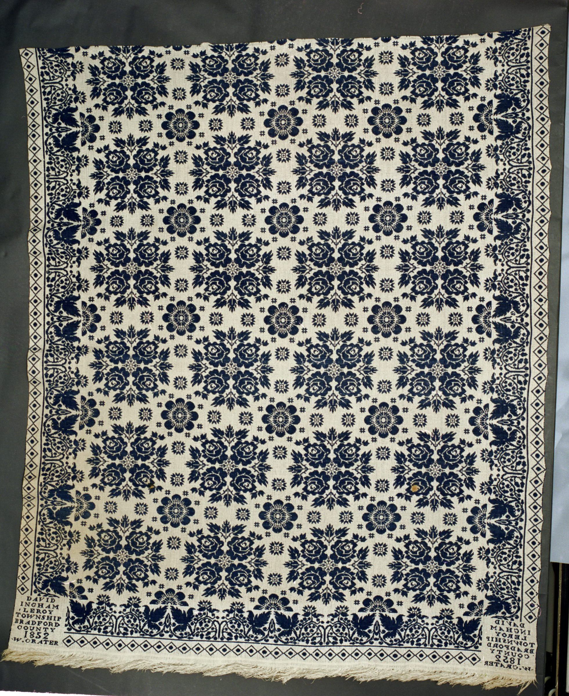 Beiderwand?; navy, natural; seamless; 2 corner blocks; fringe on one side; small border of diamonds with circles inside (except top edge) and large border of leaves and vines on 4 sides; floral pattern throughoutCollection
