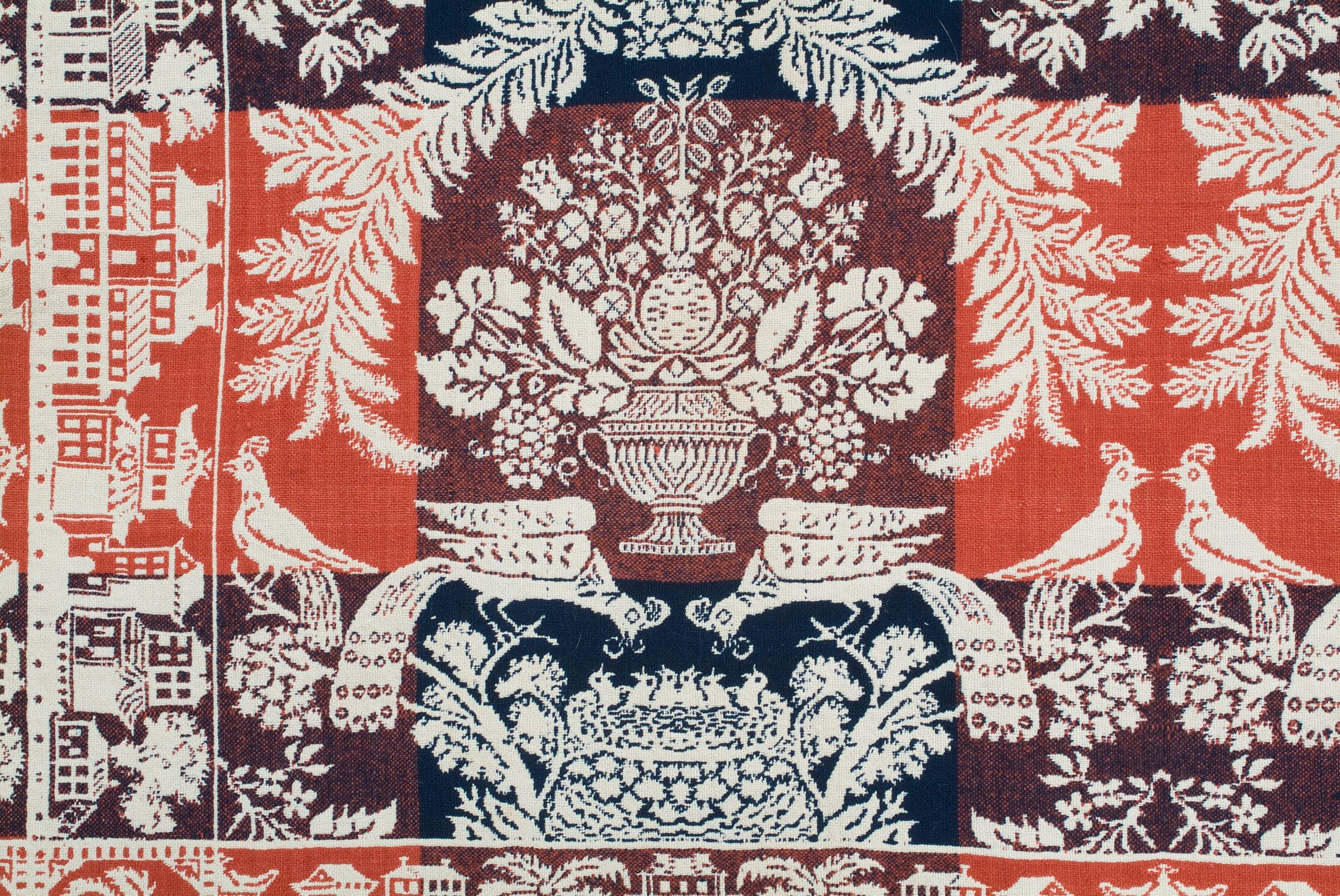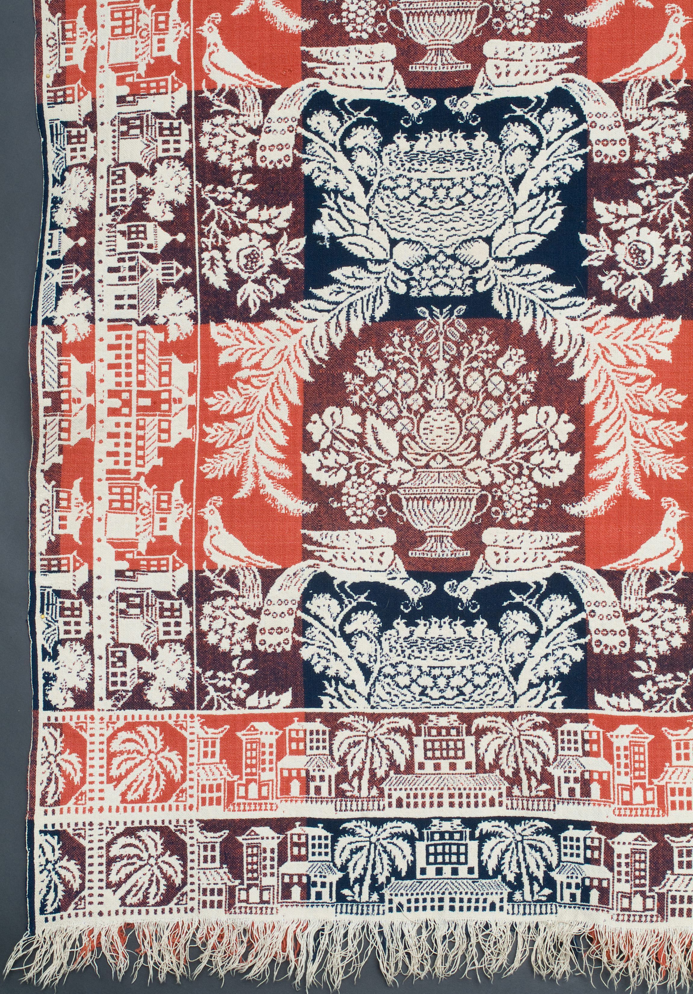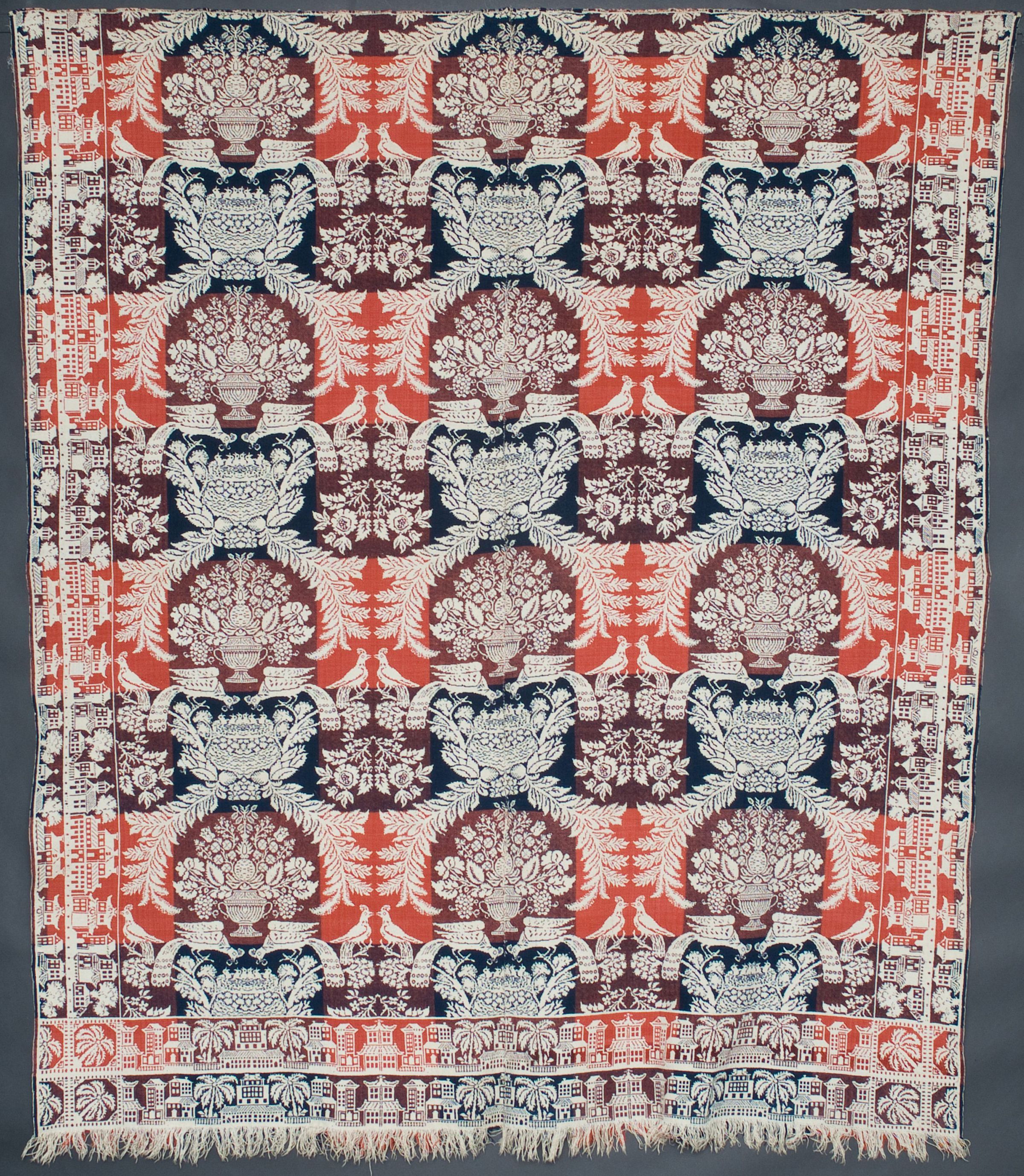 Double weave; orange, navy, natural; double border; fringe on one side; two loom widths joined; border is eastern style buildings with trees only on 3 sides; corner blocks in 2 corners with palm trees; centerfield is bowls of fruit and peacocks feeding babies in nests, flowers in between main designsCollection