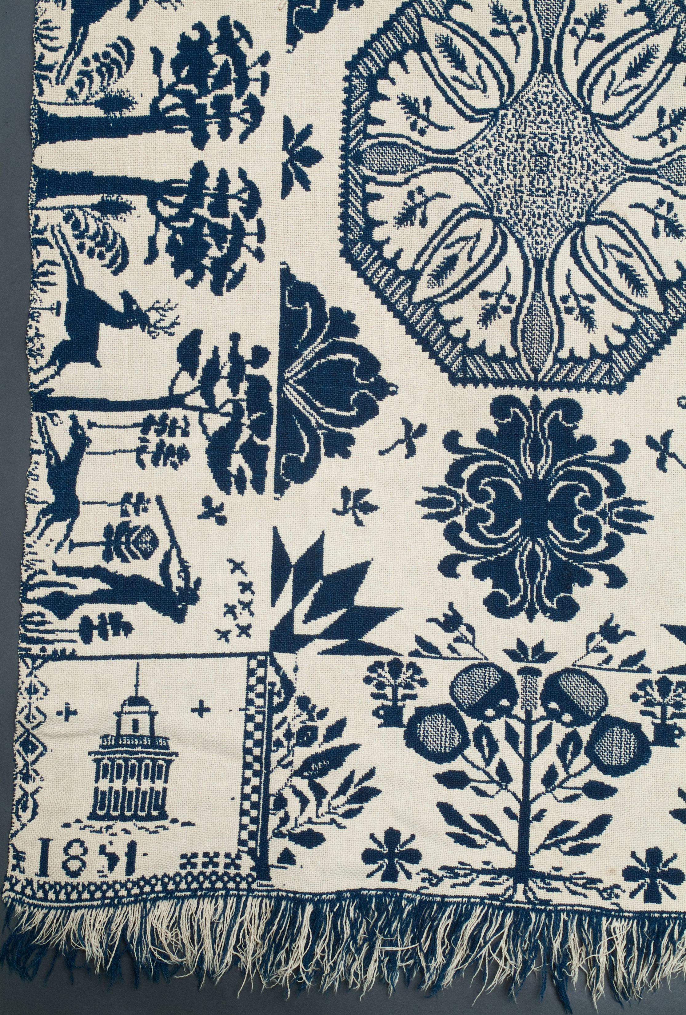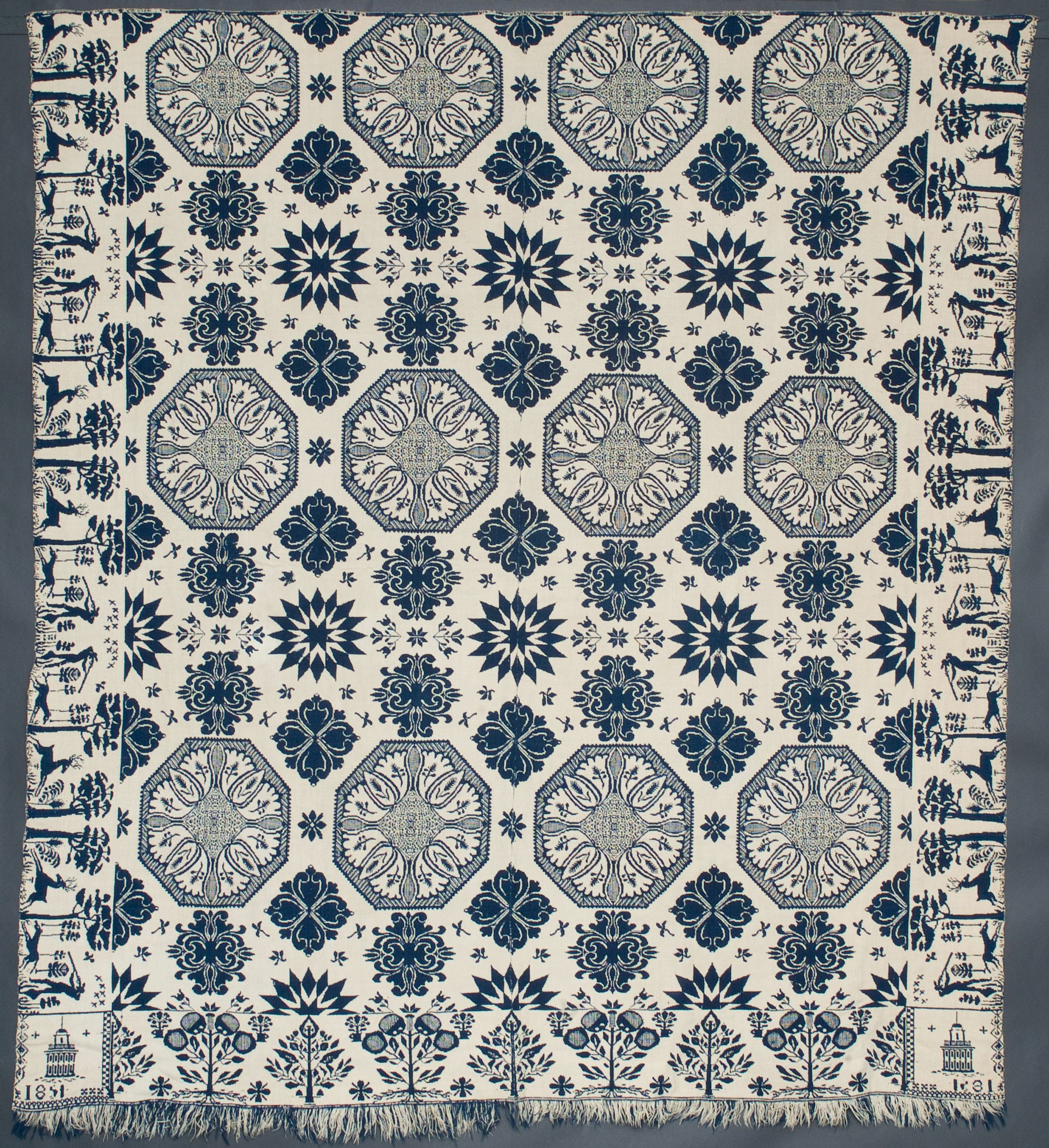 navy, natural; two loom widths joined; fringe on one side; border on 3 sides; hunter with gun and dog, aiming at stag, surrounded by trees; centerfield snowflake like octagons with stars and other designs between; 2 corner blocks with buildingCollection