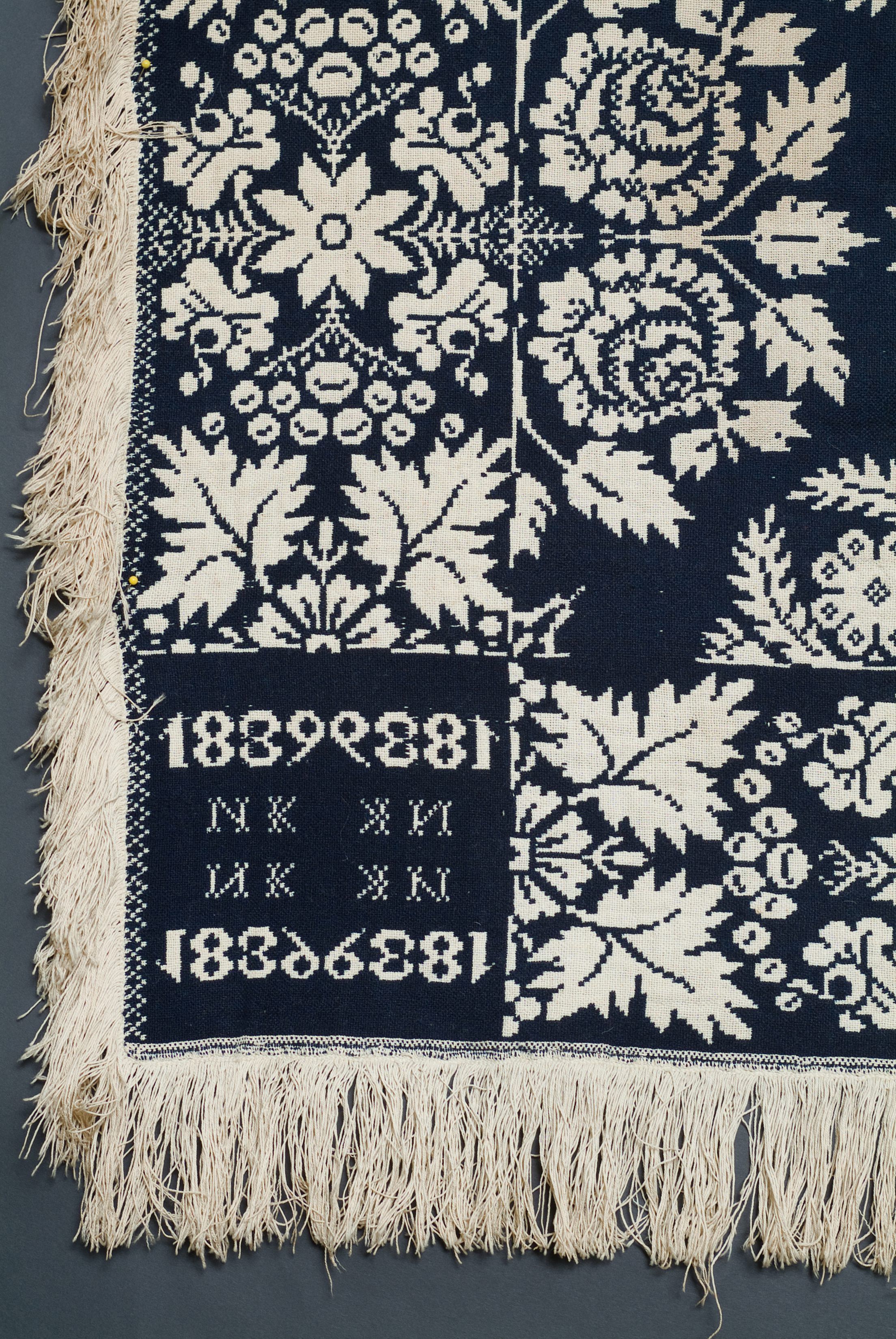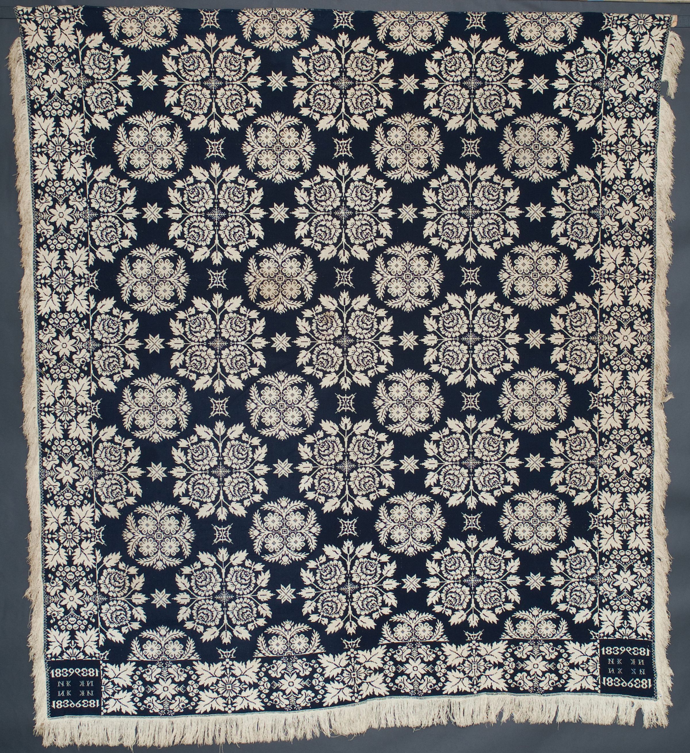 Double weave; navy, natural; two loom widths joined; fringe on 3 sides; border on 3 sides with floral leaf and berry design; centerfield of floral clusters of rosettes and other flowers; stars in between; corner blocks give a year located in 2 cornersCollection