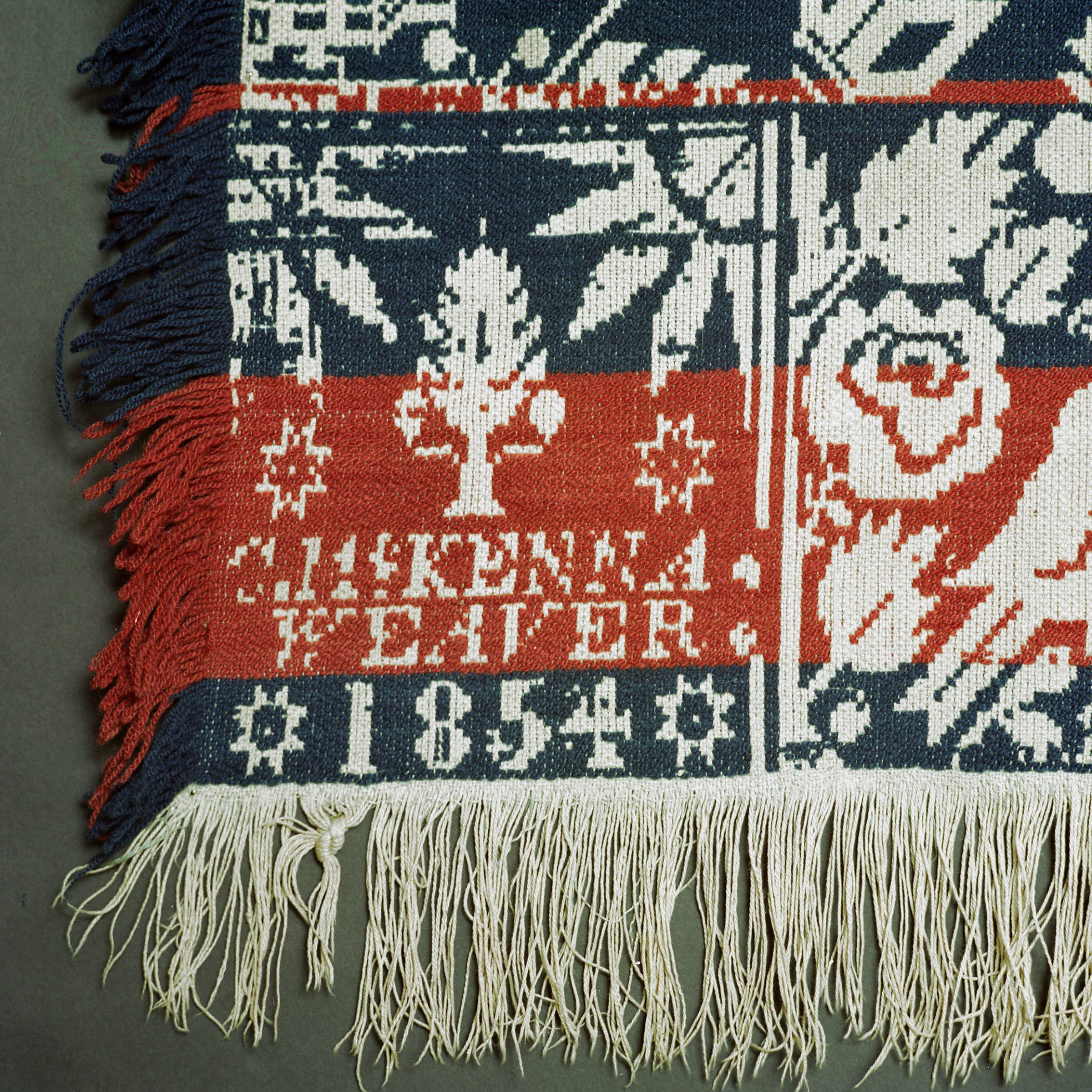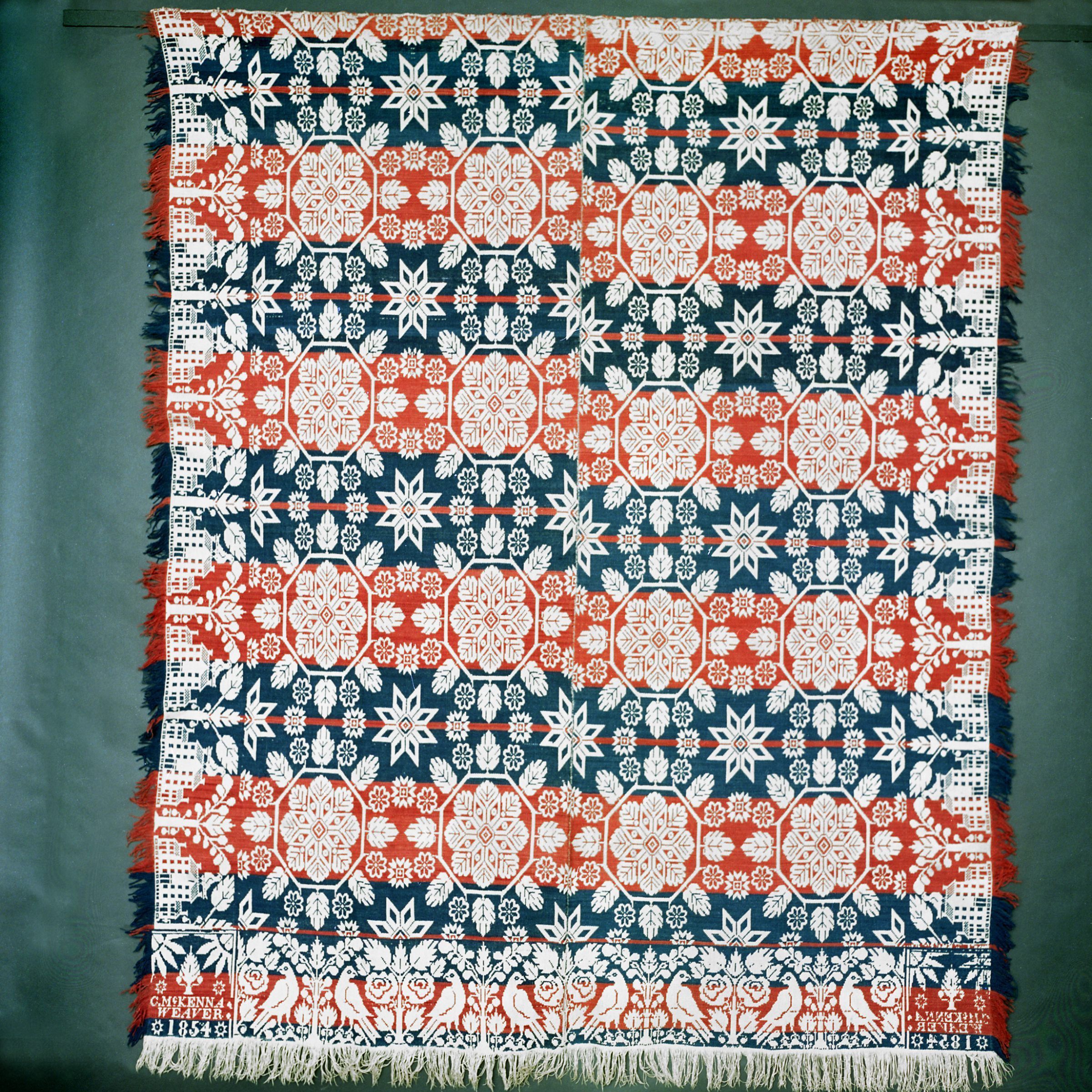 Beiderwand; red, navy, natural; two loom widths joined; fringe and border on 3 sides; long borders have western style buildings with birds and trees, short border on bottom has distelfinks and rosette trees; centerfield of snowflakes and flowersCollection
