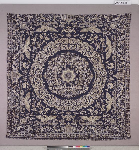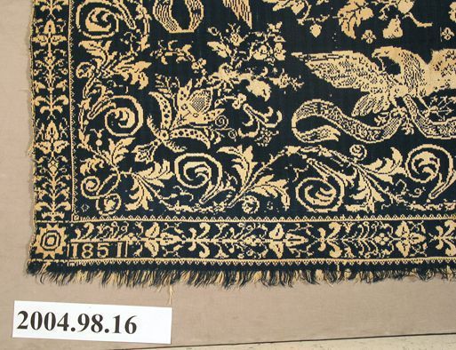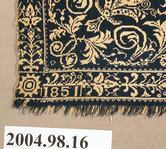 Figured coverlet; undyed cotton and dark blue wool, double cloth. The bottom of the coverlet is fringed and the other three sides have been cut. The coverlet has a central motif that consists of a single circular floral and scroll medallion with an eight-pointed star at its center. The medallion is surrounded by a wreath of scrolling vines. On each side of this central motif are a pair of eagles carrying a scroll, a pair of deer, a pair of birds on a branch, and a building. On the outer edge of the field, a chain of scrolling vines links the buildings. A narrow floral border is on three sides with a single floral motif in the bottom corners. Only the bottom border is complete.Collection