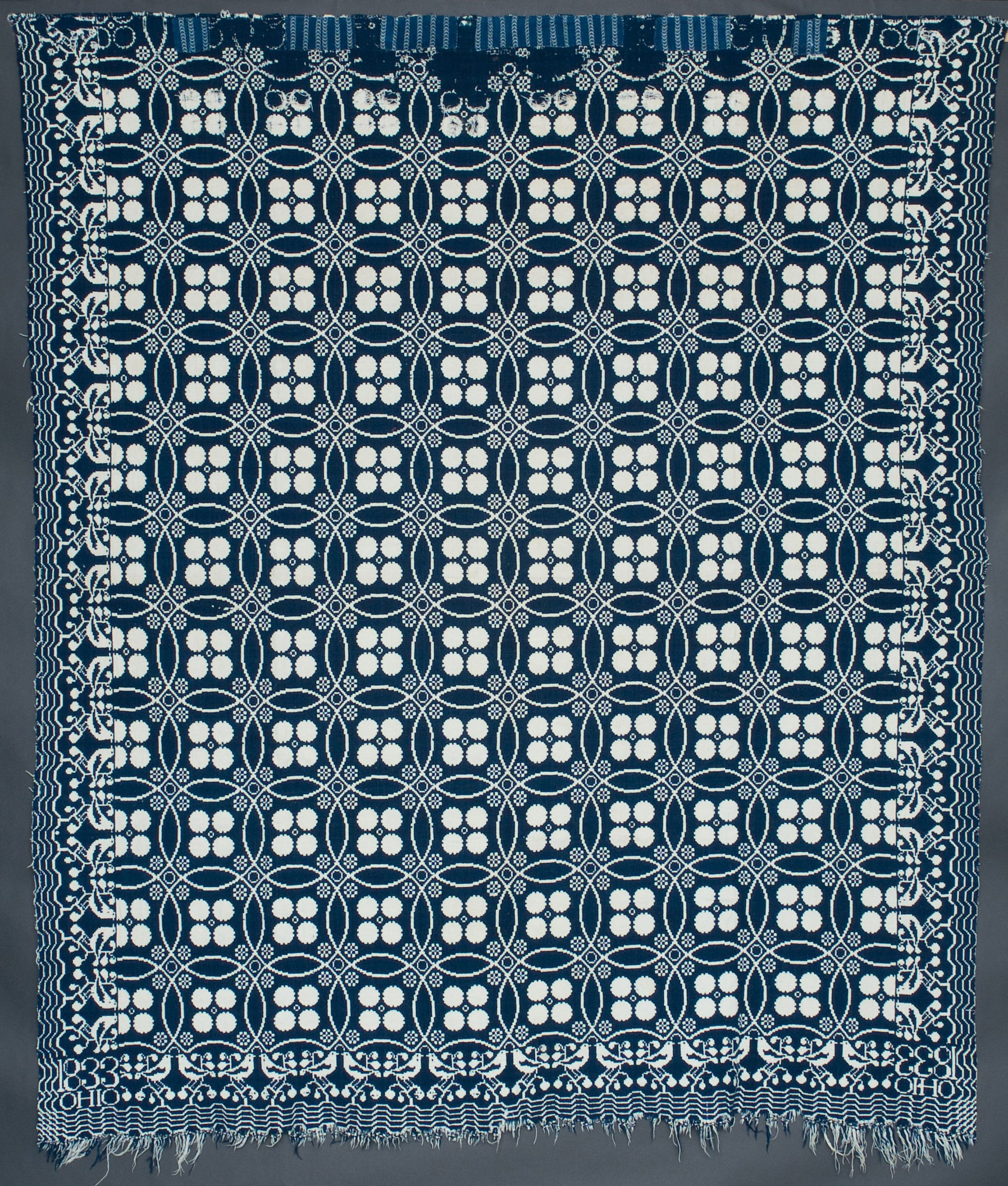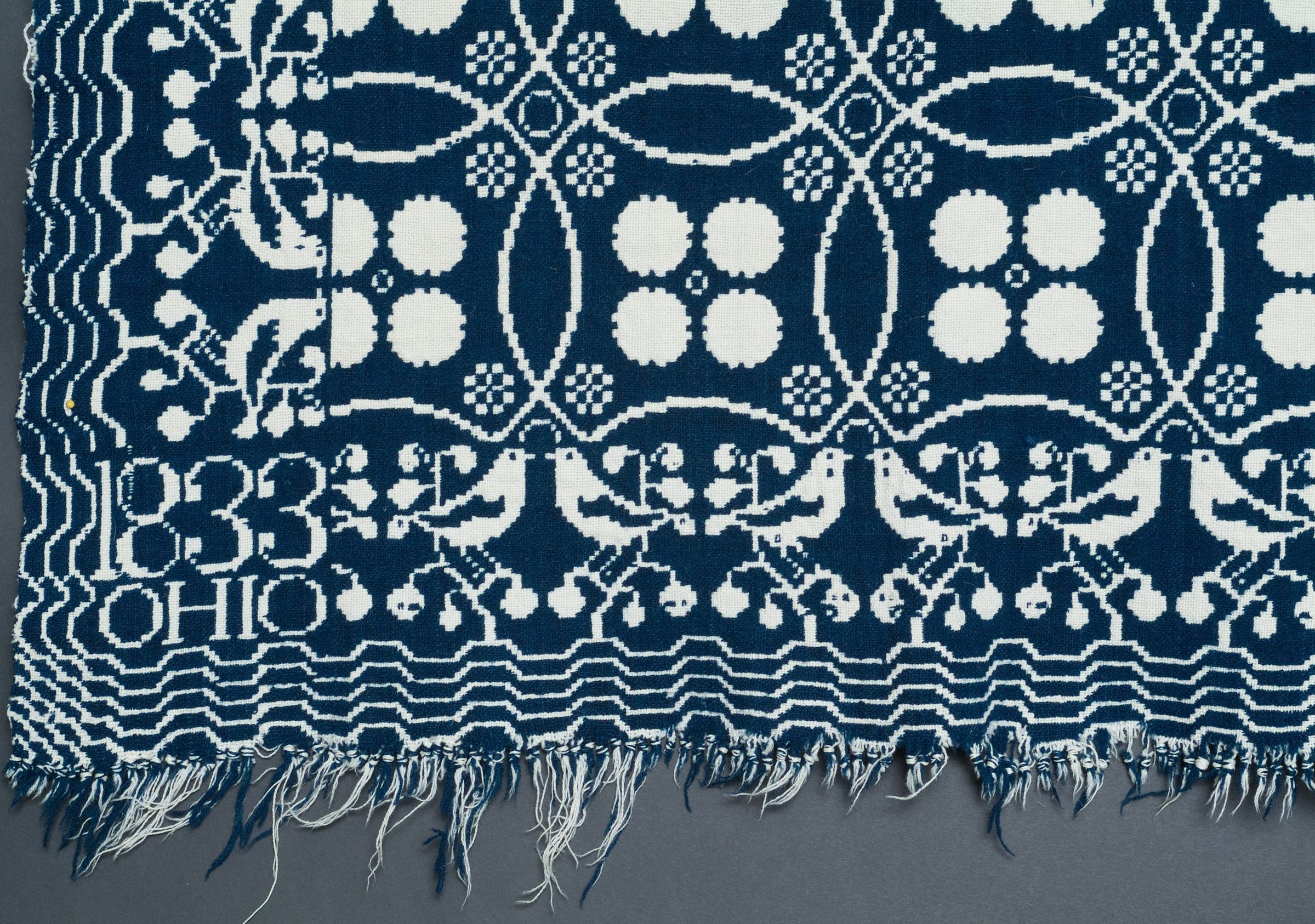 Double weave; navy, natural; fringe on one side; seamless; border on three sides with birds, berries, and wave pattern; center geometric overlapping circles each with 4 filled in circles in the center; corner blocks have inscriptionCollection