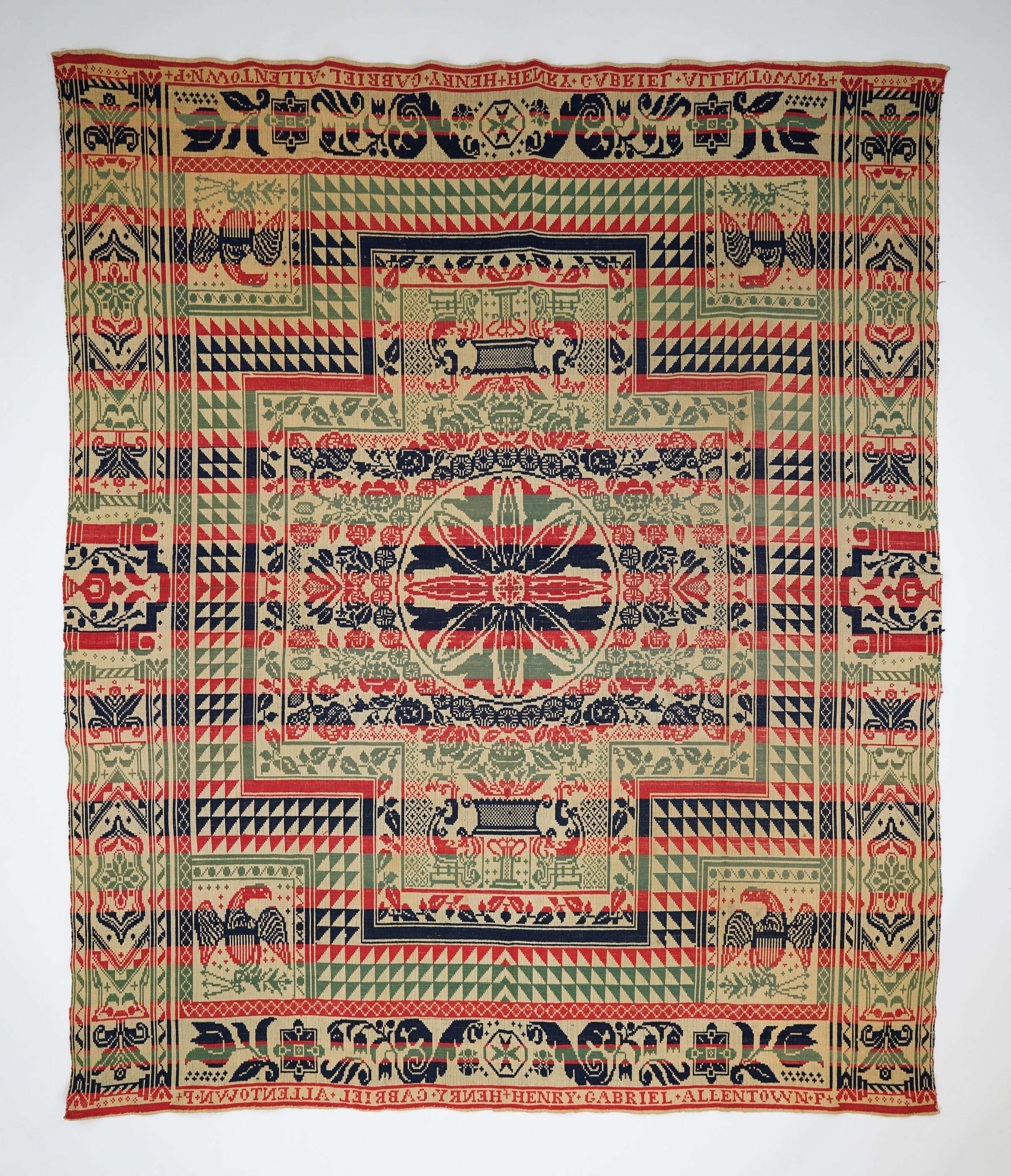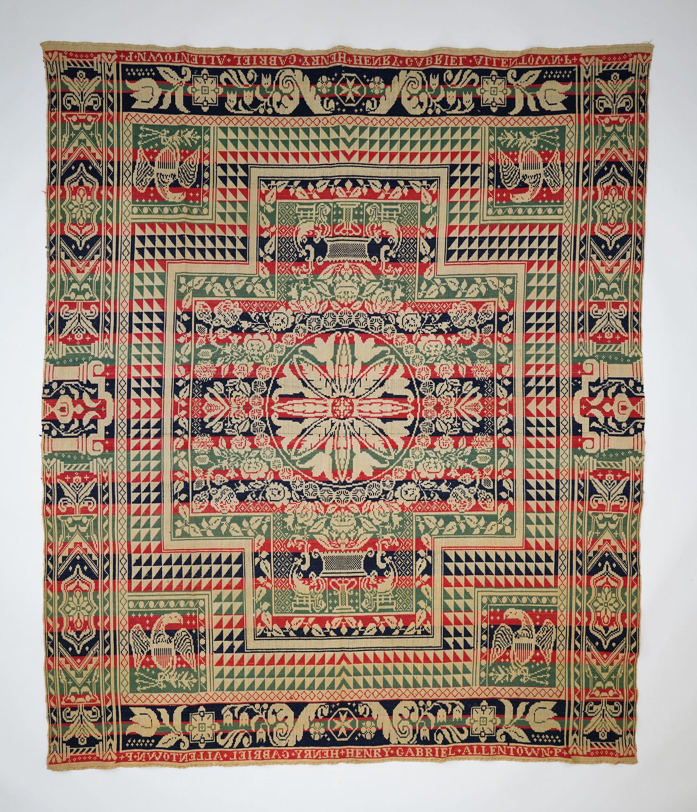 Red, Navy, and Green, figured tied biederwand coverlet; full loom width, seamless, abstract borders on four sides, center medallion with shielded eagles in corners of centerfield. No fringe.Collection