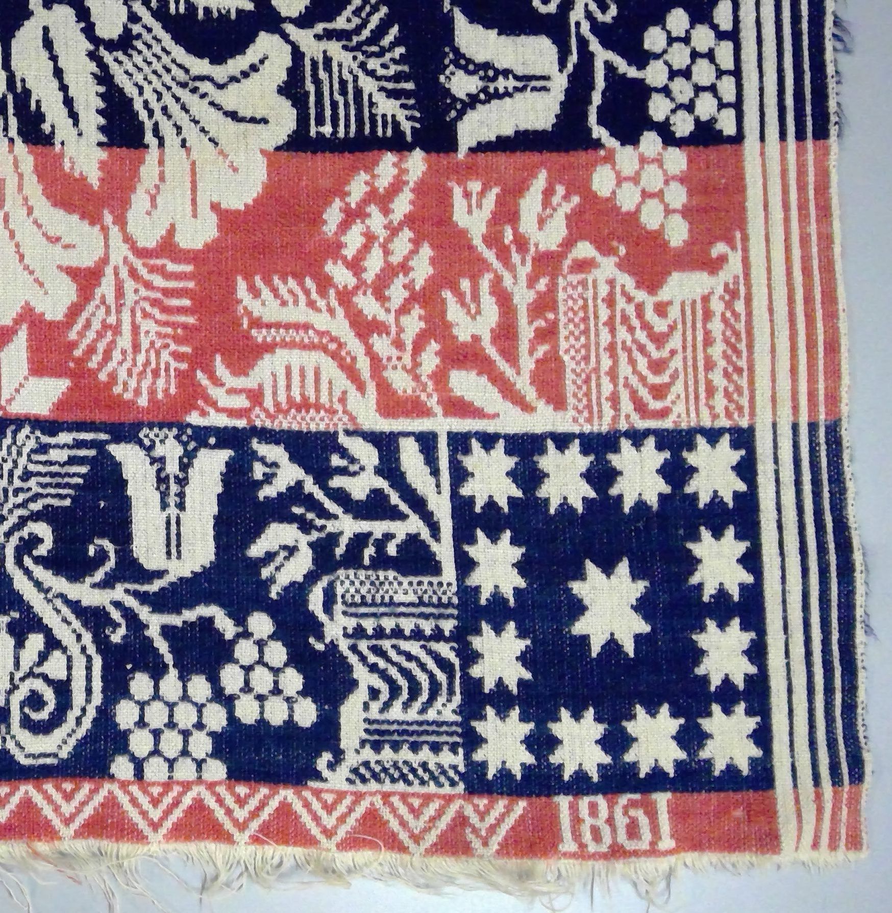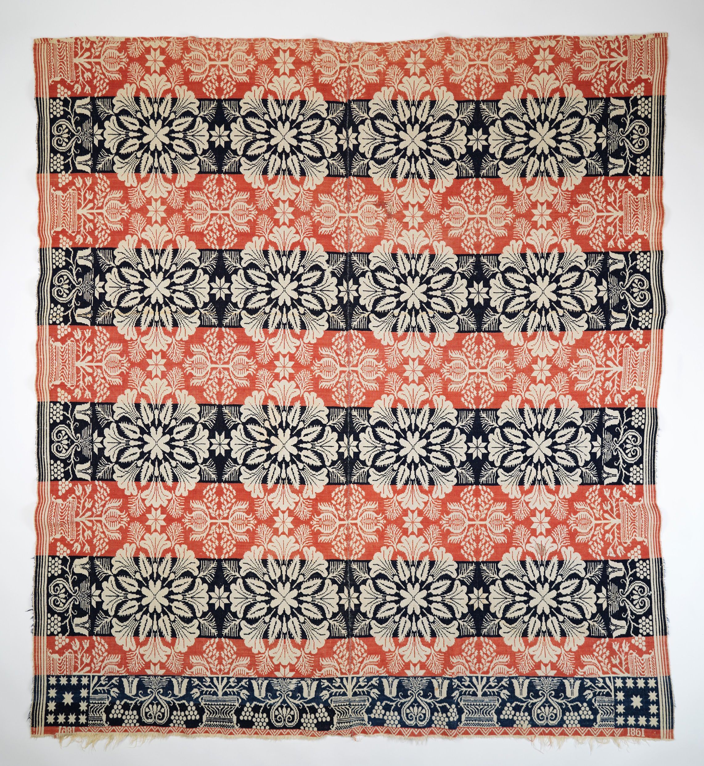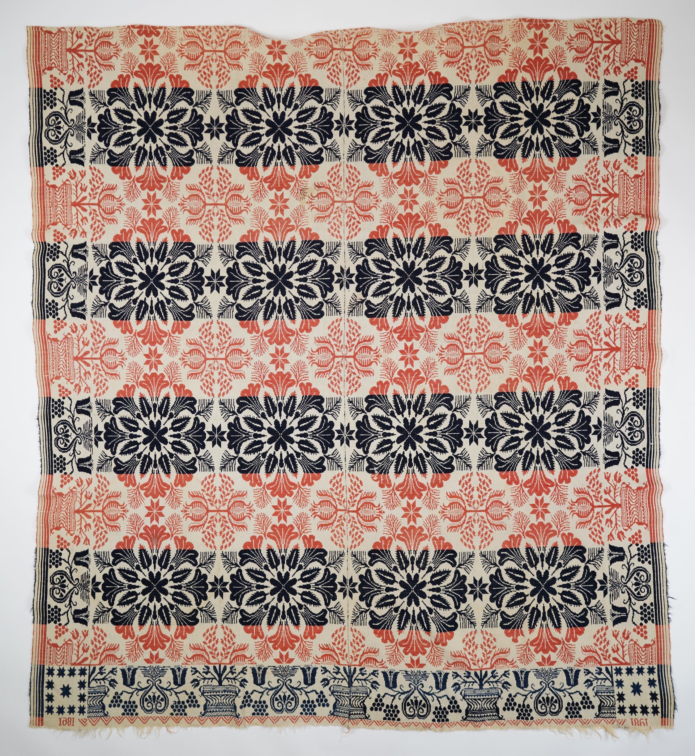 Coral and navy figured Beiderwand figured coverlet; two panels joined by a center seam; self-fringe on three sides mostly worn away; borders on three sides. Floral medallion pattern.Collection