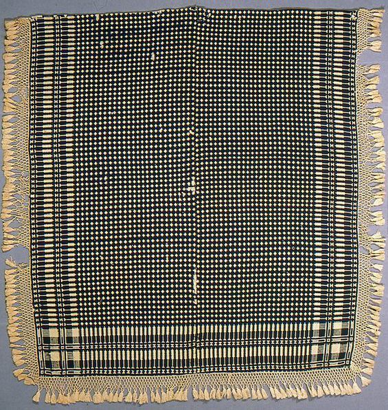 Geometric doubleweave coverlet; navy wool and natural (undyed) cotton. Two panels joined by a center seam. Allover small diamond pattern with pine tree border on three sides. Machine-woven cotton trim with knotted fringe and tassels was applied at a later date.Collection