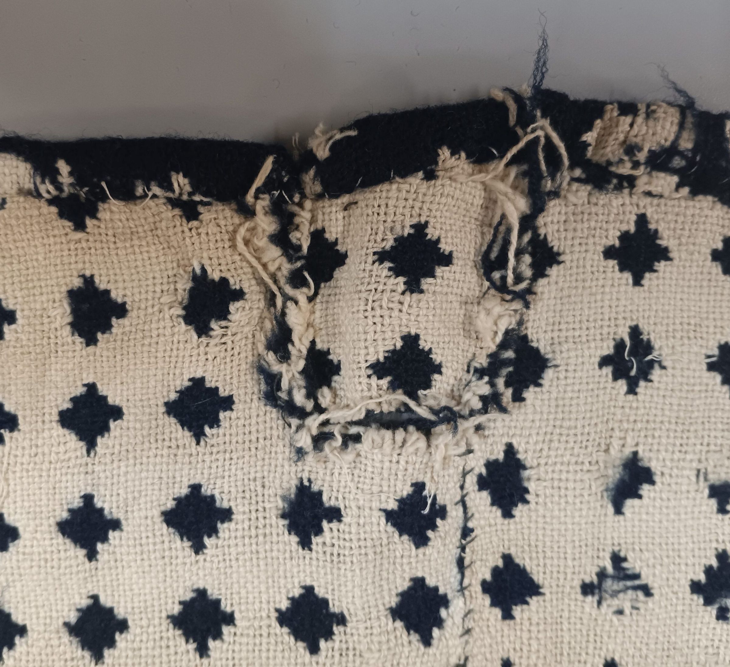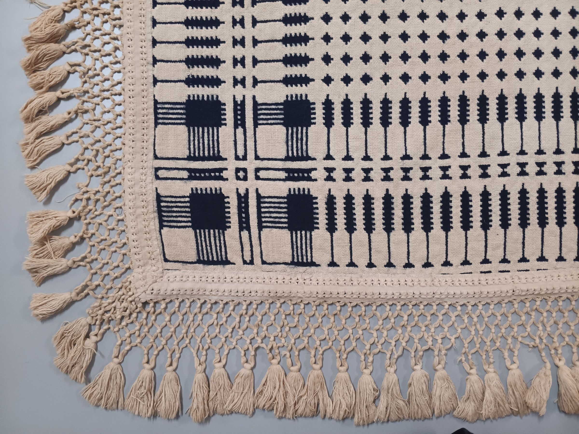 Cotton tape and knotted fringe are a single piece; the multi-strand filler (weft) in the warp-faced fabric tape extends past the selvedge to form the knotted fringe. Tassels are comprised of separate threads folded over a loop in the fringe and bound; each tassel is attached individually.Other Names and Numbers
