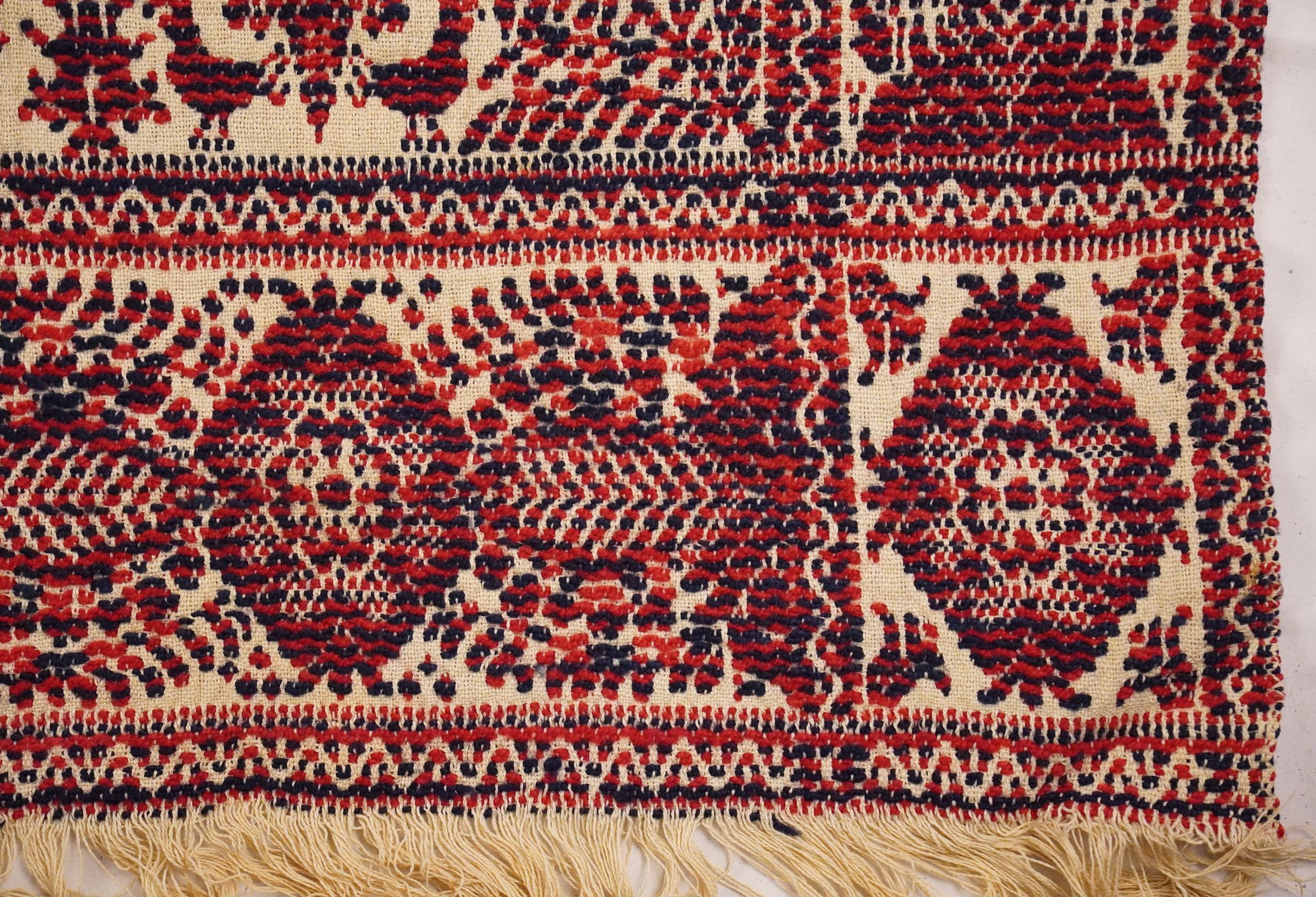 Natural, red, and navy figured true beiderwand coverlet; two panels joined by a center seam. Fringe on bottom; border on three sides.