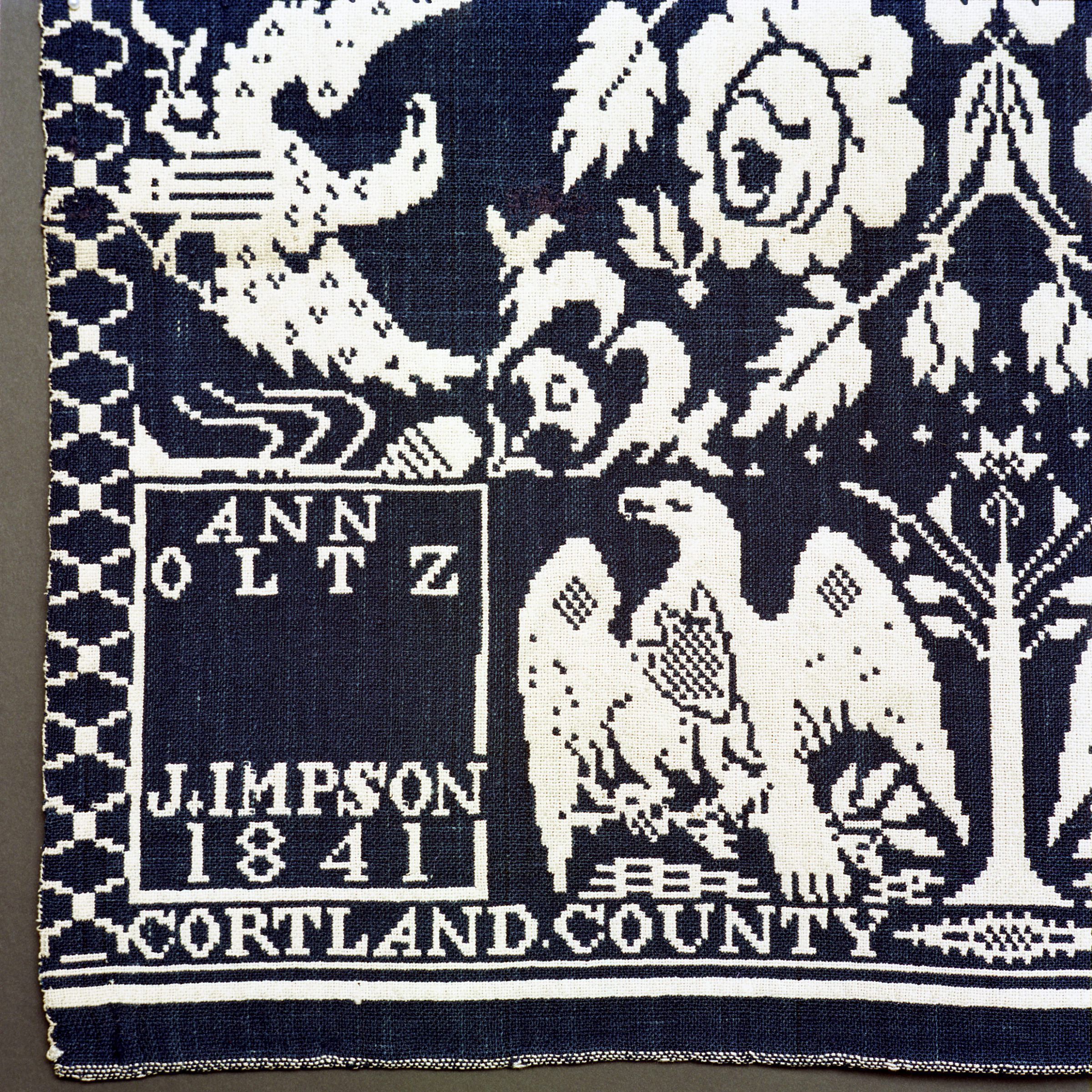 Double weave; navy, natural; two loom widths joined; no fringe; border on 3 sides of eagles and trees; centerfield of rows of rosette clusters; tiny stars in between; 2 corner blocksCollection