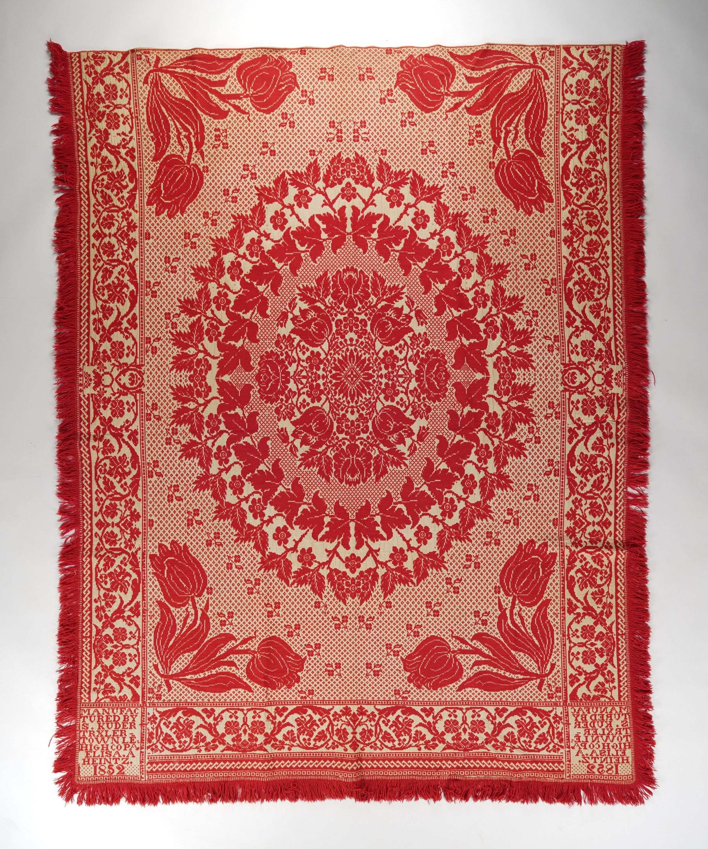 Red and natural figured True Beiderwand coverlet; seamless; applied fringe on three sides; grapevine border on three sides; floral center medallion centerfield pattern.