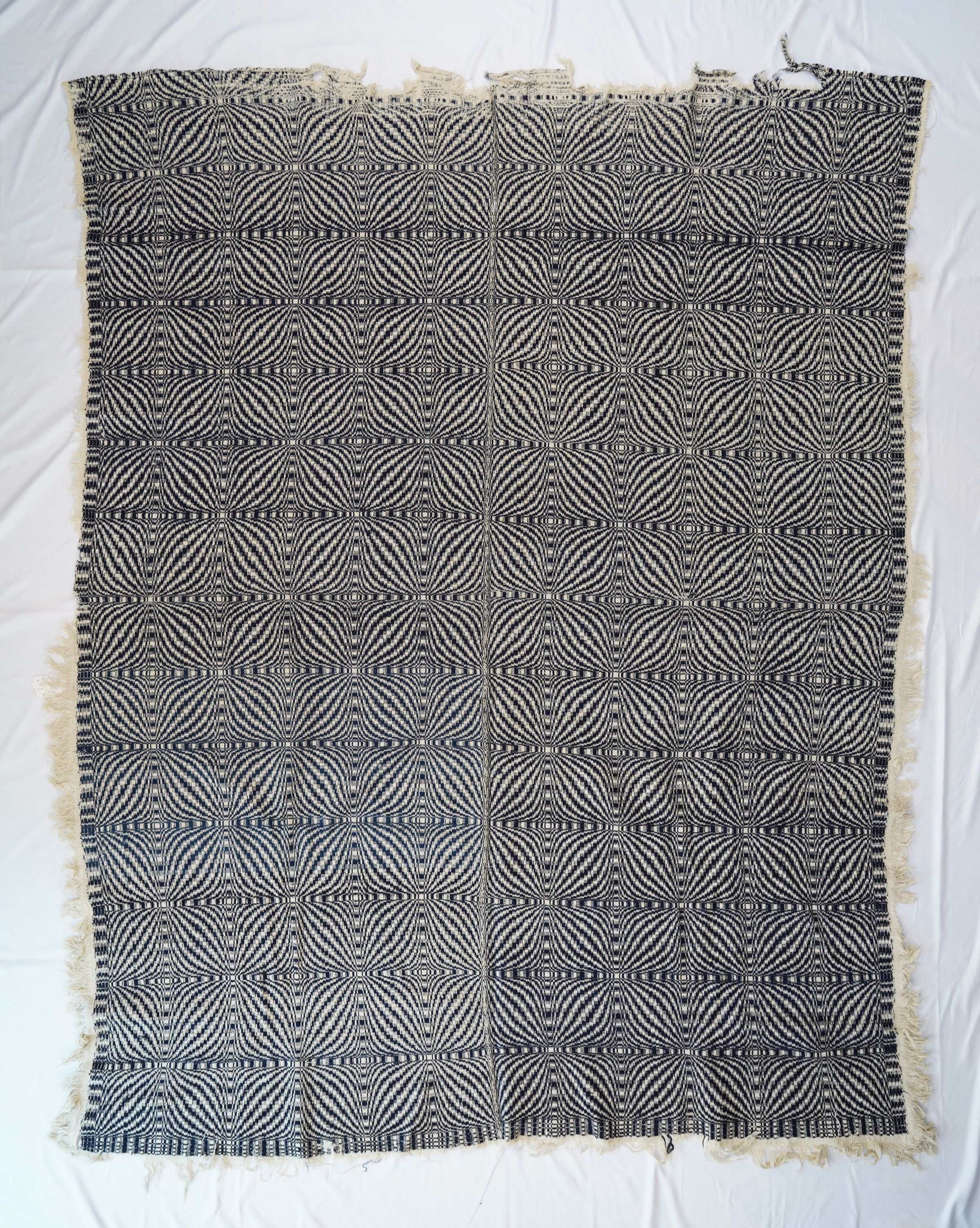 Navy and natural geometric coverlet; double bowknot overshot pattern. Fringe on three sides. Natural cotton tabby and navy wool pattern weft.