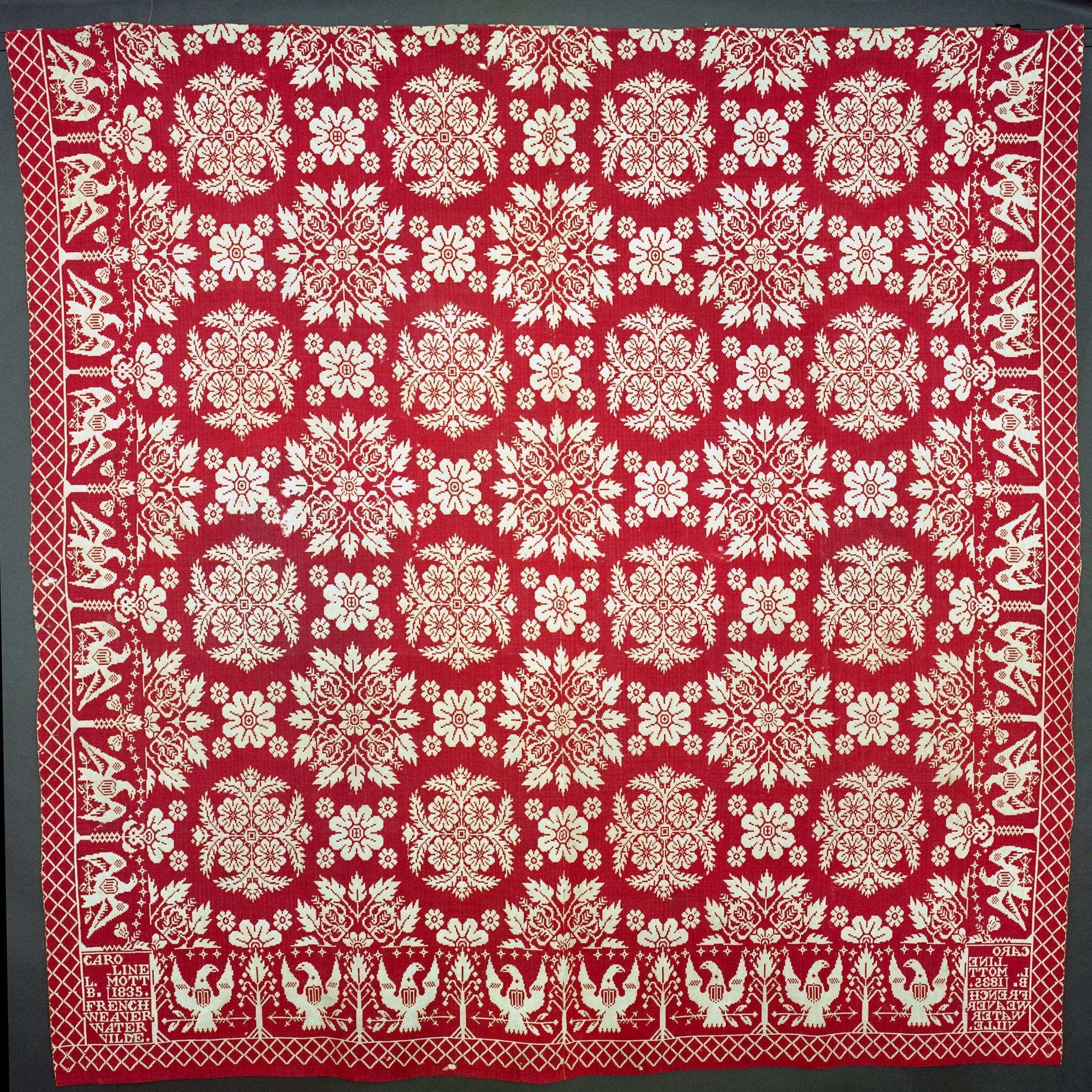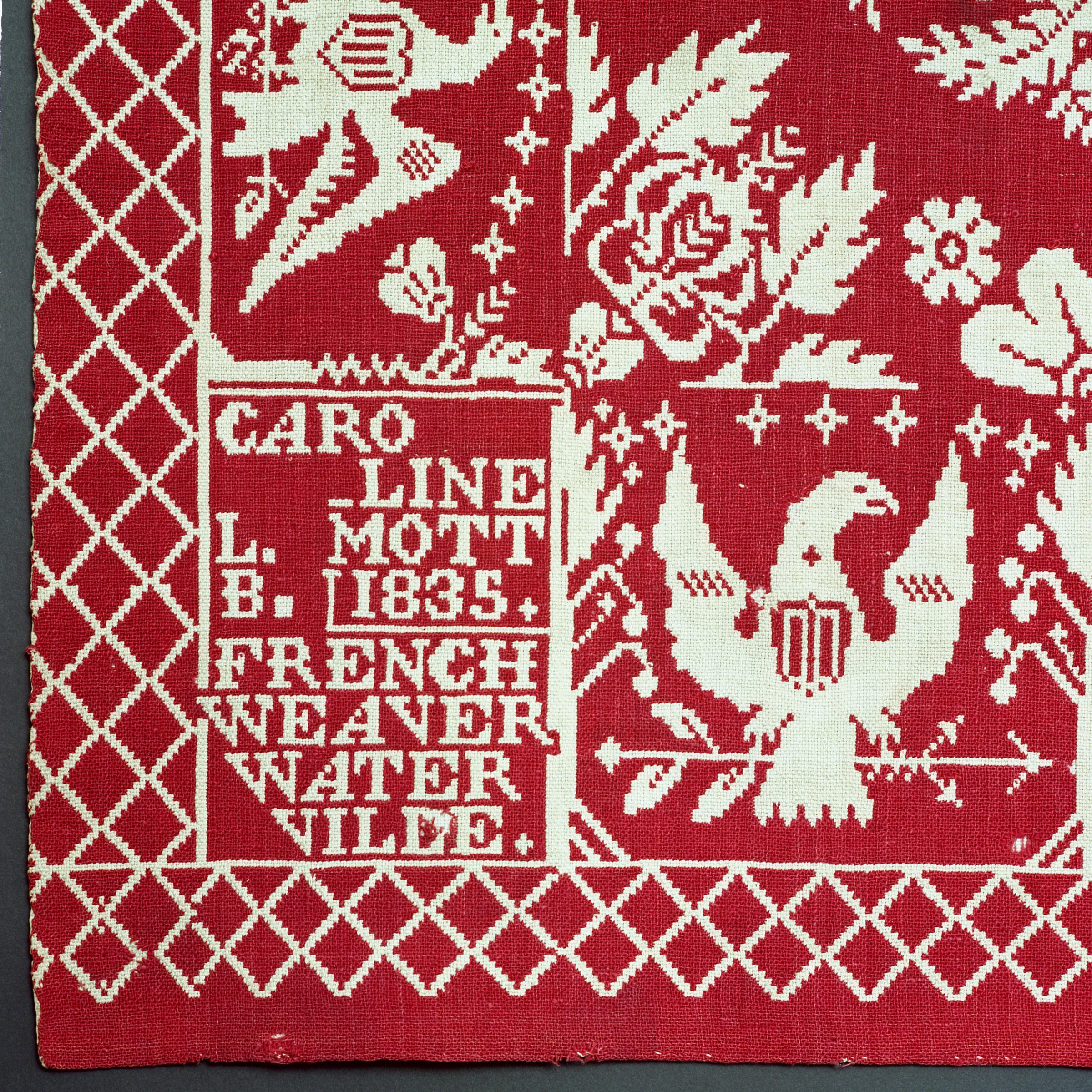 Double weave; red, natural; seamless; no fringe; two corner blocks; eagles on 3 borders; floral pattern throughout; diamond pattern on outermost border; old tag at corner reads "Mrs. ?"Collection