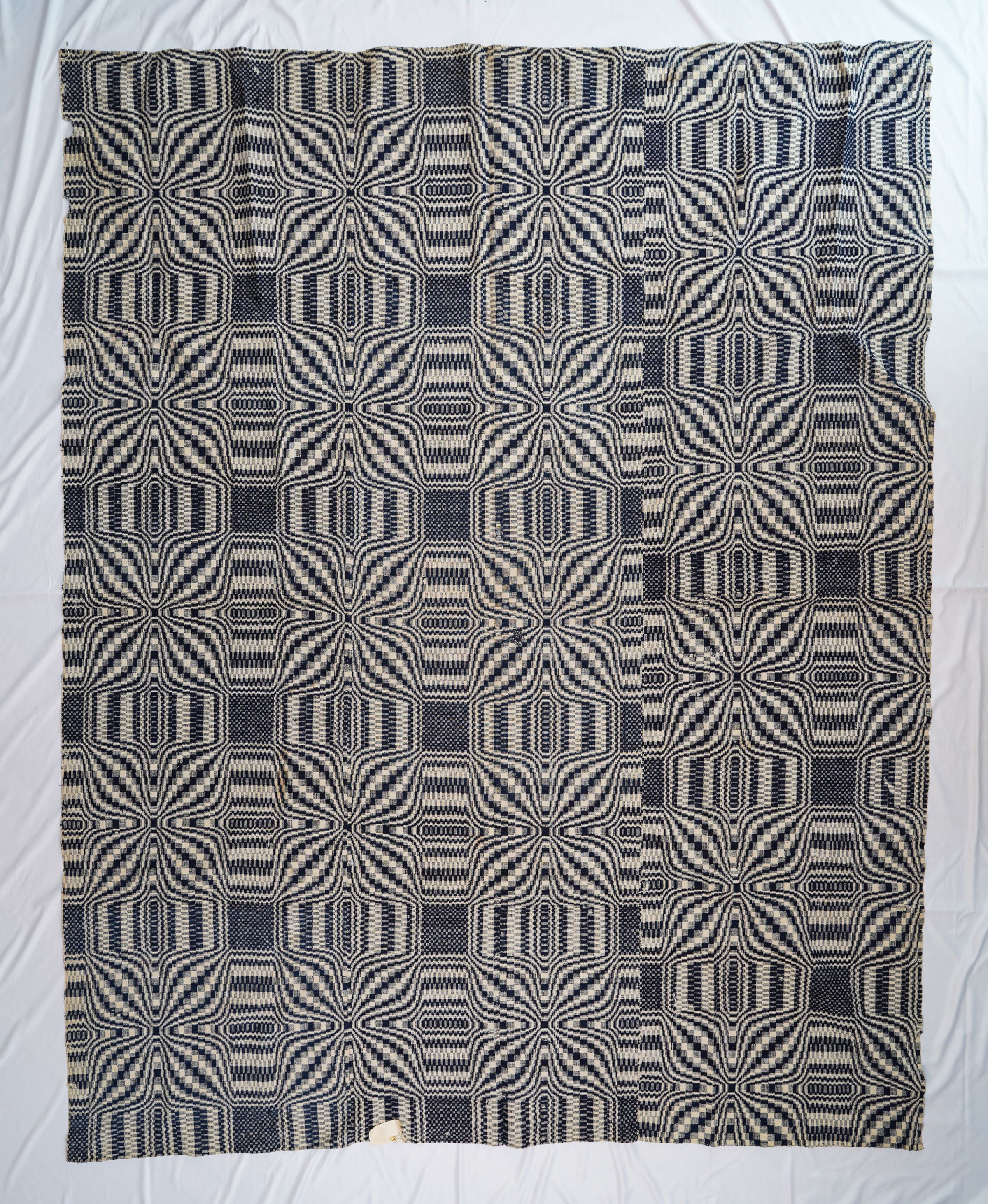 Navy and natural geometric coverlet; two panels joined. Summer and winter weave. Natural cotton tabby and navy wool pattern weft.