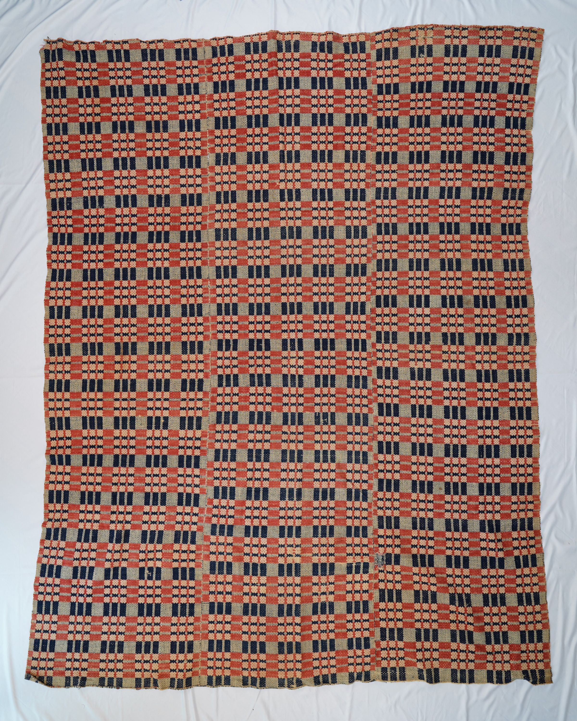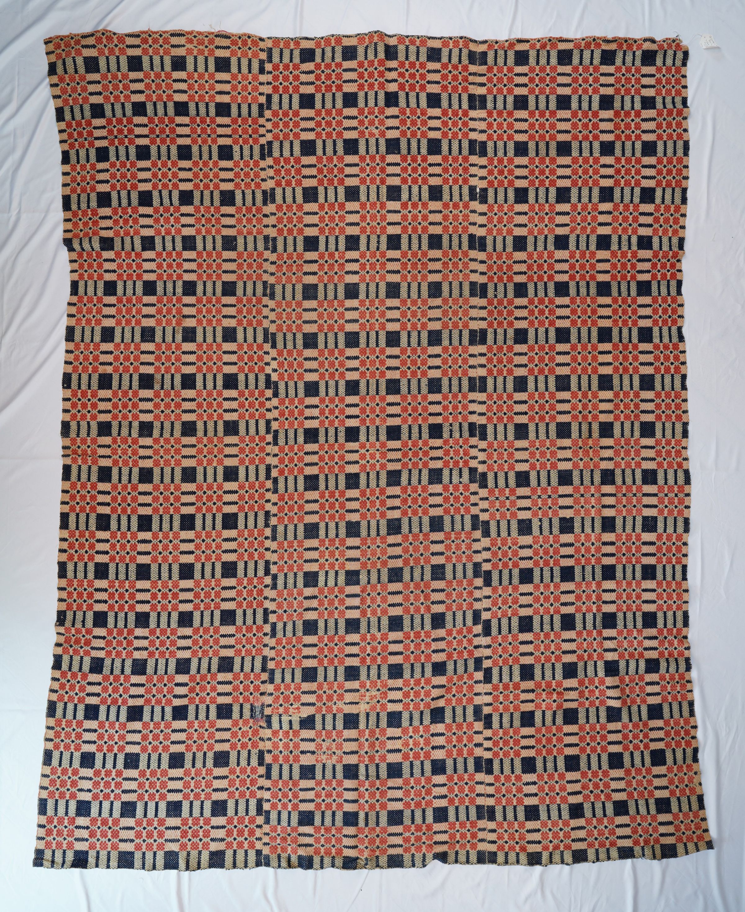 Navy, red and natural overshot coverlet; three panels joined