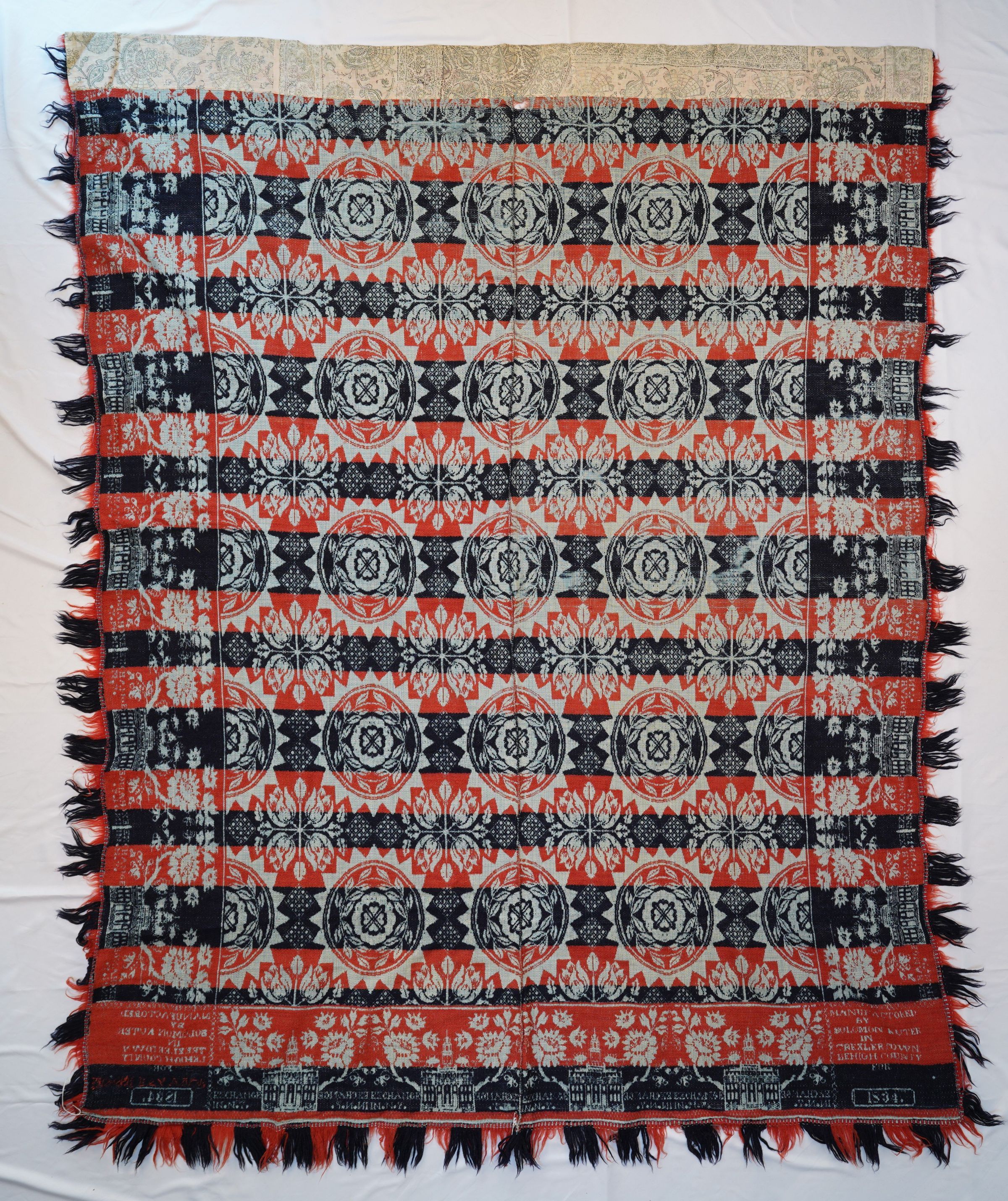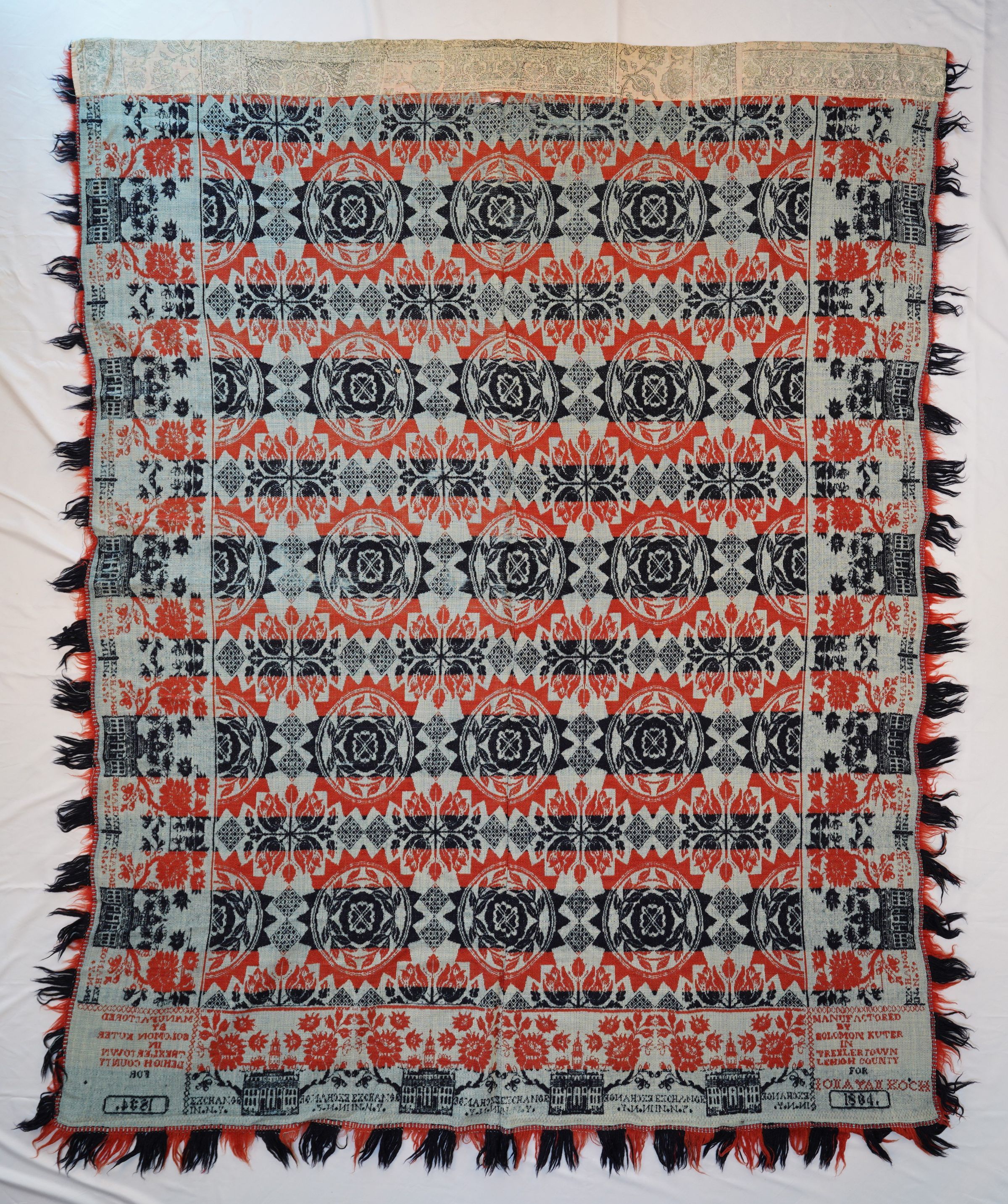 Natural, navy, blue, and red figured tied beiderwand coverlet; two panels joined by a center seam. Border and fringe on three sides.Collection