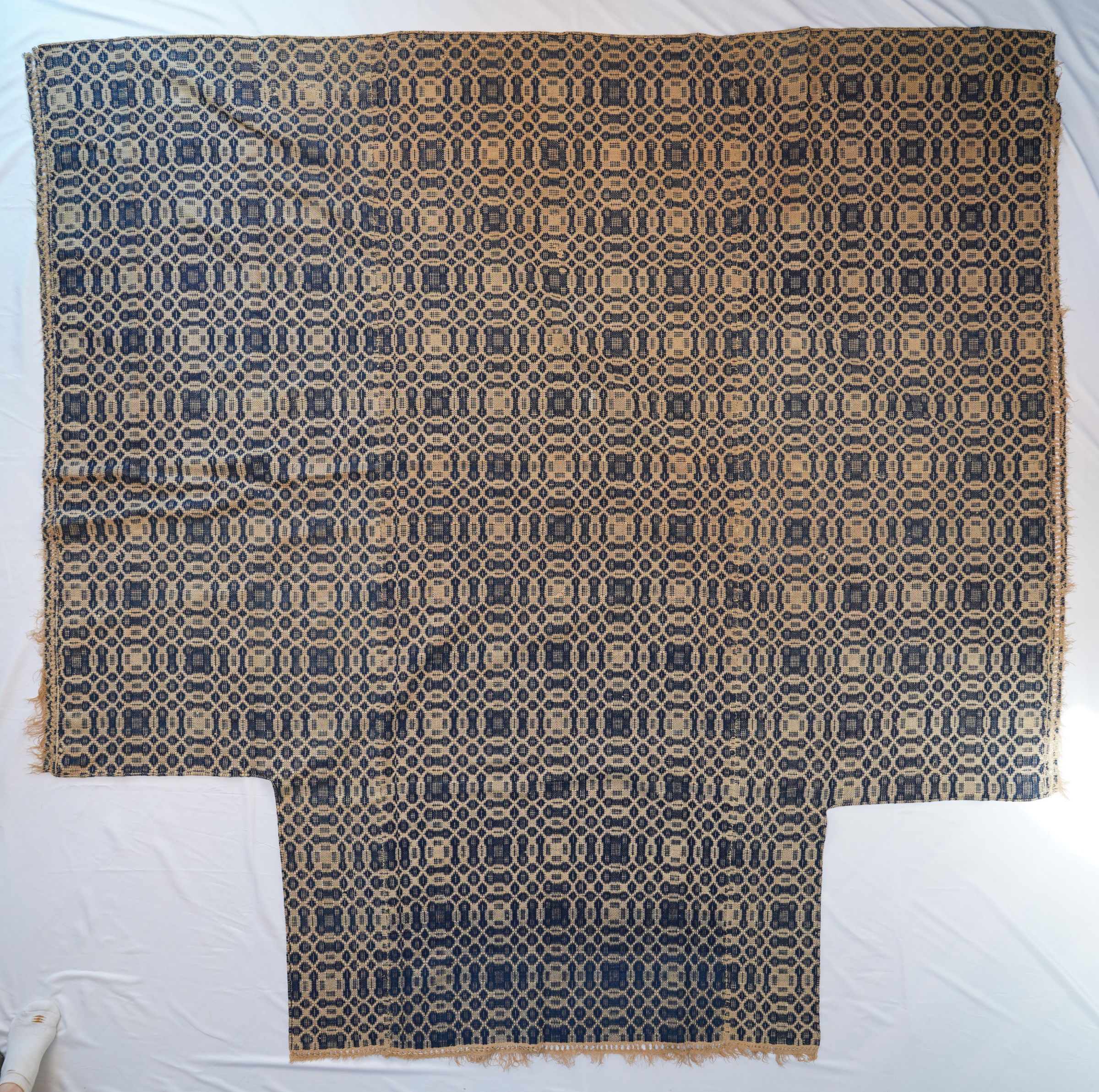 Natural and navy geometric overshot coverlet; three joined panels. No border. Fringe on three sides. Missing two corners