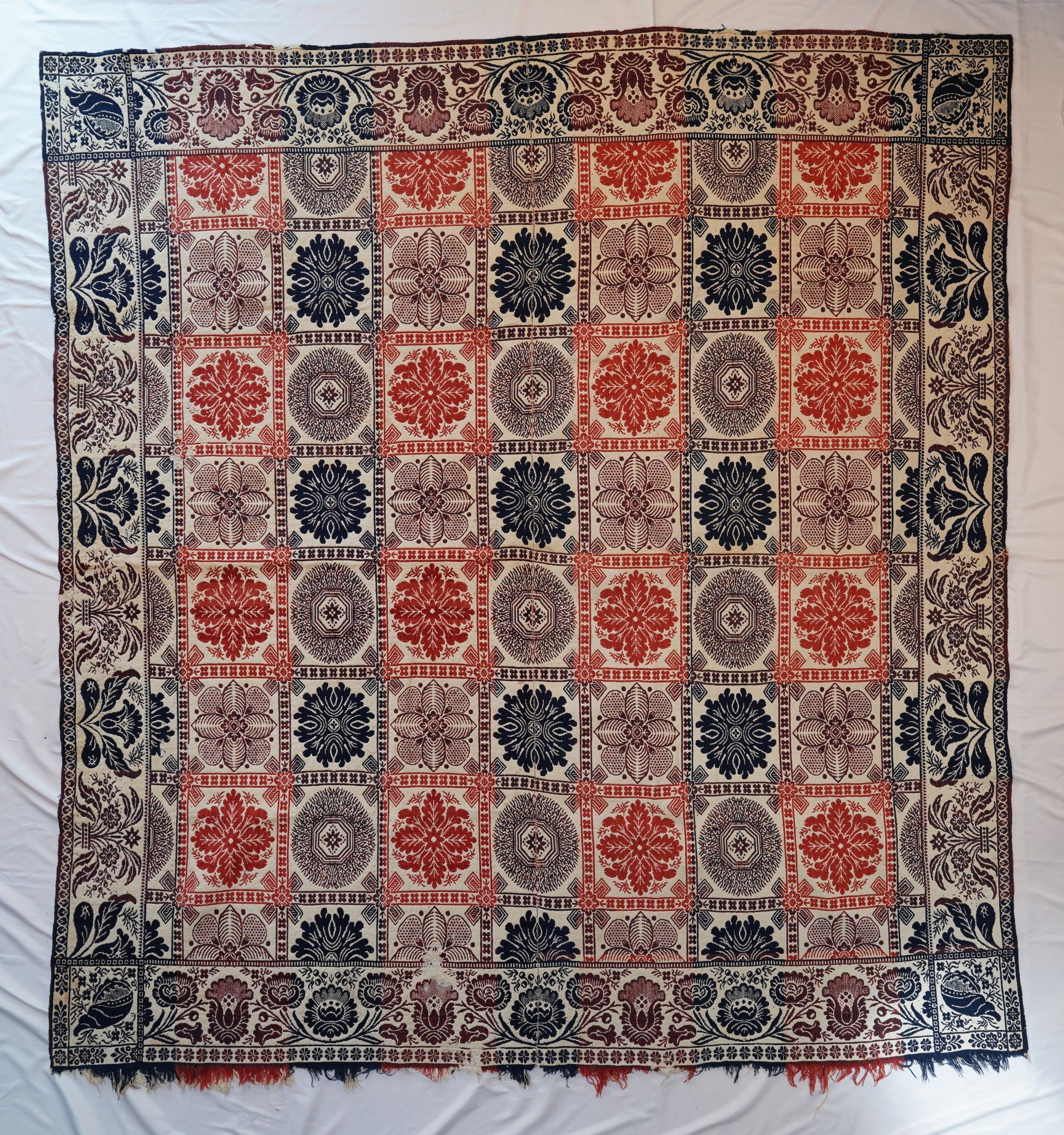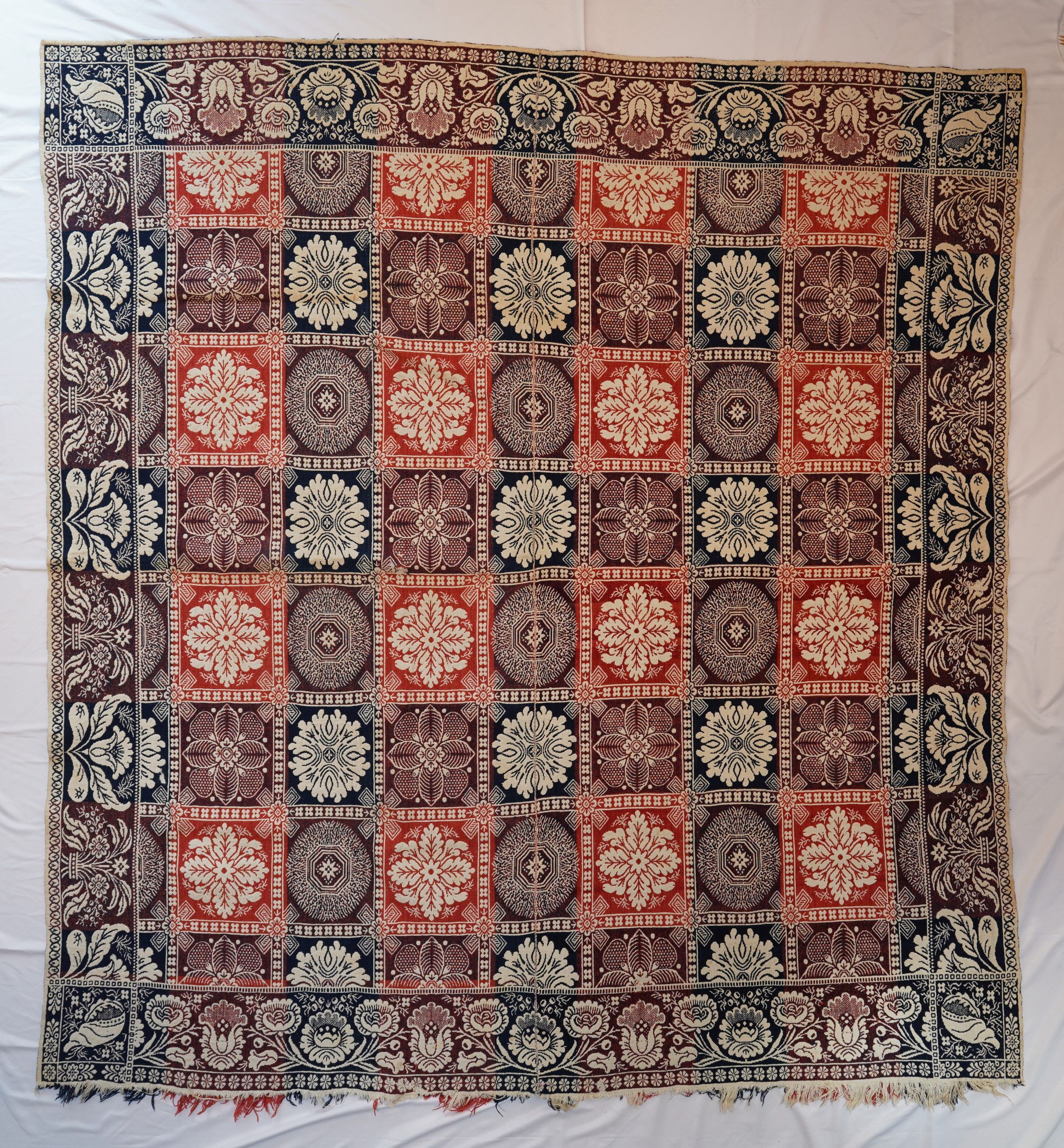 Natural, navy, purple, and red figured double weaver coverlet; two panels joined by a center seam. Border on four sides, fringe on bottom.Collection