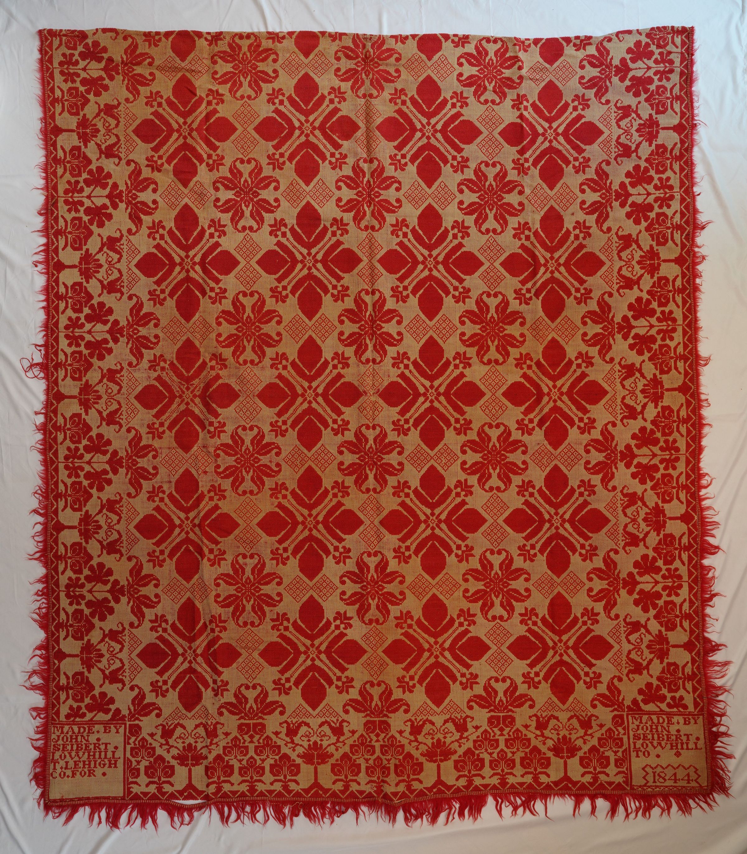 Natural and red figured double weave coverlet; two panels joined a center seam. Border and fringe on three sides.