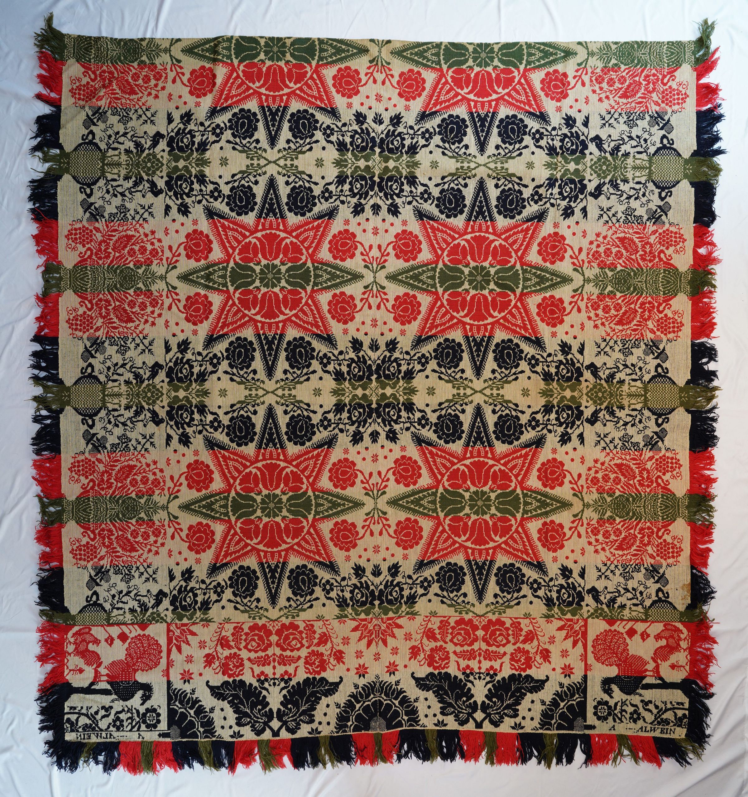 Natural, navy, red, and green figured tied beiderwand coverlet; two panels joined by a center seam. Border and fringe on three sides.Collection