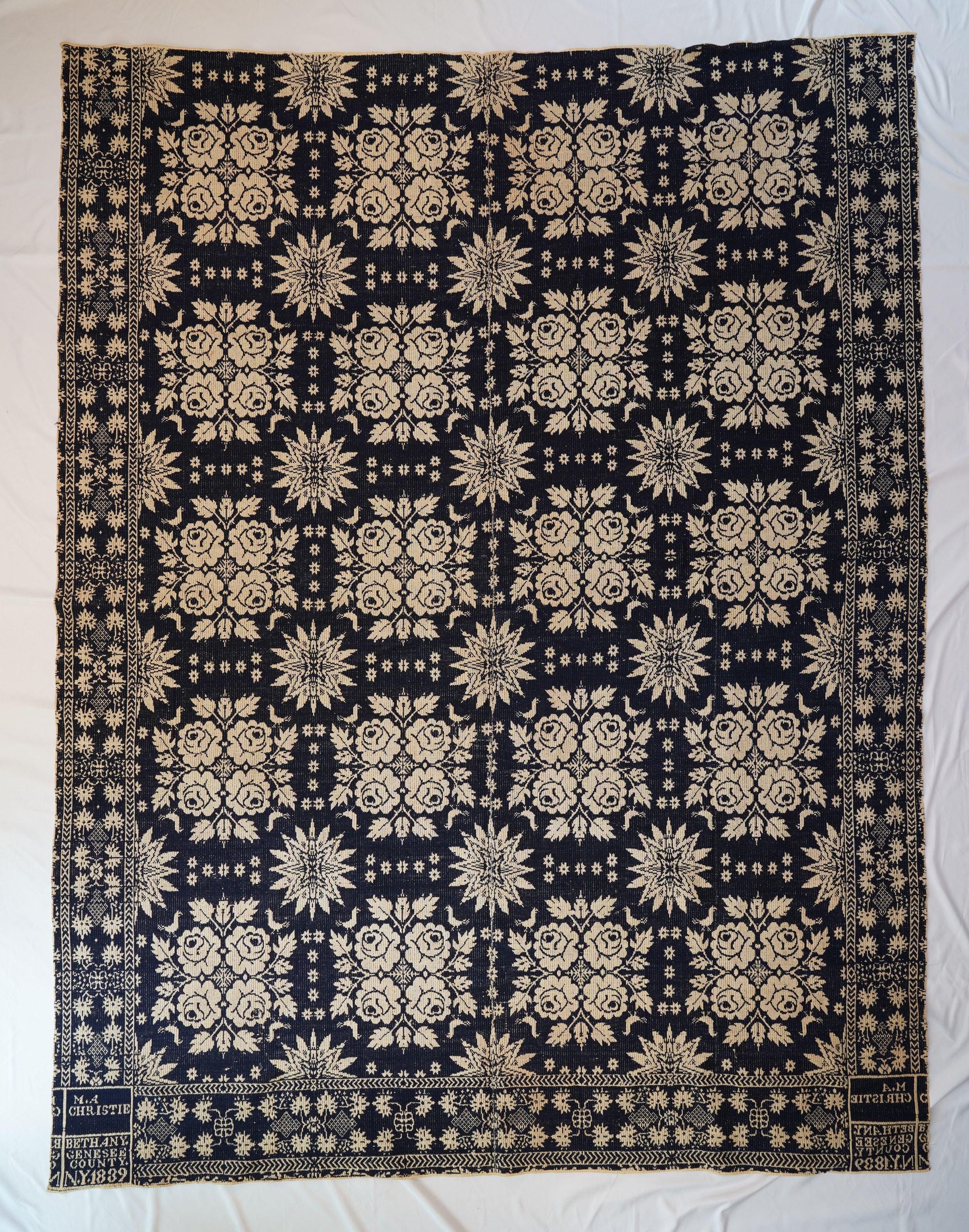 Natural and navy figured double weave coverlet; two panels joined by a center seam. Border on three sides, no fringe.Collection