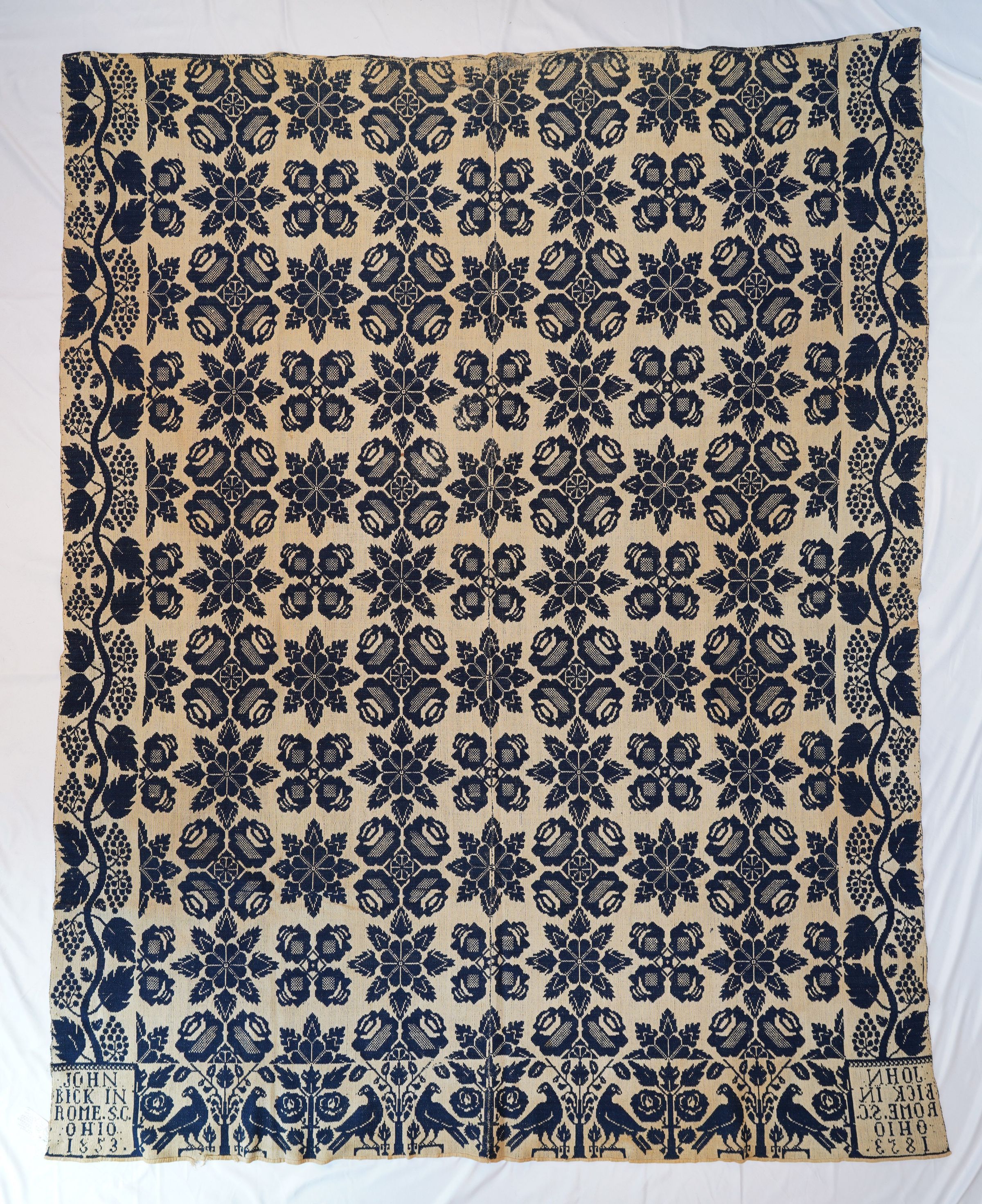 Navy and natural figured tied Beiderand coverlet; two panels joined. Double flowers and snowflakes centerfield pattern with distelfink border on bottom and grapevine border on sides. No fringe.Collection