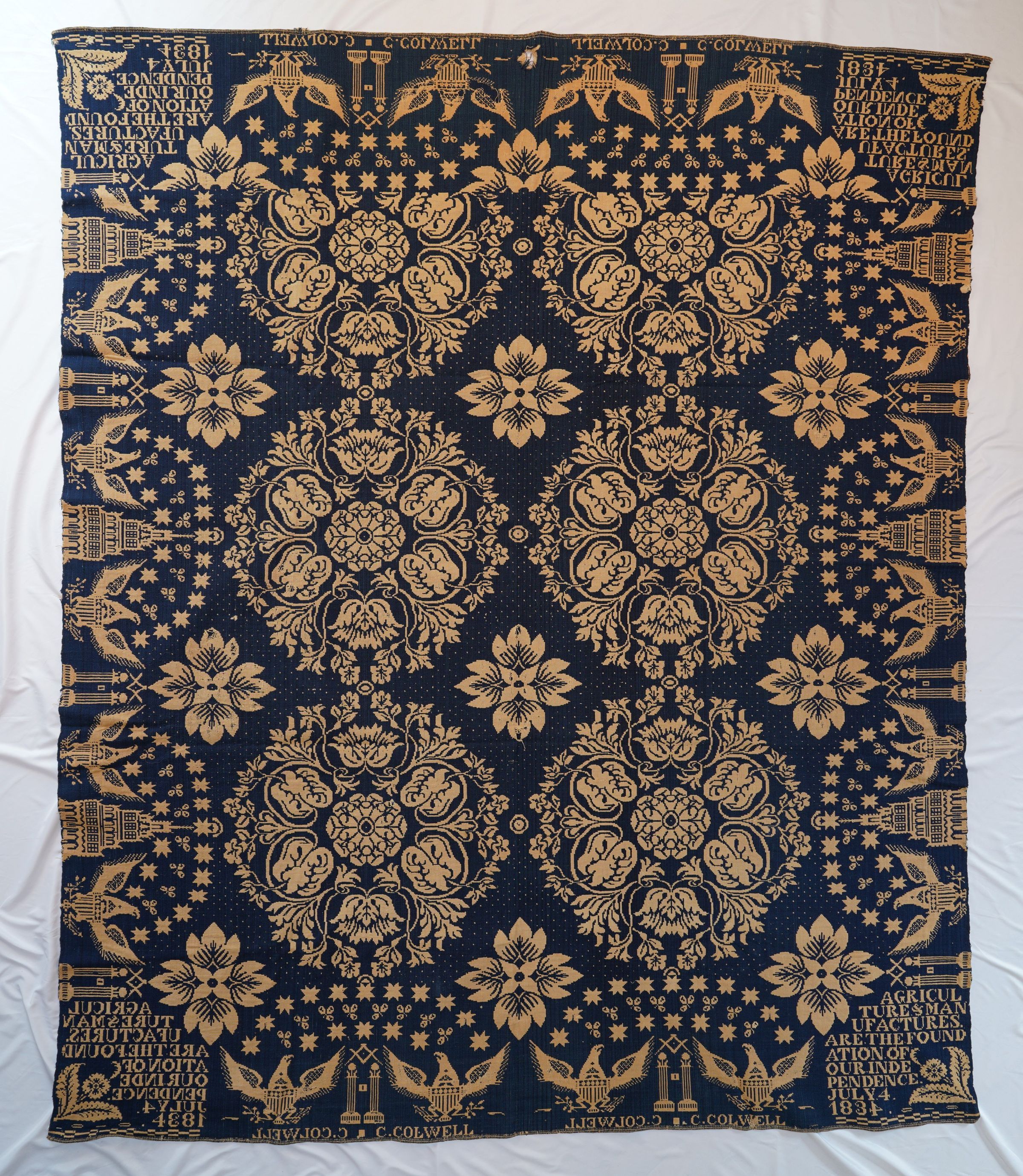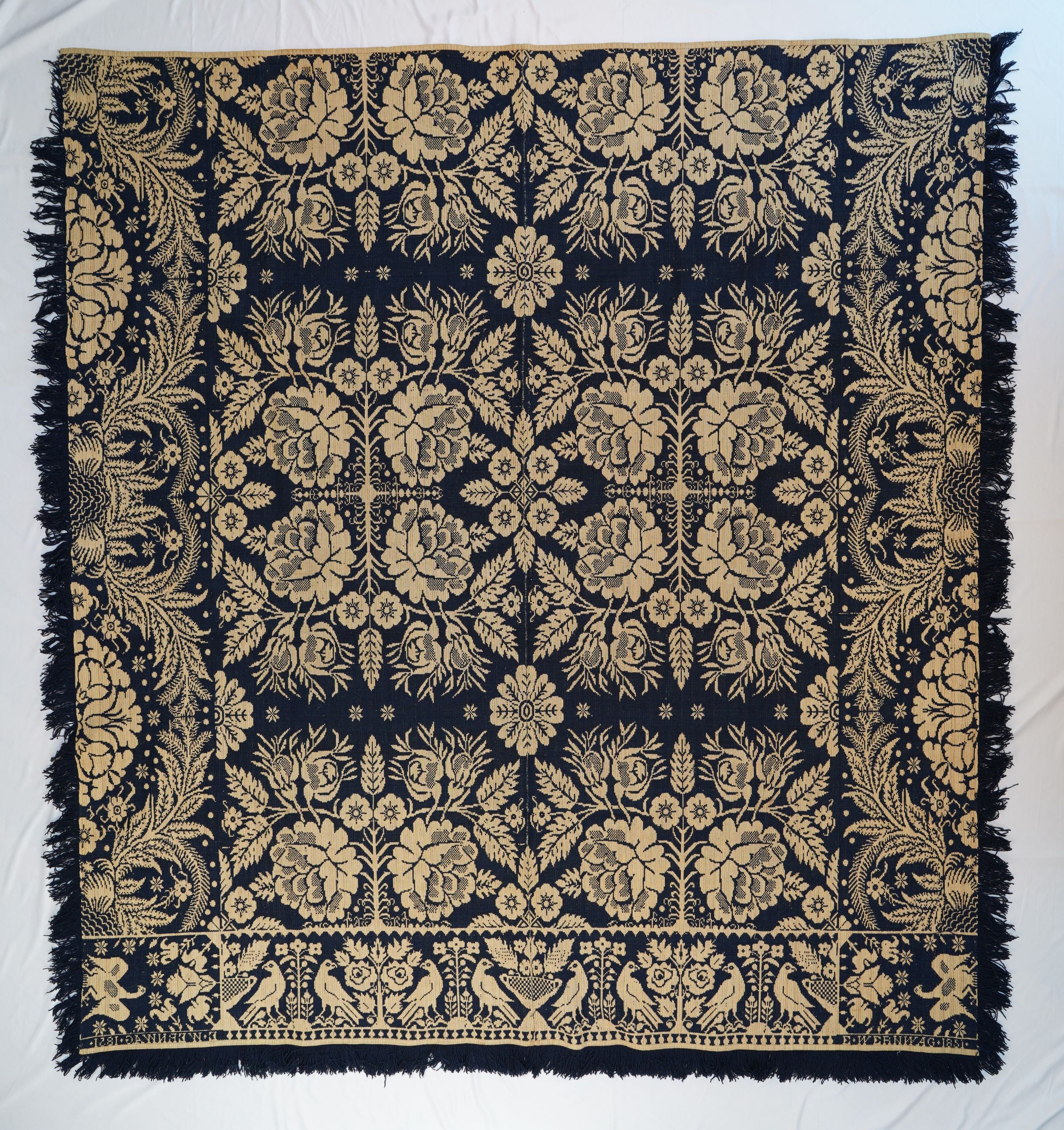 **This entry has photos of two different coverlets** Natural and navy figured double weave coverlet; seamless. Border on four sides, no fringe.Collection