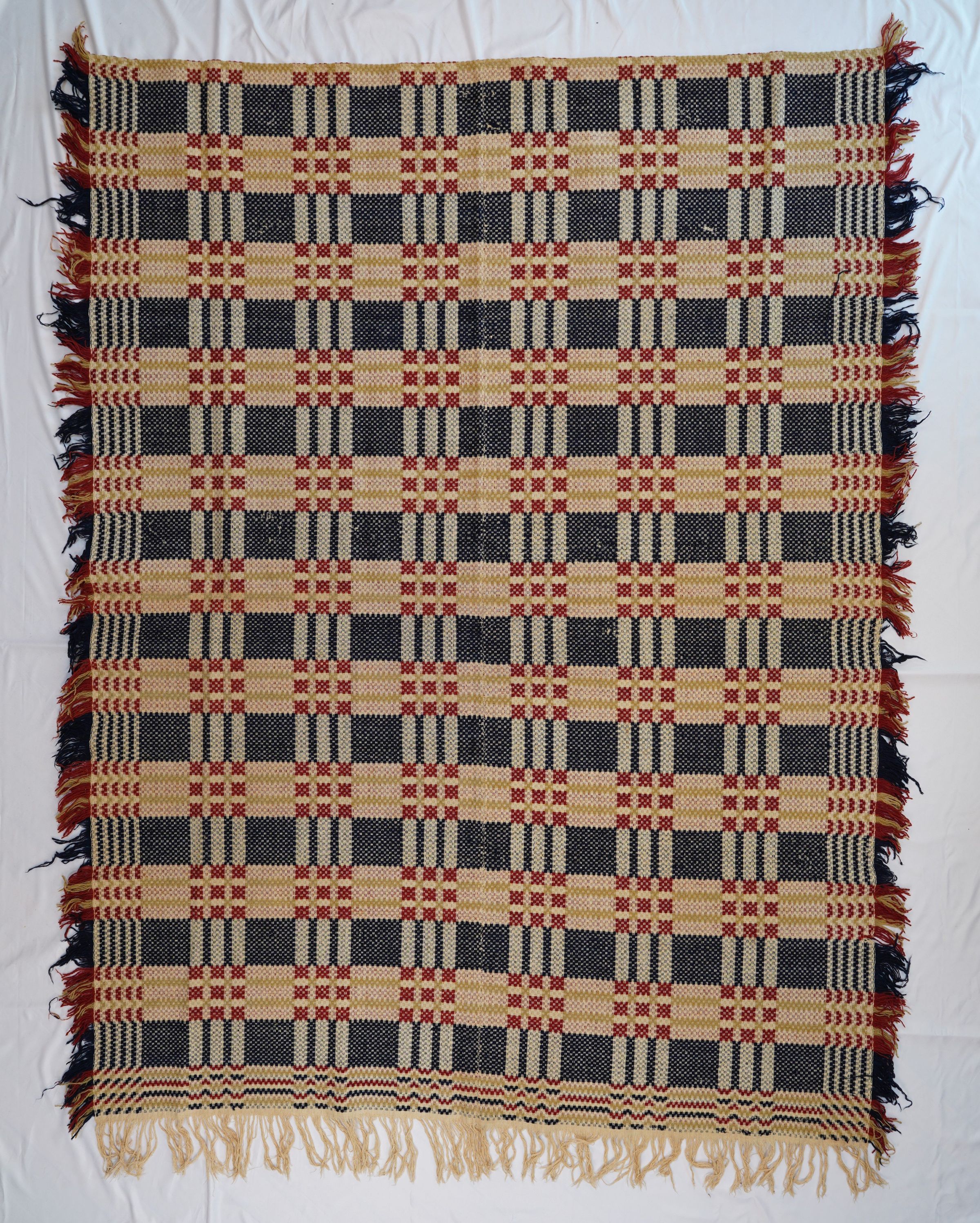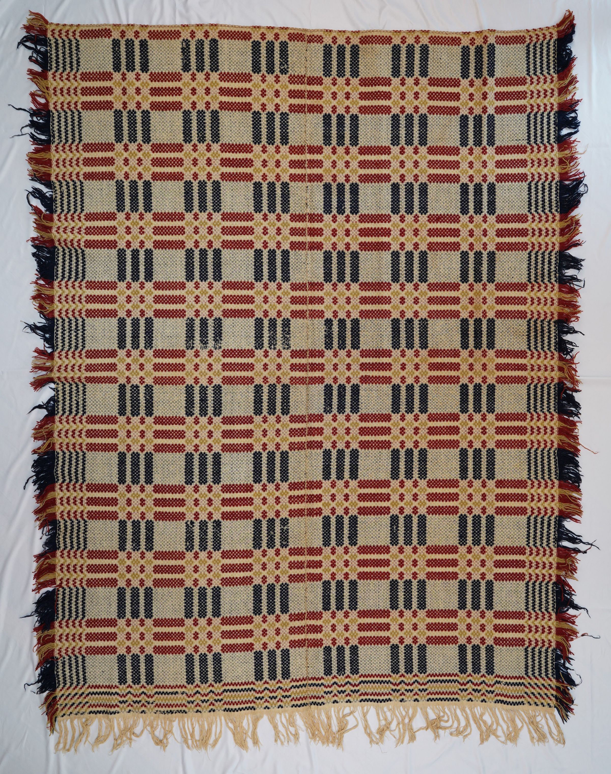 Navy, red, yellow, and natural overshot coverlet; two panels joined. Self fringe on three sides.