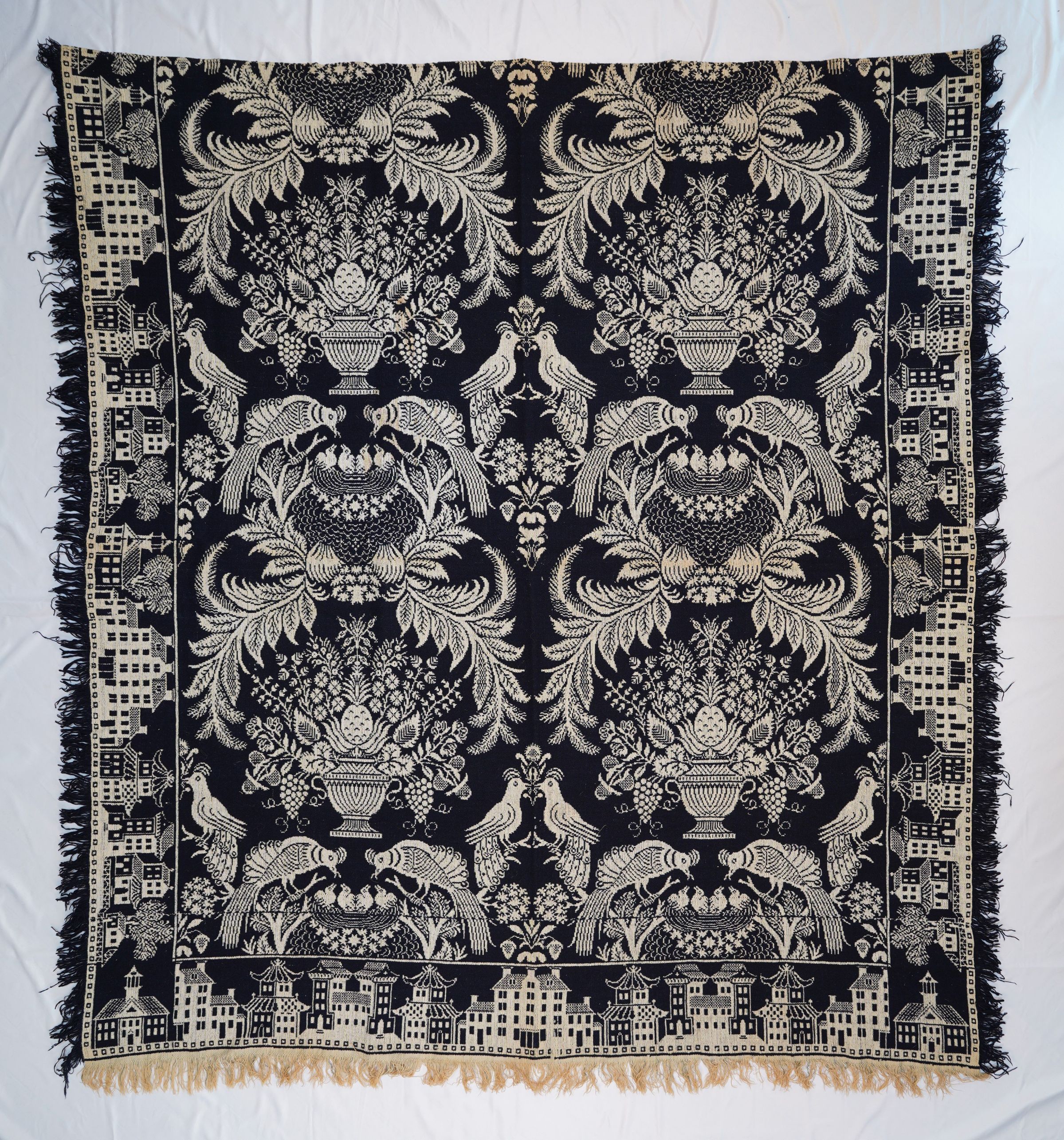 Navy and natural figured tied Beiderwand coverlet; seamless. Birds feeding young centerfield pattern, pagoda border on three sides, courthouse corner blocks. Self-fringe on three sides.Collection