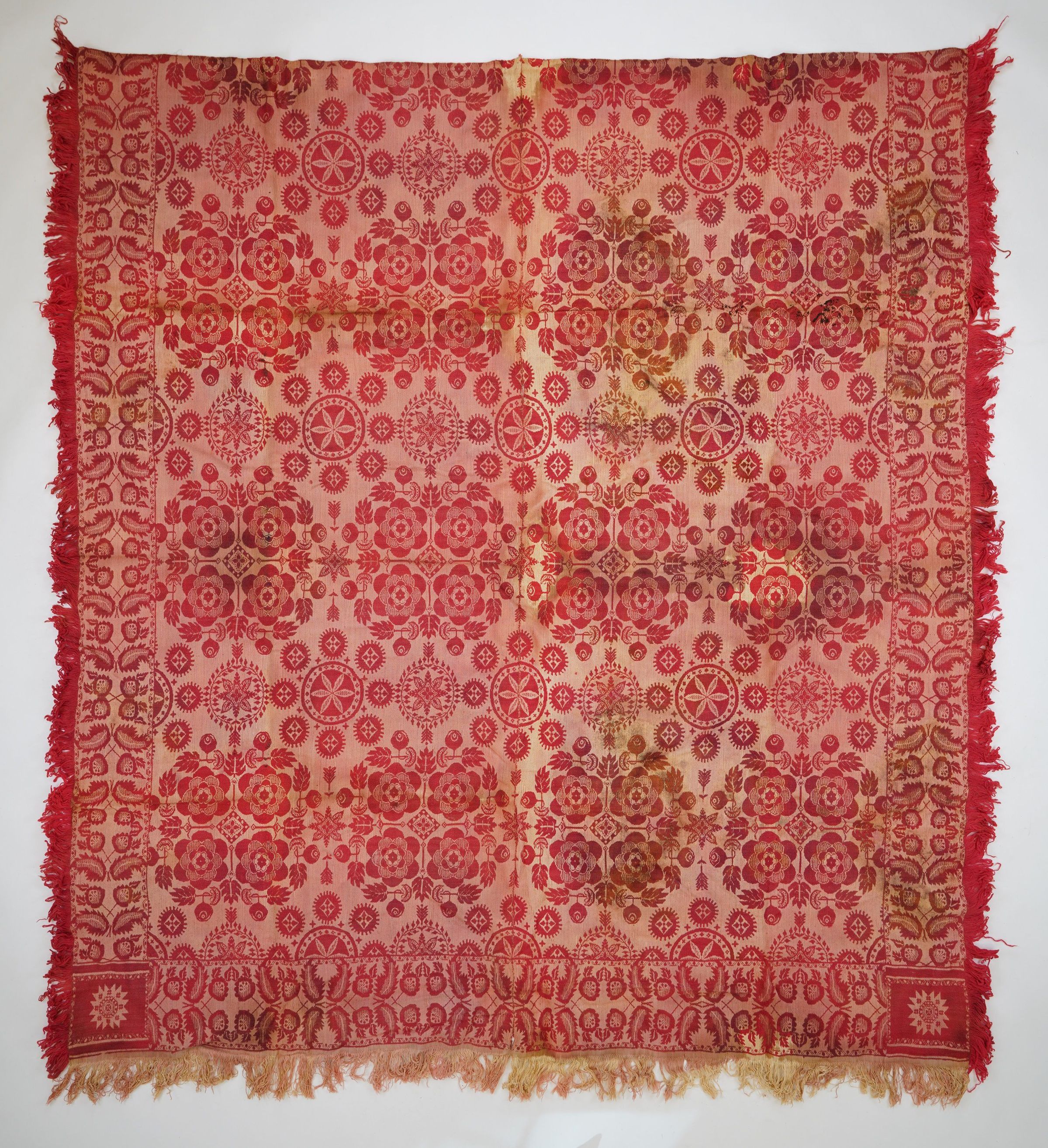 Red and natural figured tied Beidwerwand coverlet; two panels joined by center seam, self-fringe on three sides, feather border on three sides, rosette corner block, unsigned, floral medallions and hex signs in centerfield.Collection