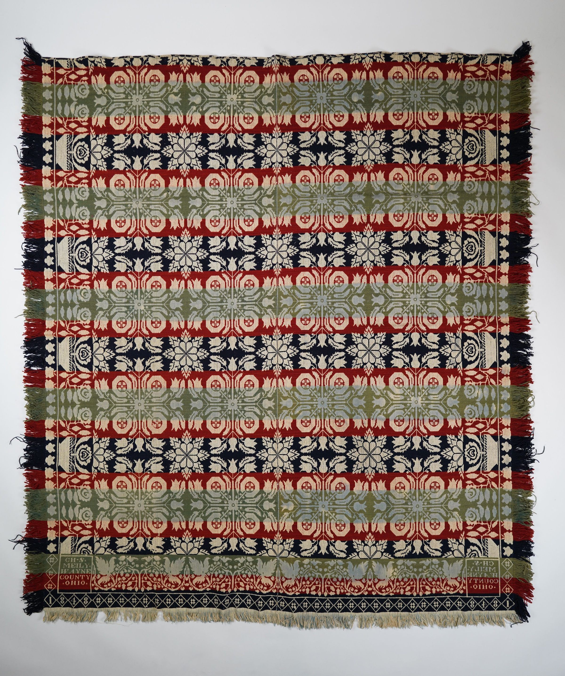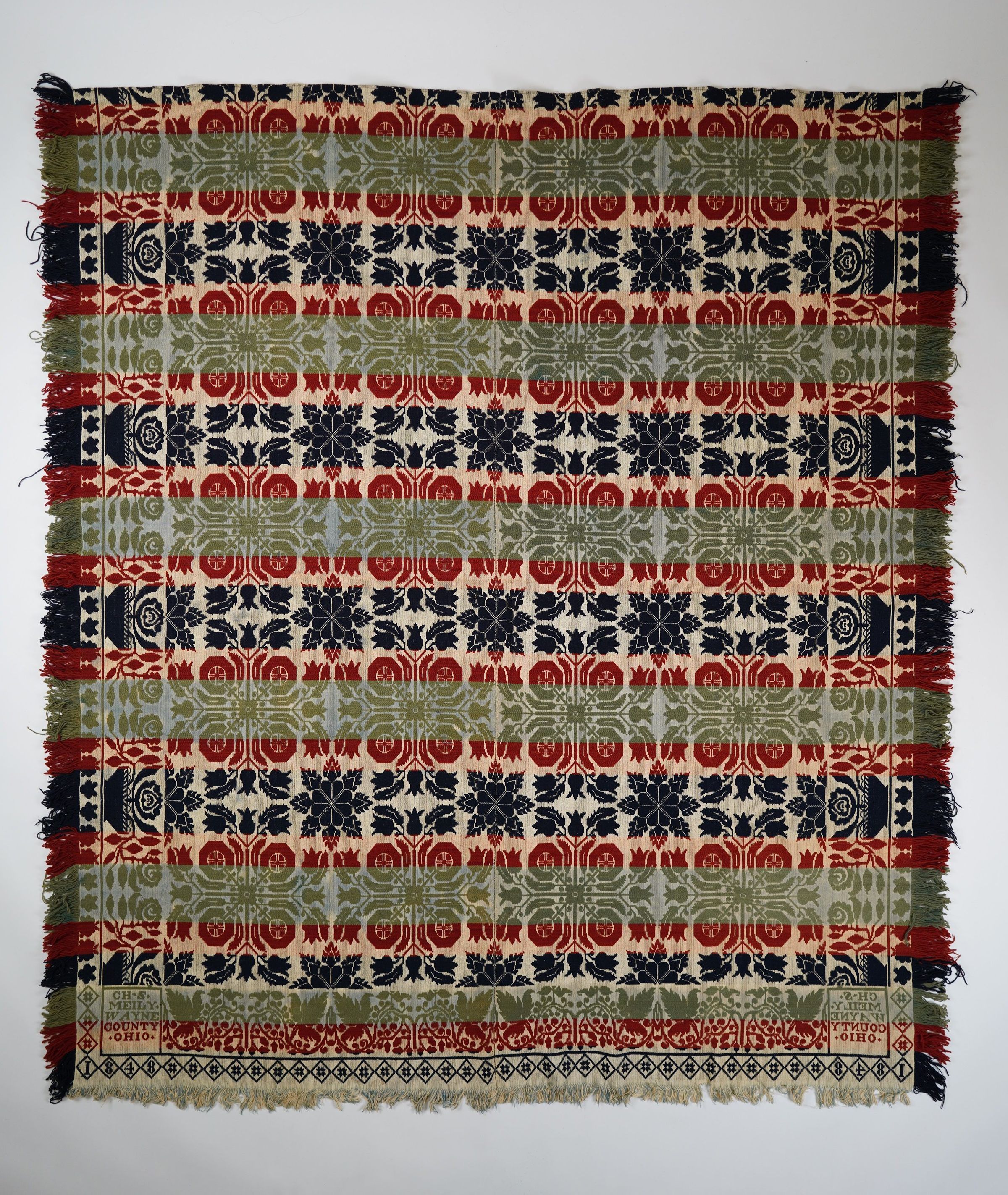 Red, blue, and green figured Beiderwand coverlet; two panels joined by a center seam; grape leaf border on bottom; rose border on sides; self-fringe on three sides; floral centerfield motif repeats 4 times.Collection