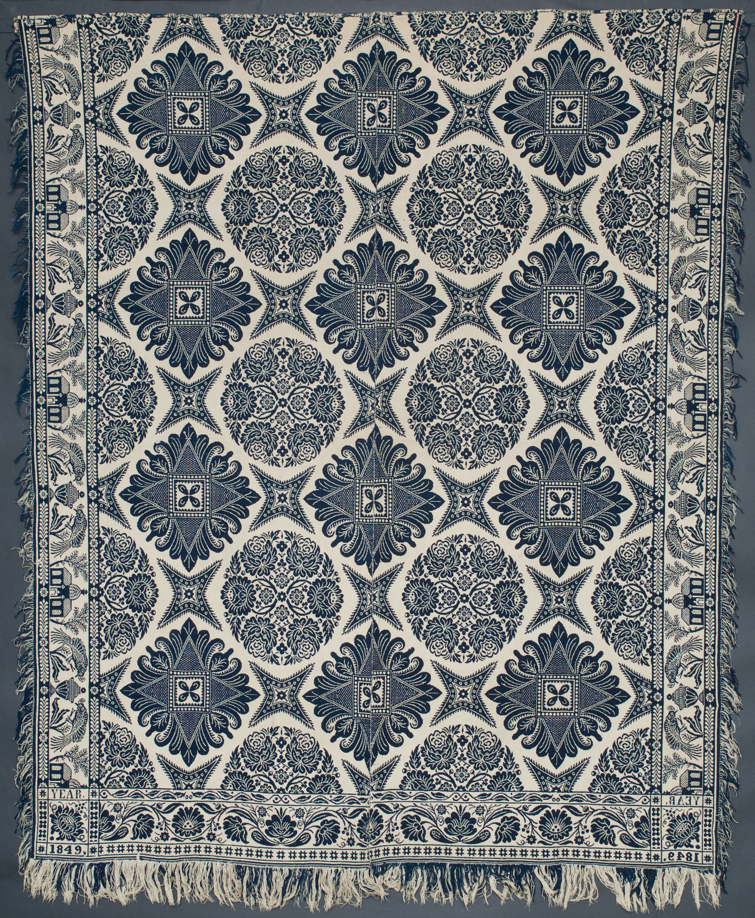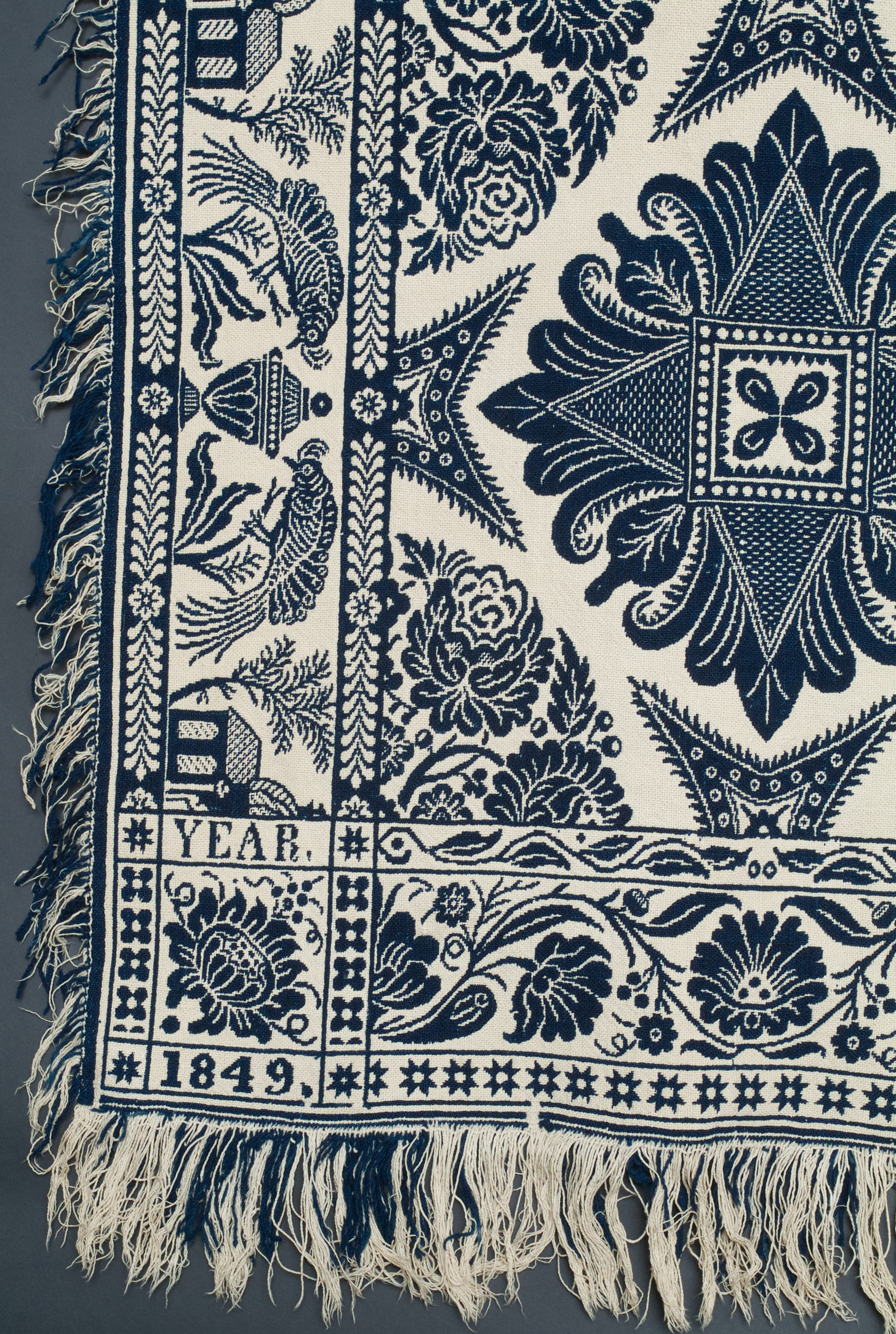 Double weave; navy, natural; two loom widths joined; border and fringe on 3 sides; border of urns, domed eastern buildings, and strange peacock like birds (length sides); on bottom edge is border of flowers; centerfield has cabbage, roses, and other designs; 2 corner blocksCollection