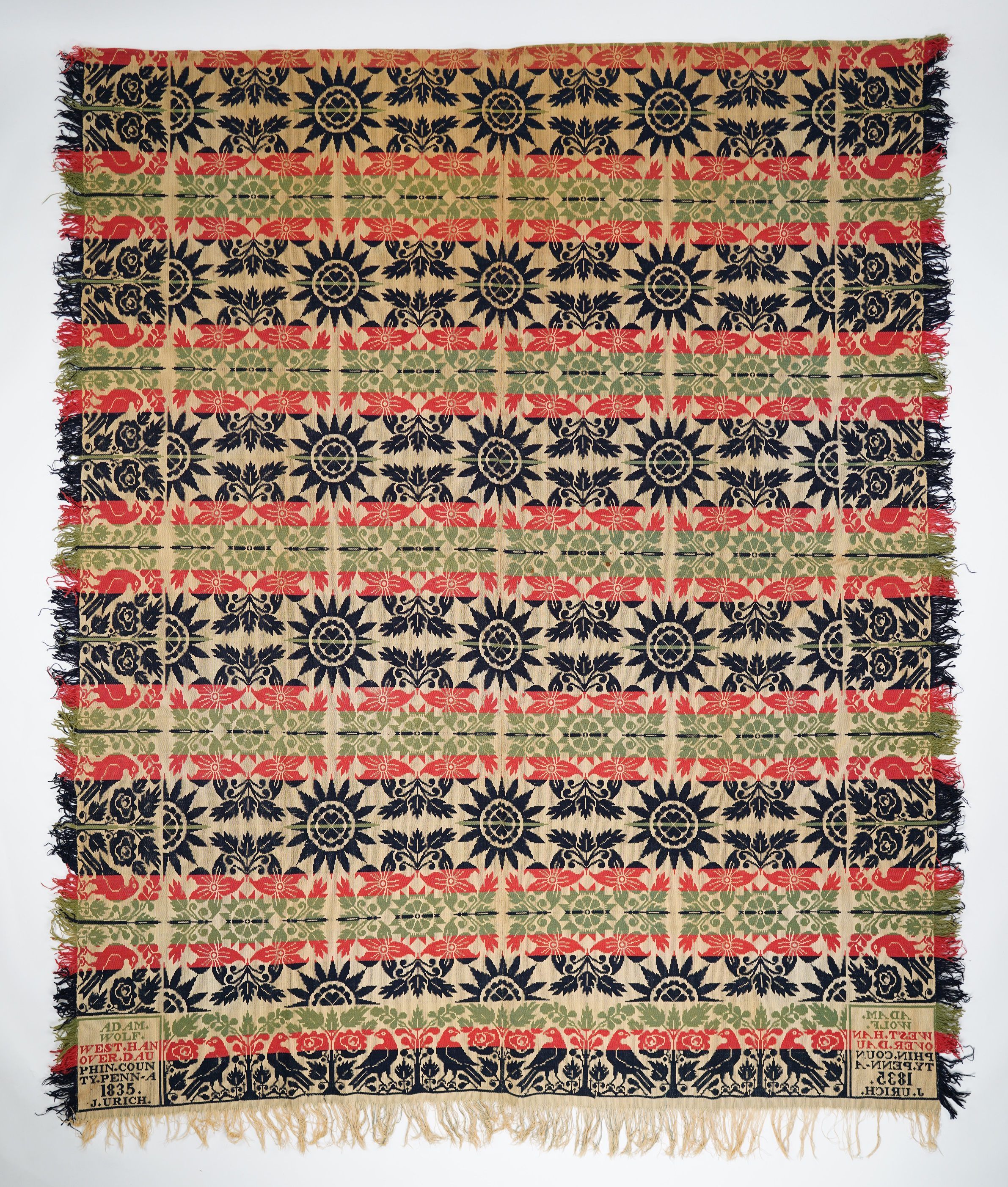 Navy, red, green figured tied Beiderwand coverlet; two panels joined by a center seam; self-fringe and distelfink border on three sides; Lilies of France with sunburst centerfield pattern.Collection