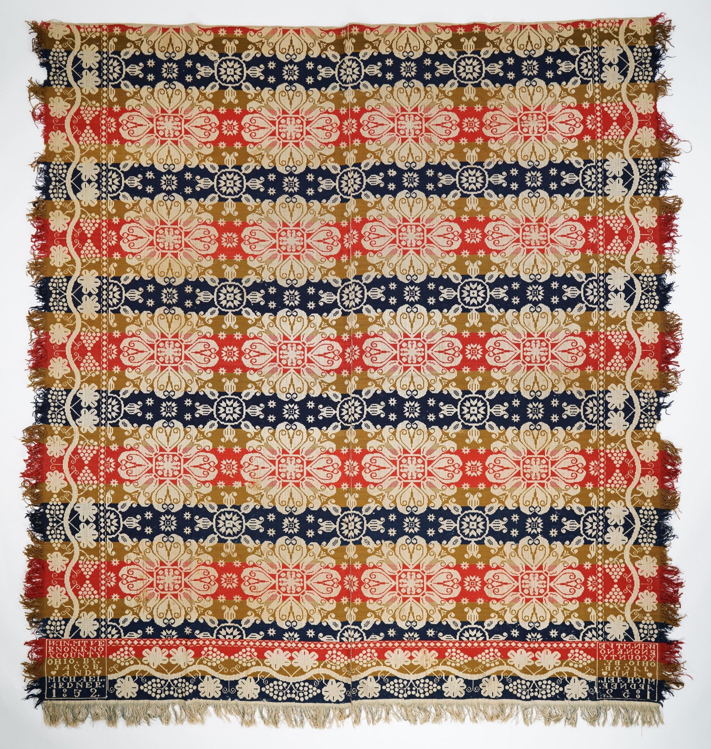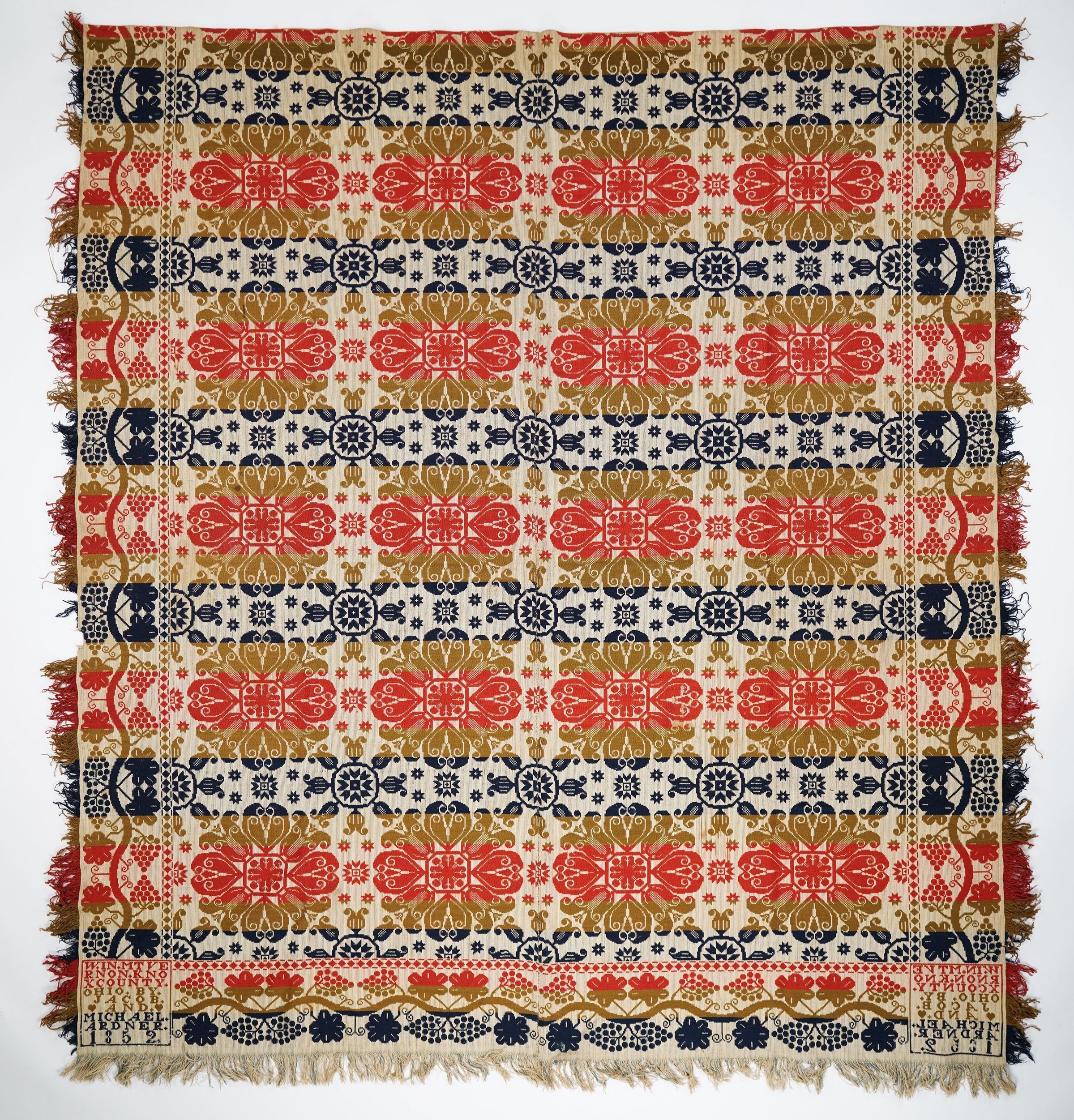 Red, navy, olive figured Tied Beiderwand coverlet; two panels joined by a center seam; self-fringe and grapevine border on three sides; heart and tulip medallion centerfield pattern with stars and smaller tulip medallions.Collection