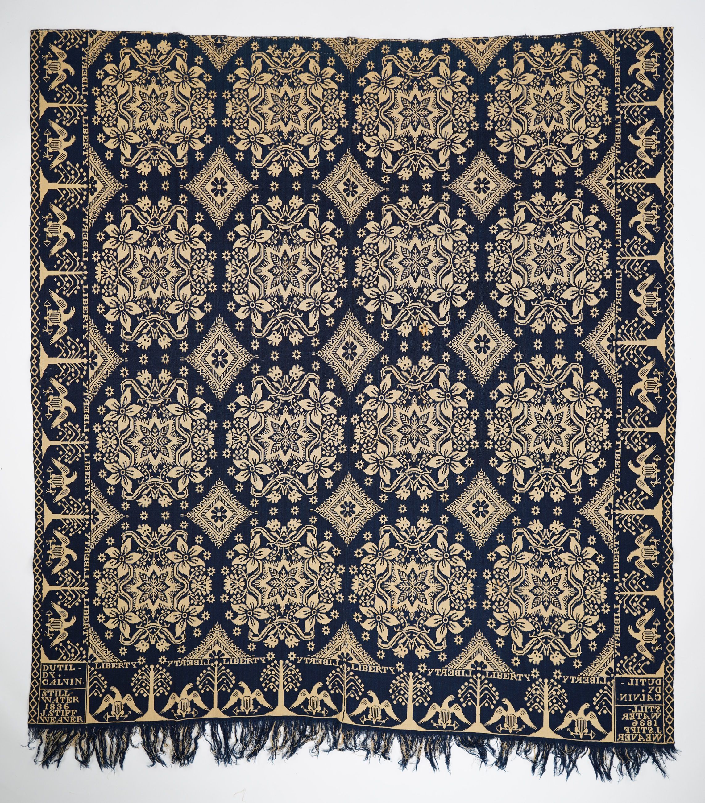 Navy and natural figured double weave coverlet; two panels joined by a center seam; self-fringe on bottom edge only; shielded eagle border on three sides; lilies of france centerfield pattern with diamonds.Collection