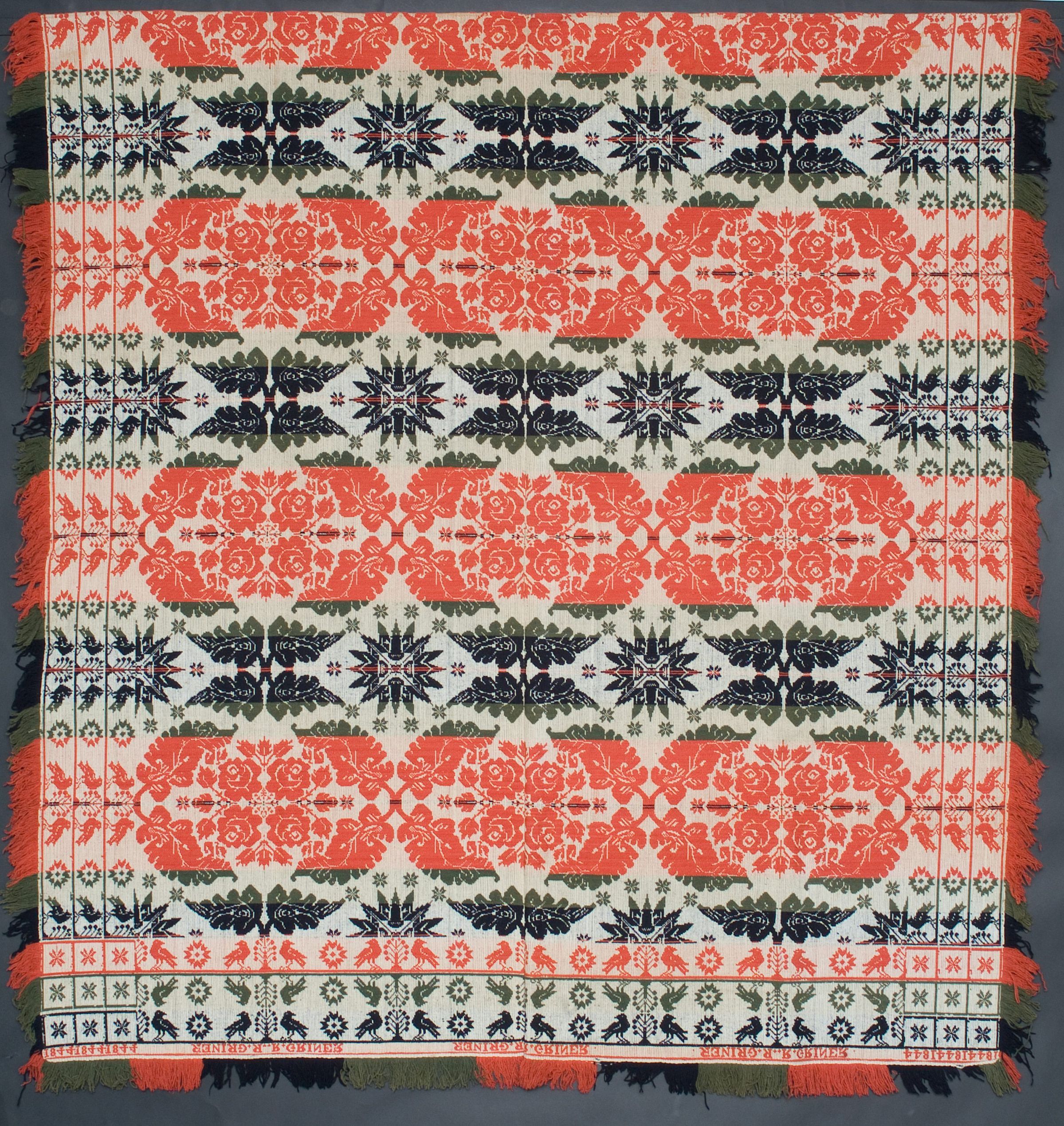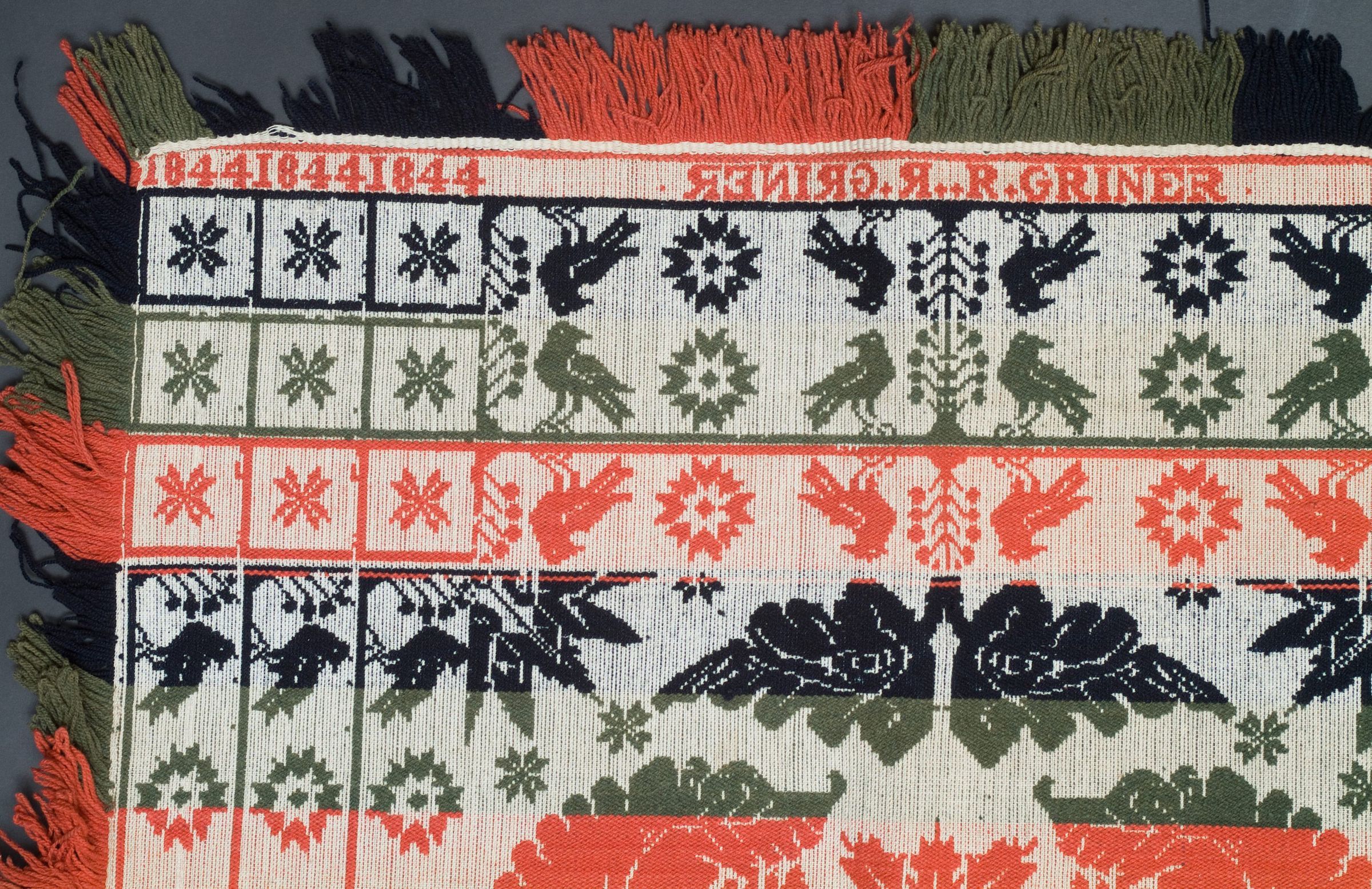 Beiderwand; pink, green, natural, navy; two loom widths joined; fringe and border on 3 sides; border of stars and distelfinks; corner blocks have windmill like flowers, bottom strip has inscription; centerfield has rosette clusters, stars, and feathers or leavesCollection